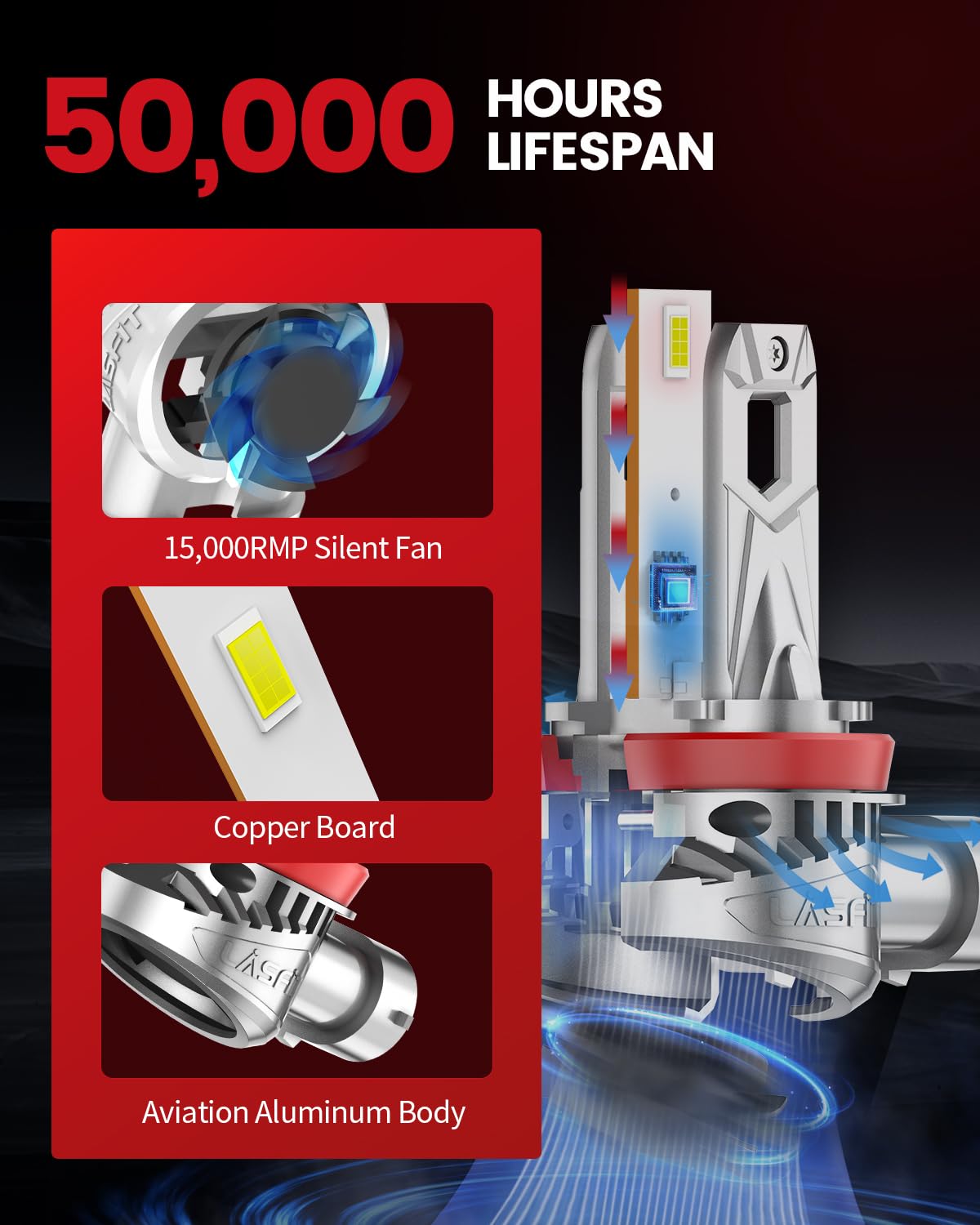 Long Lifespan: Offer a lifespan of 50,000 hours, thanks to an advanced heat sink design and performance-enhancing driver. Rigorously tested for durability and water resistance, these bulbs guarantee long-lasting performance.