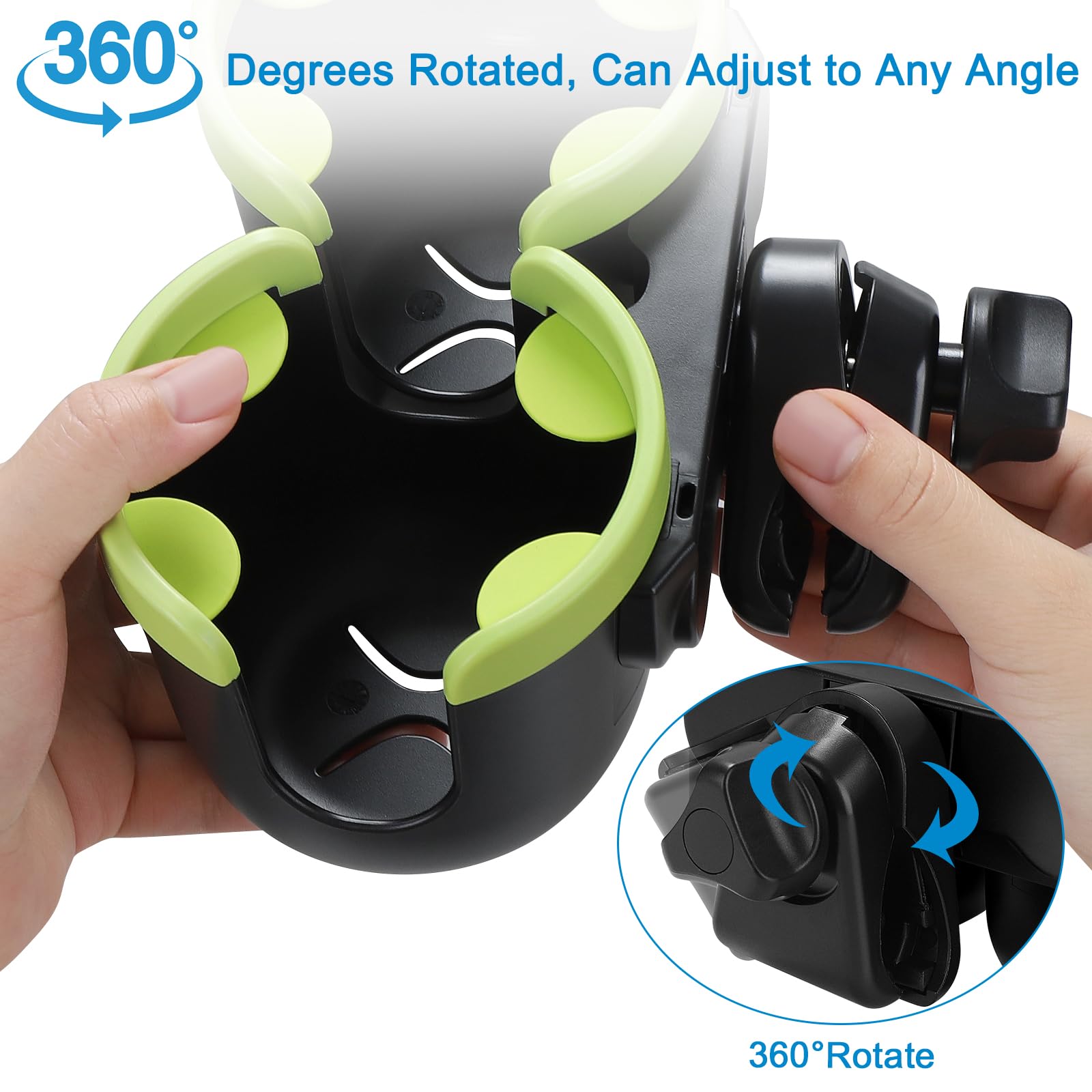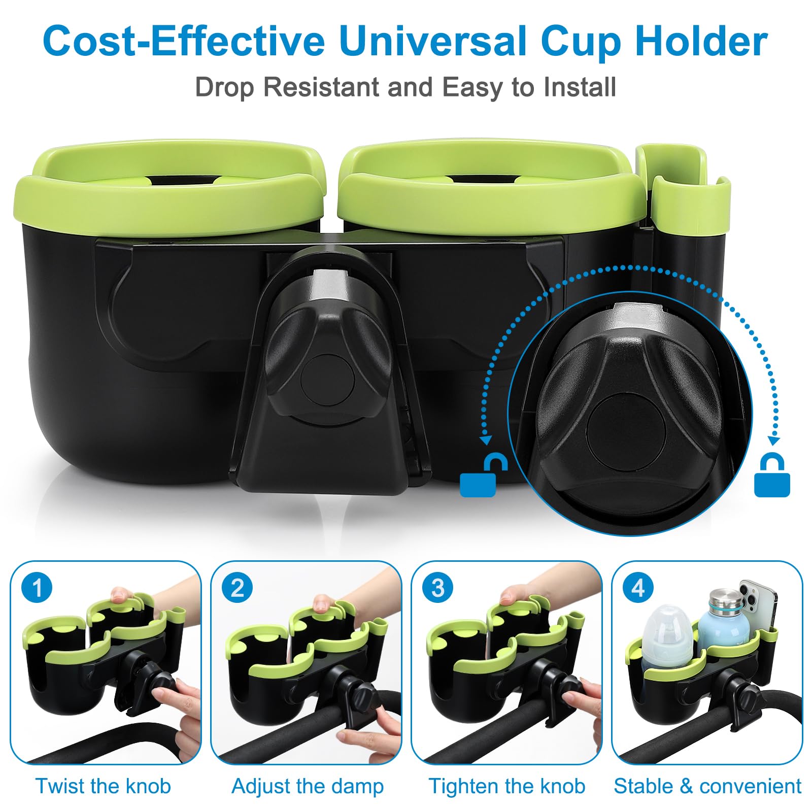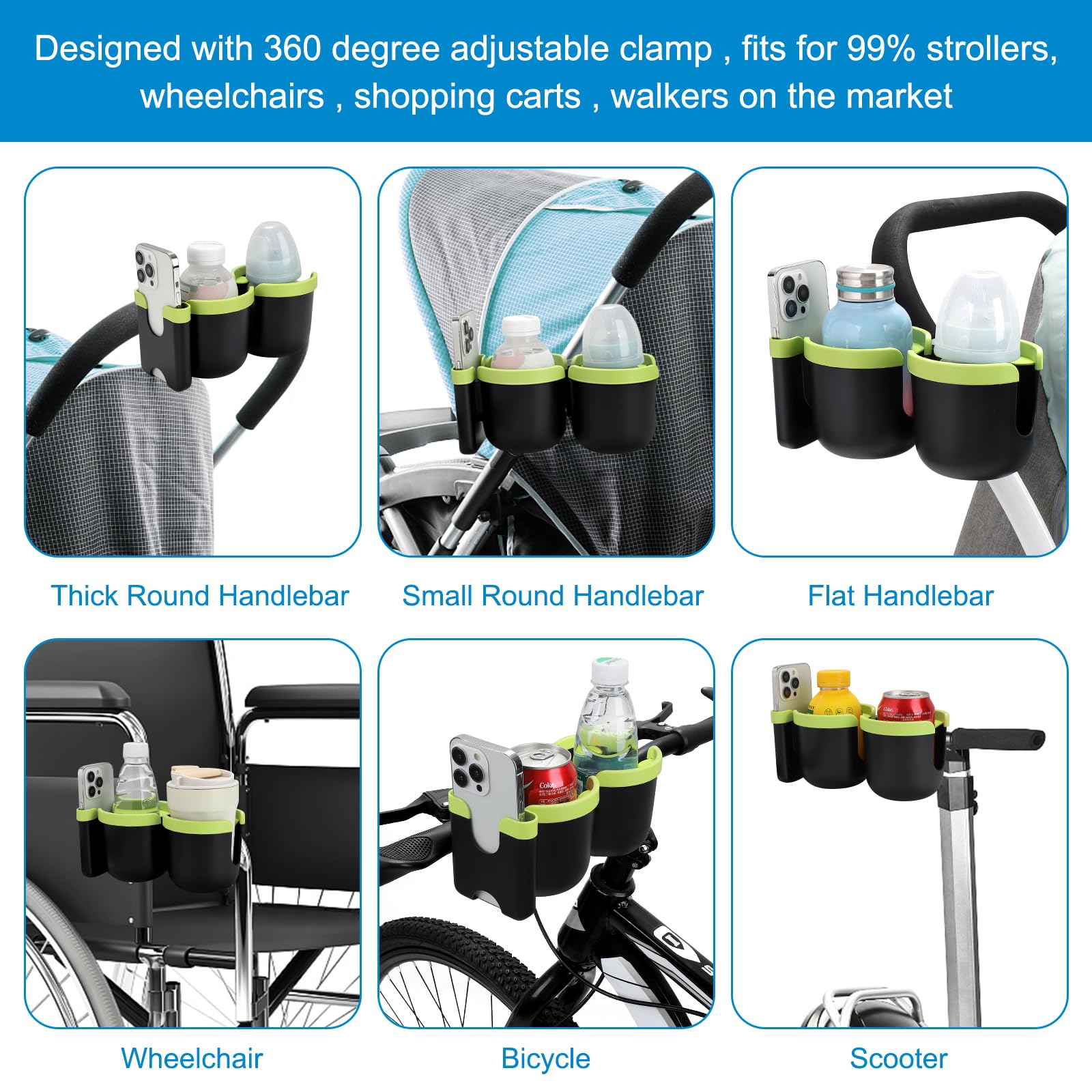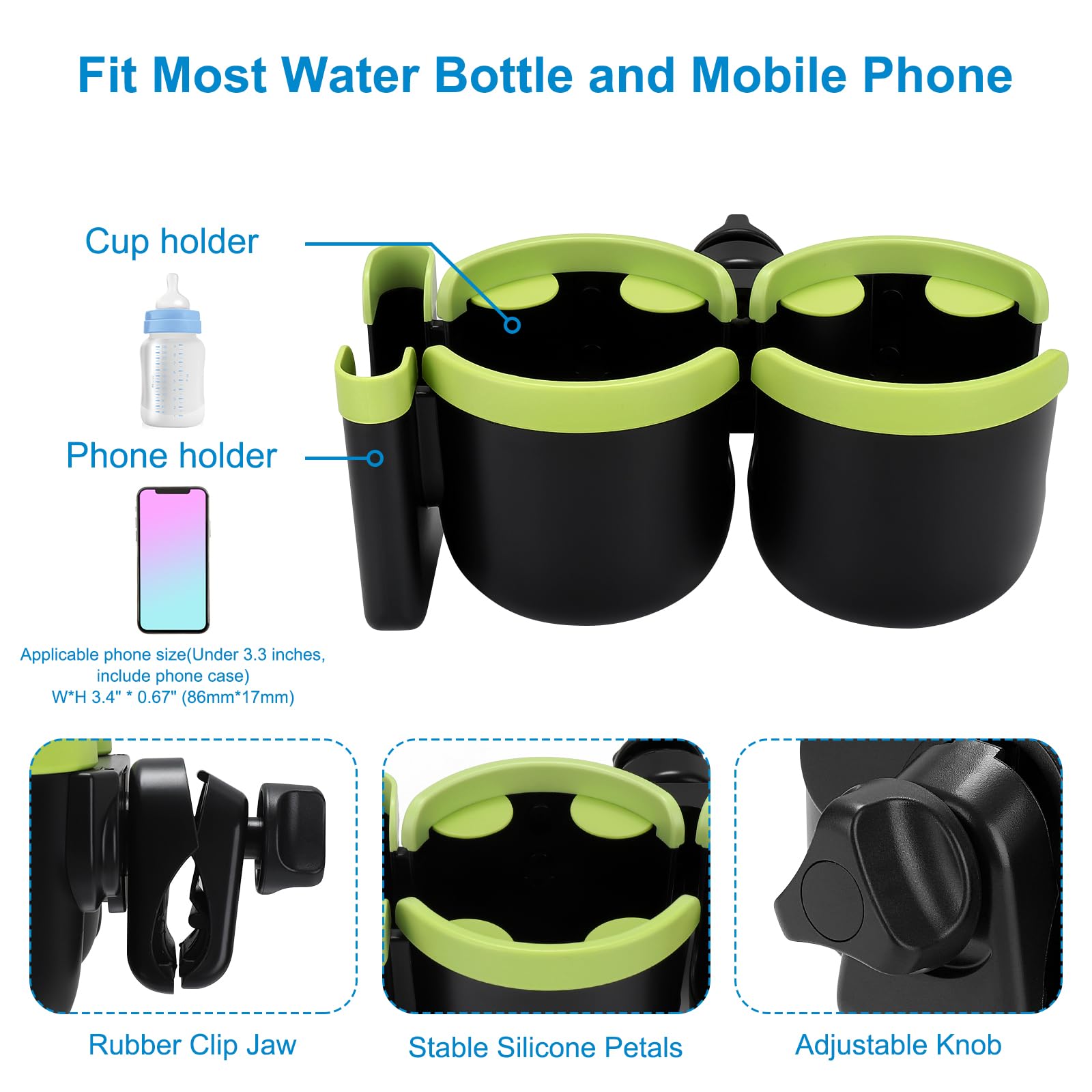 Wide Compatibility: This universal cup holder with phone holder compatible with most baby strollers, walker, wheelchair, rollator, bike, scooter, boat handle bar, shopping cart, kayak, ATV, lawnmowers, motorcycle, treadmill, golf push cart and so on.