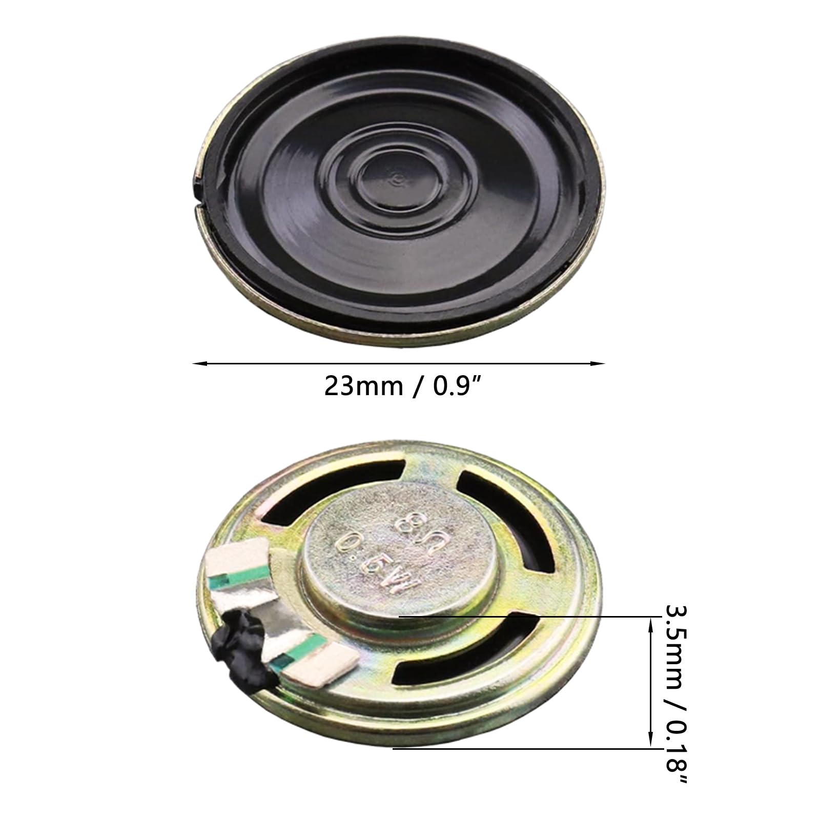 Diameter: 23mm/0.9 "; thickness: 3.5mm/0.18"; electric resistance: 8 Ohms; power: 0.5W.