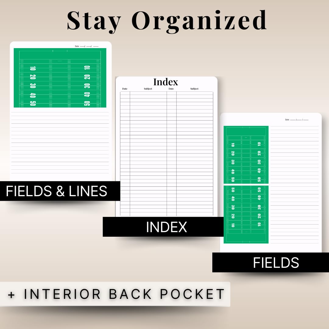 Large in size (7” x 10”), this football notebook for coaches & players features 120 thick, no-bleed pages with full color football field diagrams, perfect for football plays & lessons. Essential for football accessories helping you stay organized with an easy-reference index.