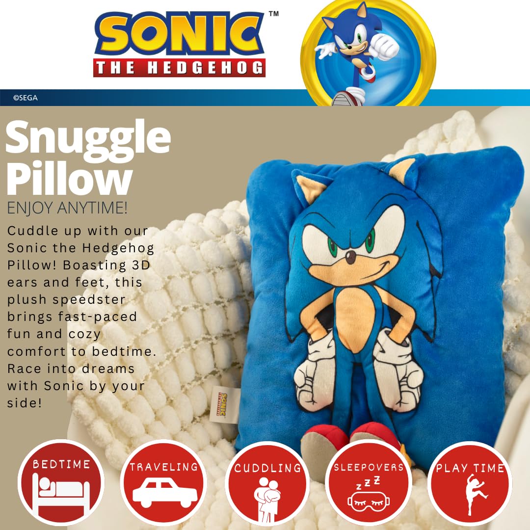 ITEM INCLUDES (FOR AGES 3 AND UP): A Sonic shaped plush 3D Snuggle Pillow that measures approximately 11" x 13". The perfect size to snuggle up for any Sonic The Hedgehog fan!