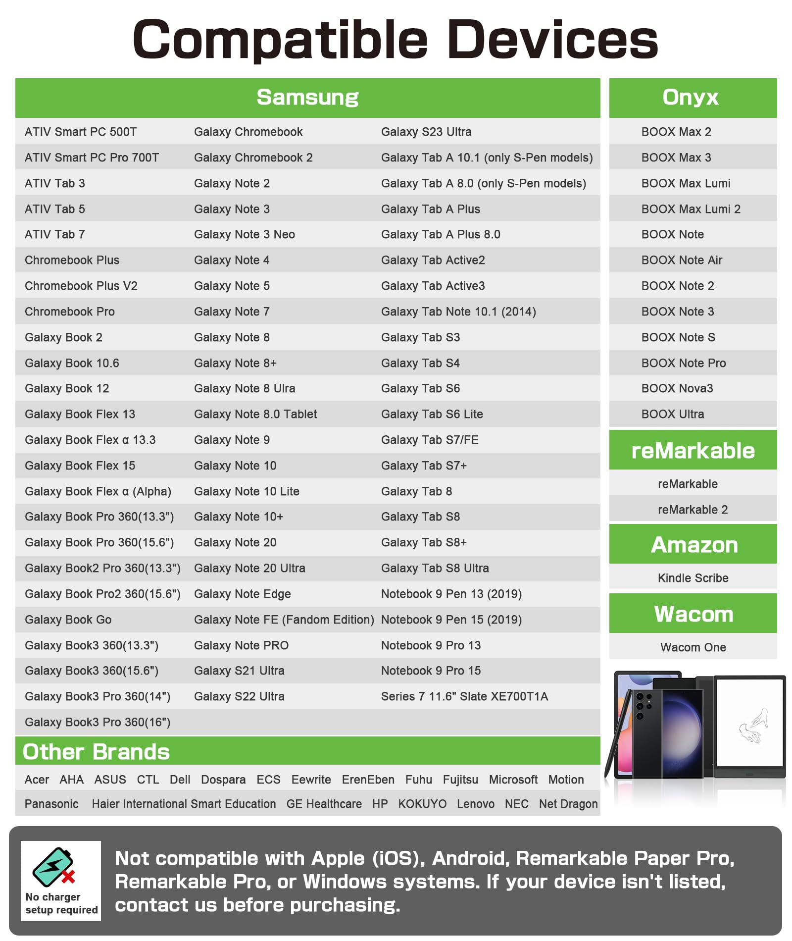 【Advanced EMR Technology】The EMR stylus pen for reMarkable 2 is equipped with advanced EMR technology, offering precise control and fluid responsiveness. Compatible with various EMR-enabled devices such as reMarkable 2/1, Kindle Scribe, Galaxy Tab, BOOX, Wacom, and more. No charging, setup, or pairing required to start writing. Note: Not compatible with Apple devices and reMarkable Paper Pro and reMarkable Pro.