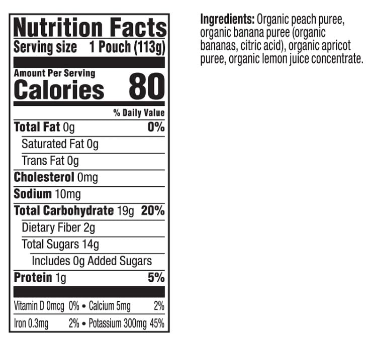 MADE WITH NATURAL FLAVORS: Contains organic peach puree, organic banana puree, organic apricot puree, and organic lemon juice concentrate