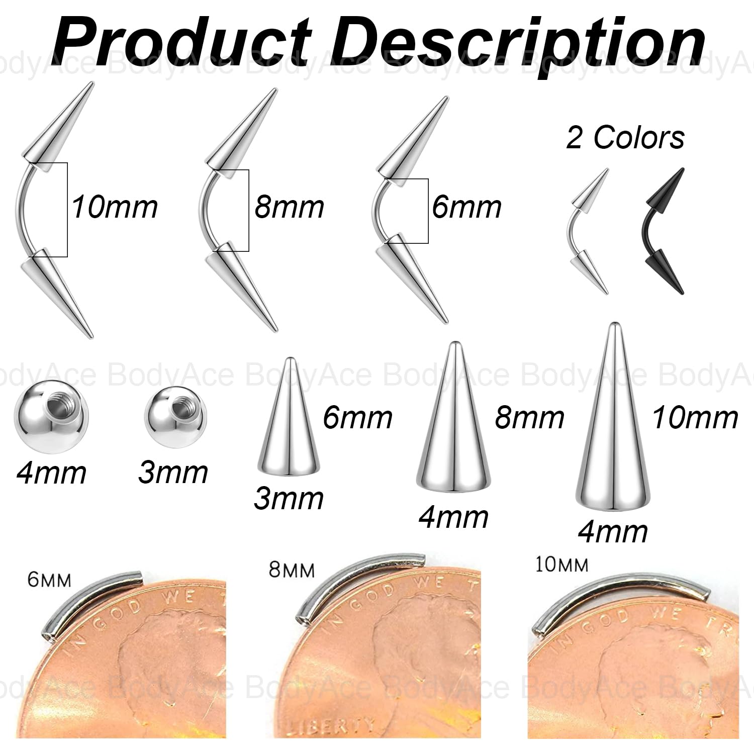✨Spike Eyebrow Rings✨ Each pack include 12 pieces curved barbell spike eyebrow jewelry (6 pairs silver spike rings & 6 pairs black spike rings). Spike daith piercing jewelry gauge: 16G(1.2mm), rook piercing jewelry bar length: 6/8/10mm. Be careful the curved barbell piercing jewelry sharp cone hurt your skin.