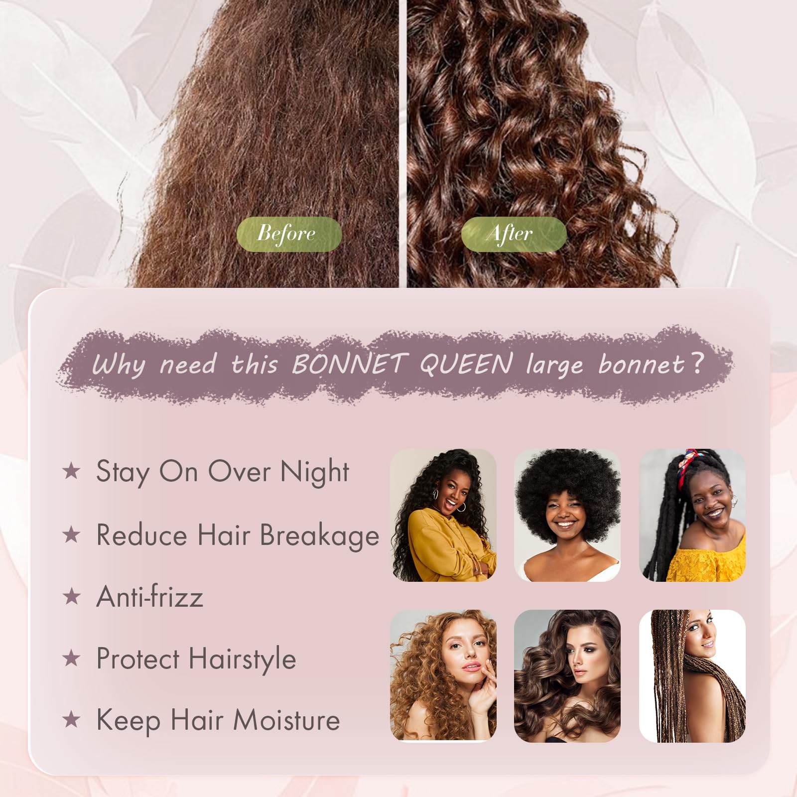 Extra large Bonnet: Flat diameter up to 42cm/16.5", with wide band, it can perfect cover all kinds of hairs: long hair, curly hair, braids, dreadlocks, dread, locs, crochet hair,weaves,faux, wig, etc.