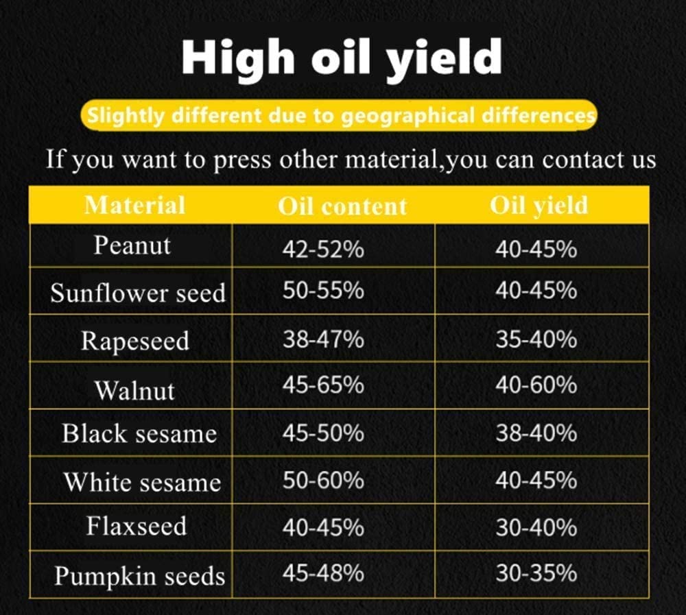 SQUEEZABLE MATERIAL - Varieties of materials including Coconut, Sunflower Seed, Walnut, Okra, Soybean, Peanuts, Moringa Seed, Kiwi Seed, Winged Oil Fruit, Perilla Seed, Flax Seed, Camellia Seed, Rapeseed, Black Sesame, White Sesame, Almond Powder, Pepper Seeds, Pumpkin Seeds, Pine Nuts, Licorice, etc. The machine can't squeeze olive oil, because for household press, it is difficult to complete, so we feel sorry that pressing olive oil is not recommended.