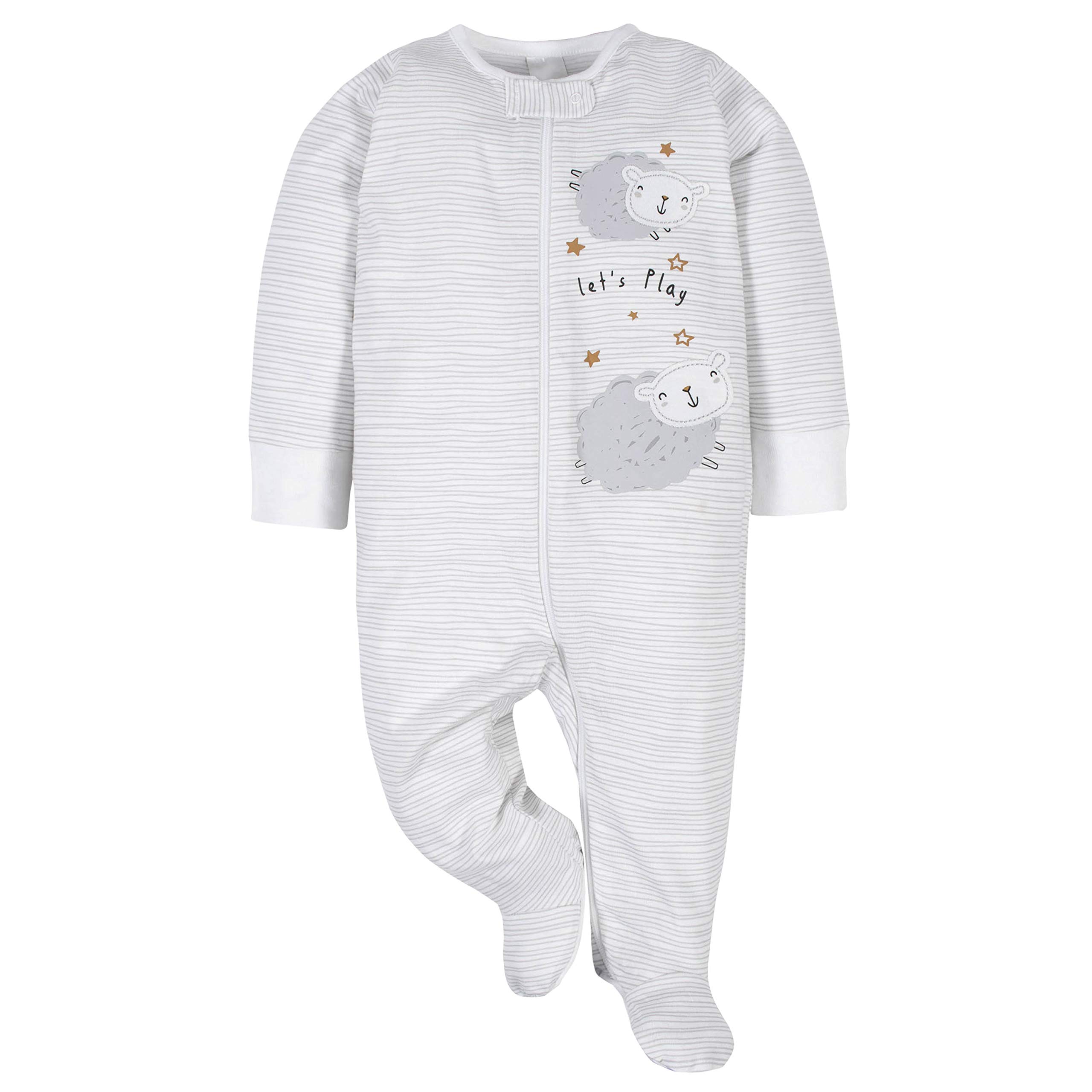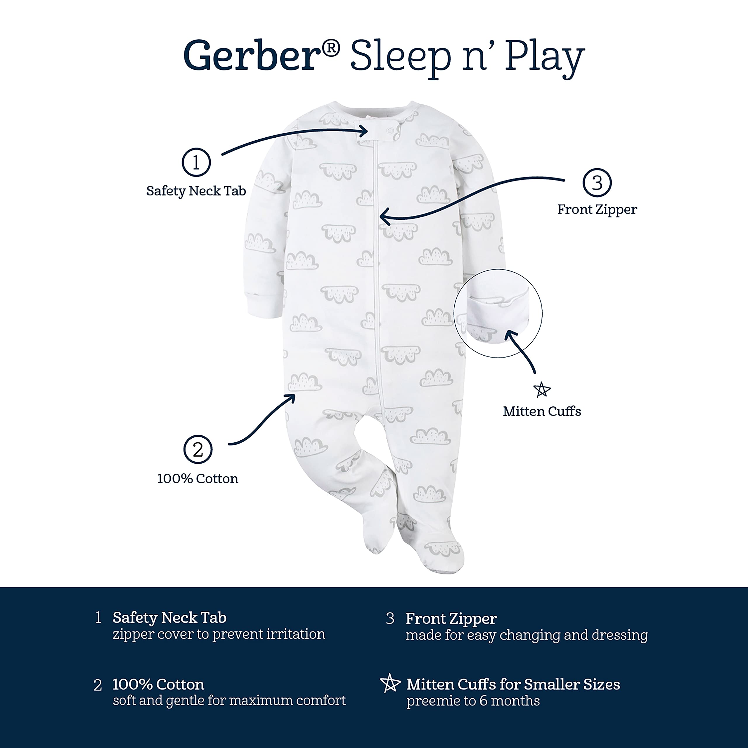 Description Gerber Sleep ‘n Plays are the ultimate footie pajamas baby is sure to love! These soft footies are made with 100% cotton, a comfortable fabric that’s perfectly breathable to prevent irritation against baby’s delicate skin. They’re appropriate to use as newborn footie pajamas as they’re made to comply with all safe sleep standards. They’re also available in sizes all the way up to 6-9M to fit older or larger babies. Each Gerber Sleep n’ Play features a zipper down the front of the outfit to allow for easy and fast diaper changes. This zipper makes the baby sleeper incredibly easy to put on as well as to take off. Atop the zipper is a safety tab with a snap to keep the zipper held in place. This reduces irritation caused by baby’s chin being poked by the zipper. These baby sleepers are footed to add extra warmth which is wonderful for sleepy time as well as if there is a chill in the air. It also means no fooling around with baby socks! These footie pajamas kids will love to wear to bed because of their supreme comfort as well as cute and fun patterns. Available in assorted colors and patterns, they’re suitable baby girl sleepers as well as baby boy sleepers. Babies love the comfortable feel and parents love how cute they look! But these Sleep n’ Plays aren’t just for sleep! They’re wonderful comforatble, casual outfits to wear during the day. They allow babies mobility and provide warmth. They’re perfect for play but are cute enough to be worn out on the town! These outfits are perfect to wear on a stroll outside, to the grocery store, to day-care, or to grandma and grandpa’s house! The possibilities are endless! The versatility of these outfits truly gives them a spectacular value that all parents will appreciate. They make an excellent gift for any baby boy or baby girl you know and love! Gerber provides high-quality products that are easy and convenient for parents as well as cute and comfortable for baby. Gerber provides safe products that parents can trust.