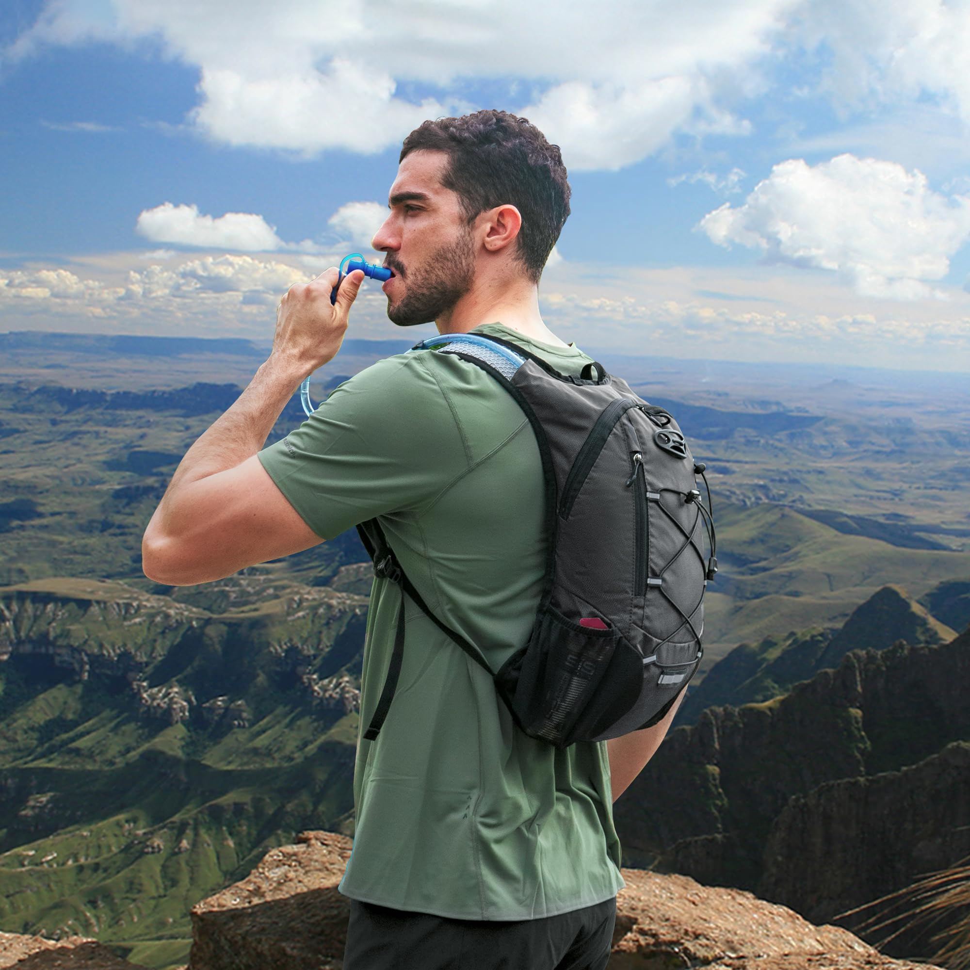 Leakproof & Anti-popping Water Bladder: Water backpack for hiking with 2 L bladder, BPA-free, food-grade PEVA material, and hose clamp. Leakproof bite value, water flows fast and never drips on when locked