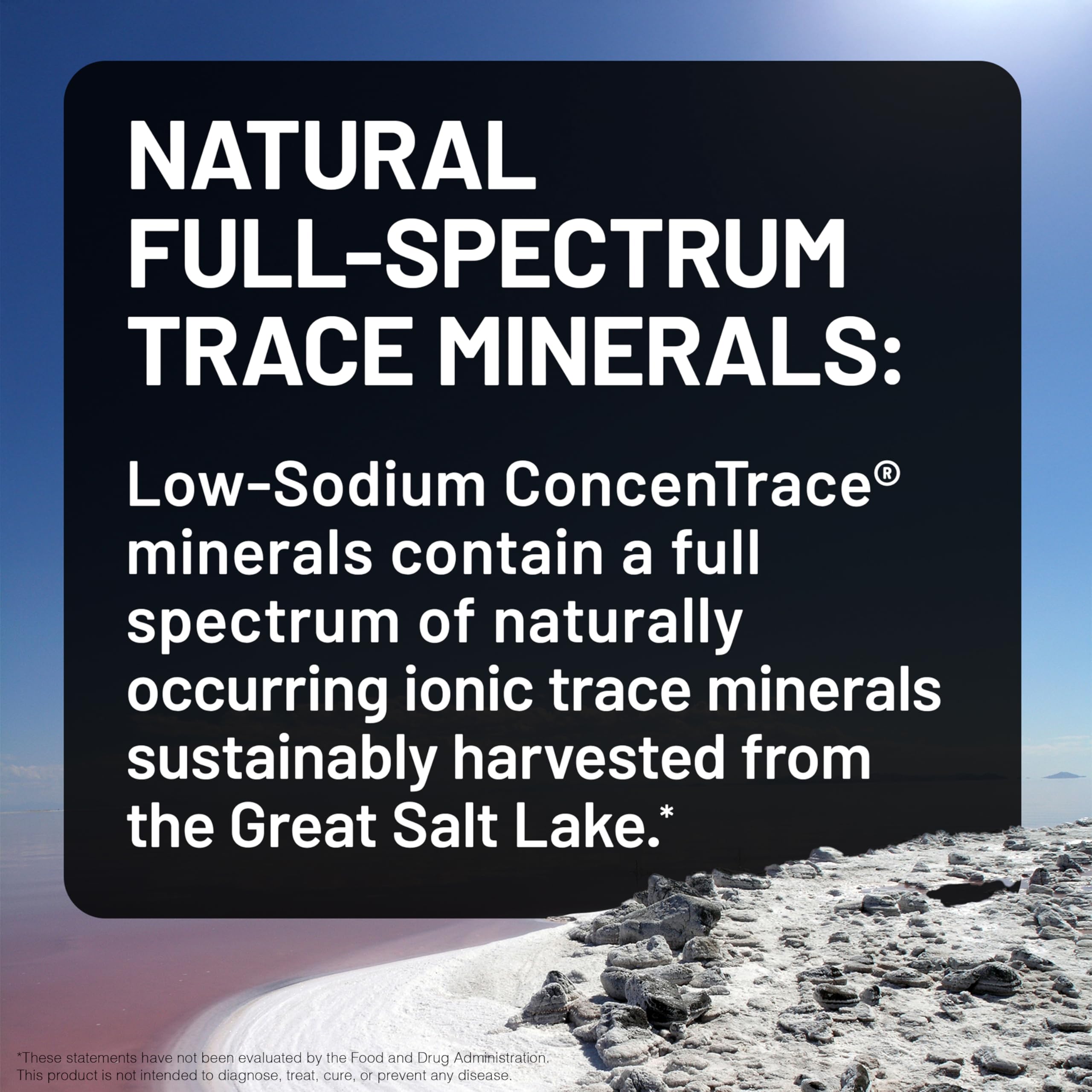 NATURAL FULL-SPECTRUM TRACE MINERALS: Low-Sodium ConcenTrace minerals contain a full spectrum of naturally occurring ionic trace minerals sustainably harvested from the Great Salt Lake.*
