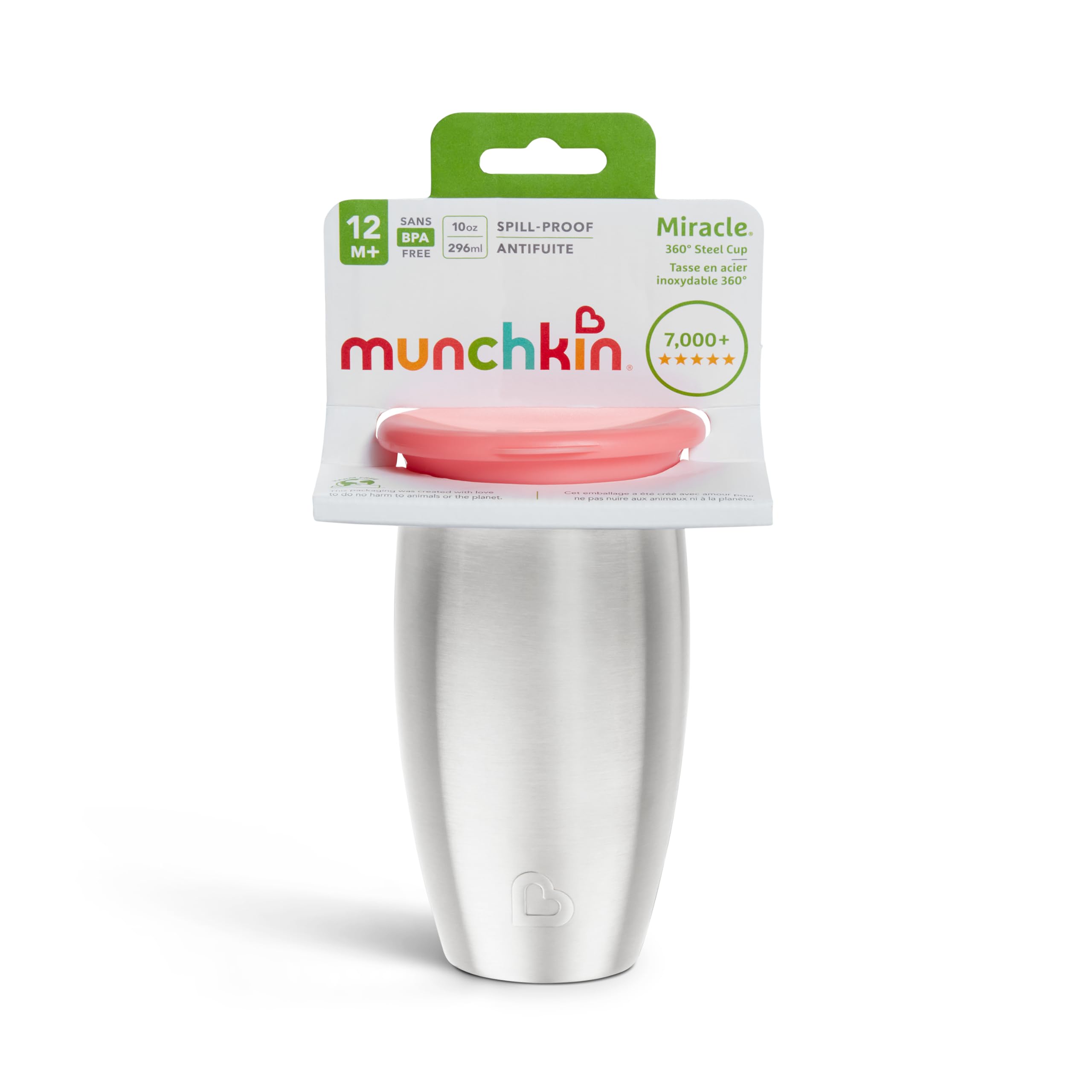 Munchkin's Miracle stainless steel 360 sippy cup is here to "steel" your heart when it comes to sippy cups. Let's face it: toddlers are a messy bunch, especially when first navigating sippy cups. Now imagine a world in which drinks didn't spill at all-no, it's not a miracle- it's Munchkin Miracle 360 Cup. This premium insulated stainless steel sippy cup keeps liquids cool for fresh and cold toddler drinks all day. Light-weight stainless steel material is extremely durable and double wall design won't sweat or get hands cold. Patented 360 rim eliminates messes and supports kids' Dental health All at once because drinking from anywhere around the rim, like a regular cup, helps support normal muscle development in a child's mouth. Also includes matching cup lid to keep drinking edge clean on-the go. With no extra spouts, straws or pieces, the Miracle 360 Cup is easy to use and even easier to clean. We'll say Cheers to that. Suitable for children 12 months and up.