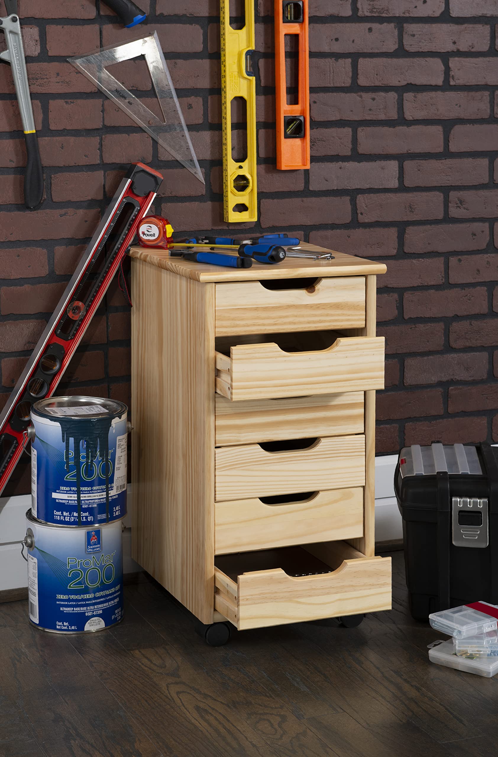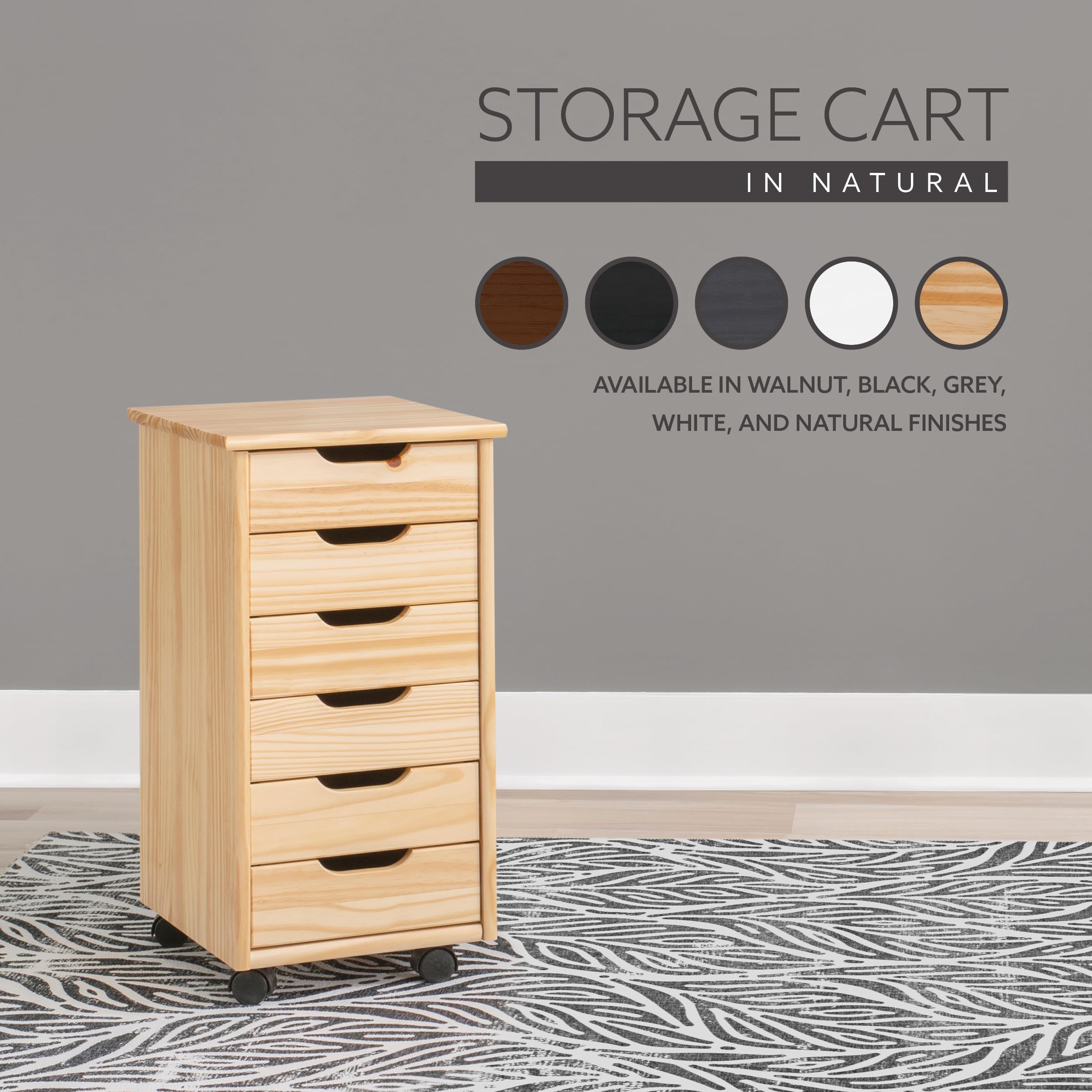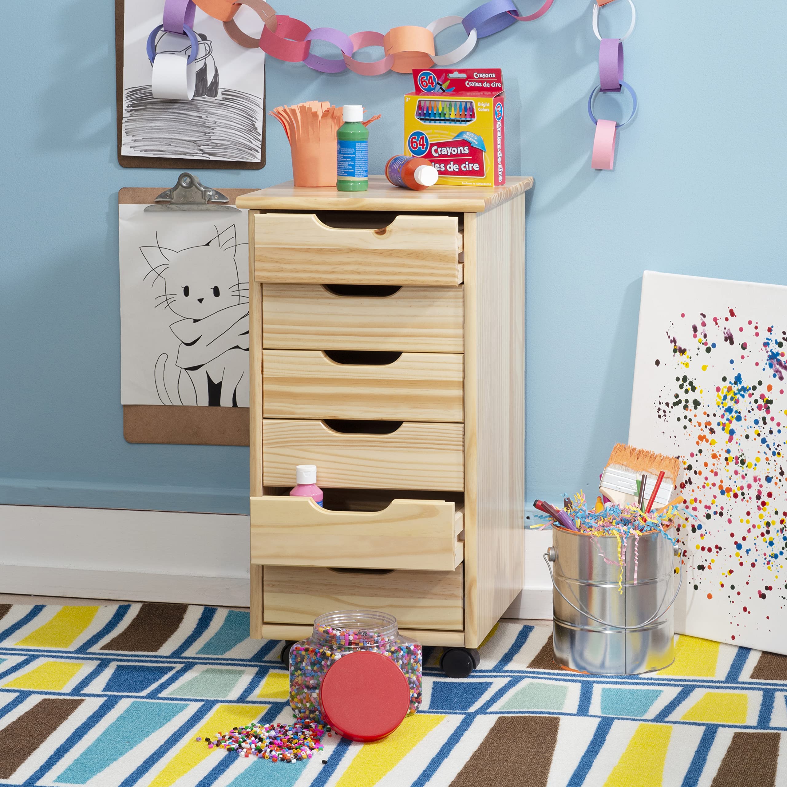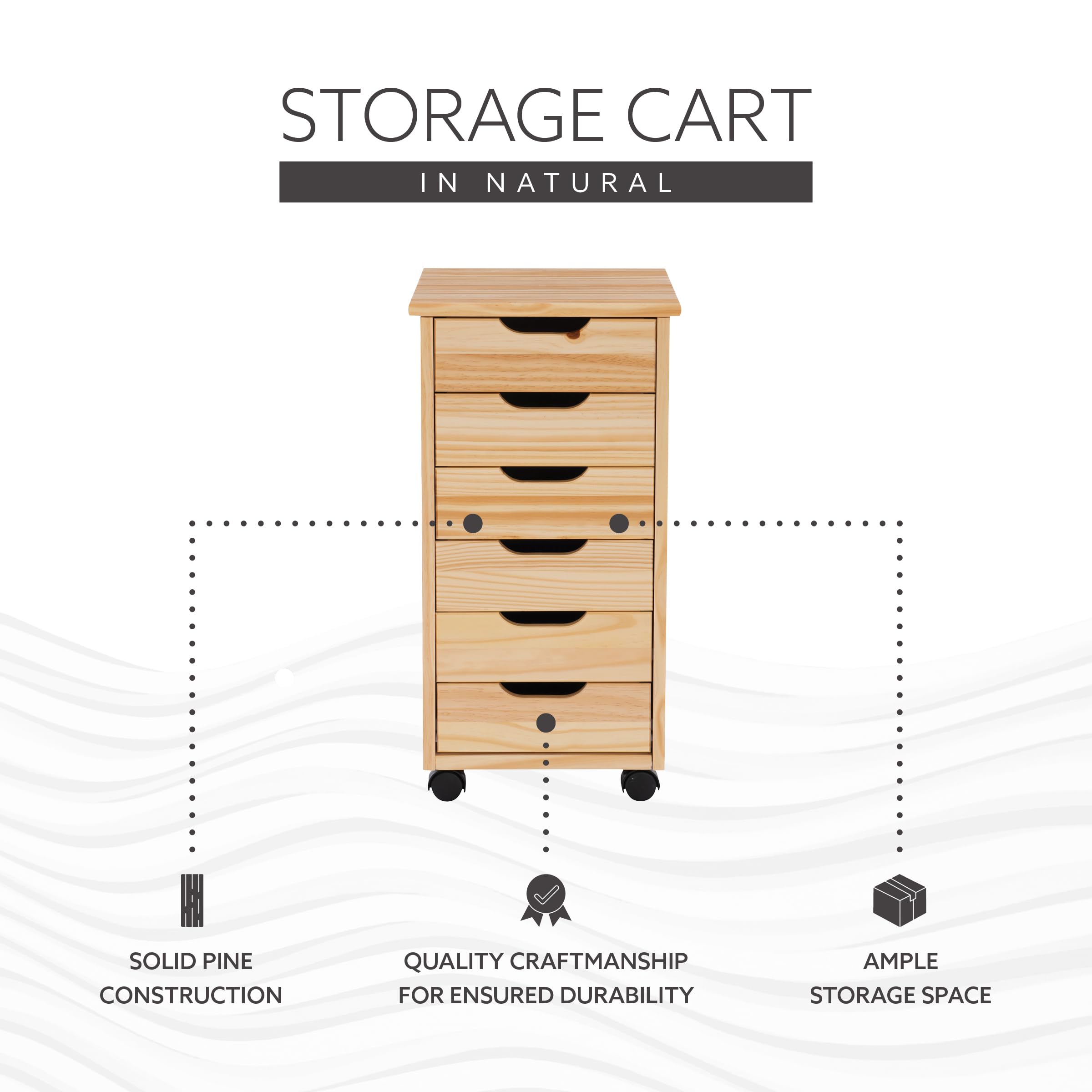 Crafted with a sturdy pinewood frame and finished in a glossy natural varnish, this piece provides functional storage and a clean, inviting aesthetic. The 6 drawers provide ample space for organizing everything from office supplies and craft materials to clothing accessories and household essentials. The smooth-glide design and recessed handles allow for effortless access, while the compact build is ideal for making the most of tight quarters. Caster wheels ensure easy and smooth mobility. With a height of 25.75”, this piece is perfect for placement next to a desk, vanity, sink, or tucked into a closet.