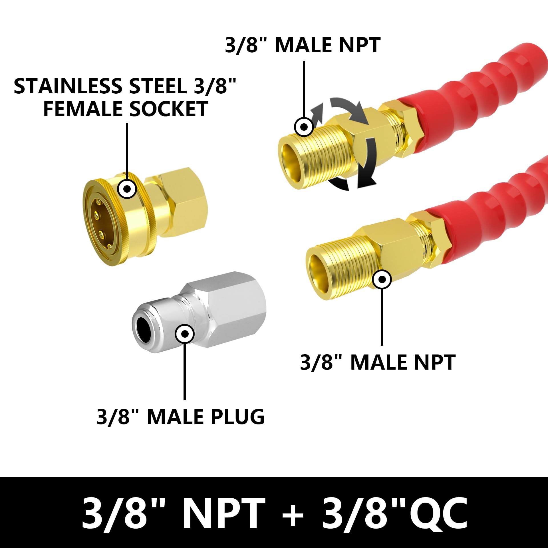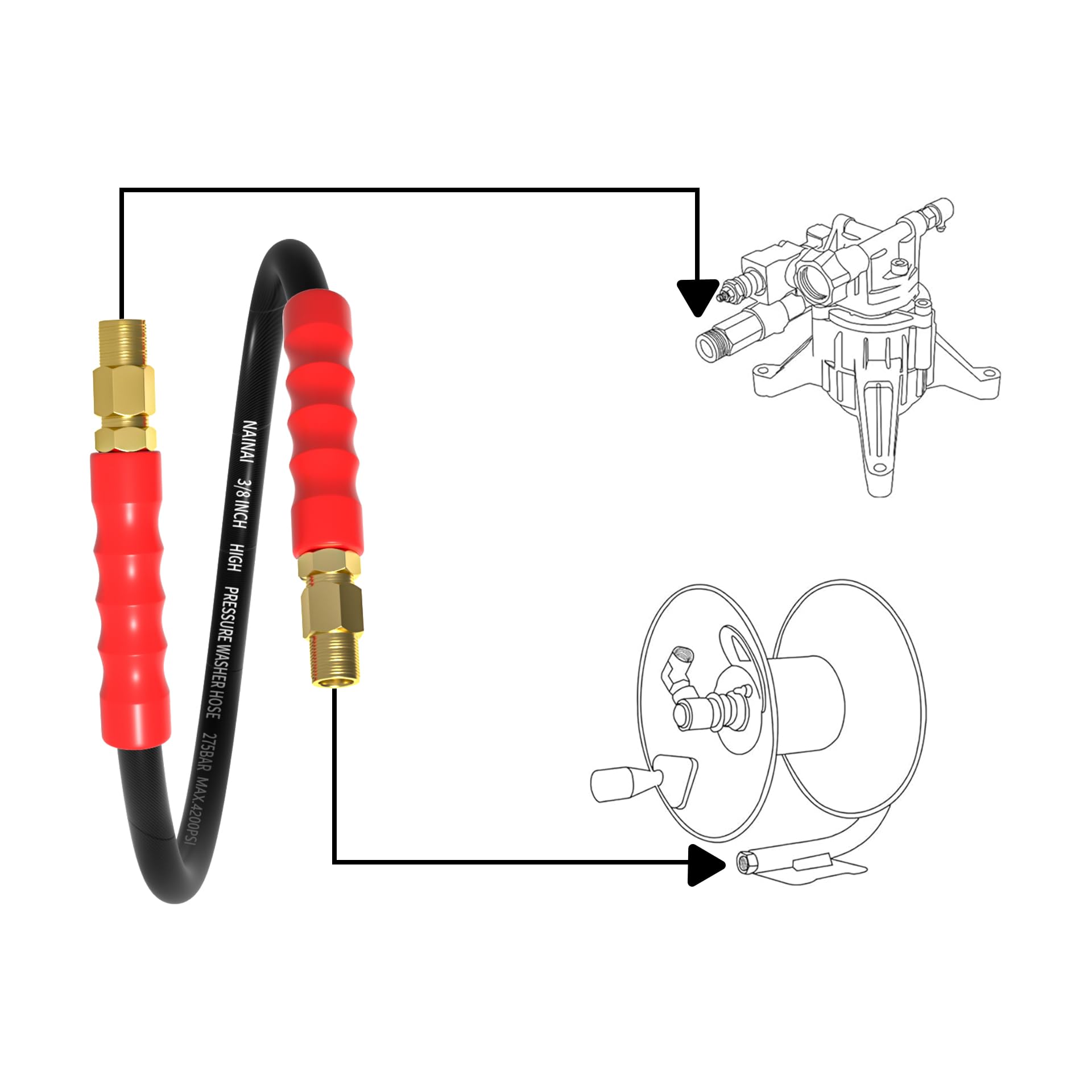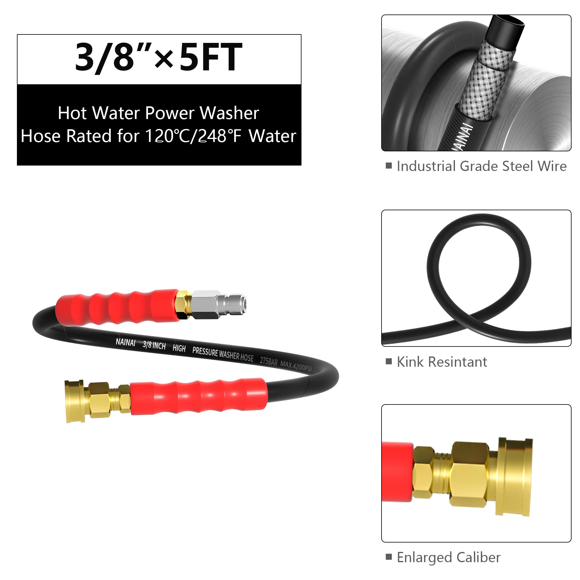 4.【3/8 Quick Connect Jumper Hose】NAINAI Pressure Washing hose is equipped with 3/8" quick connector which is not only easy to connect & disconnect, but also helps connect firmly to the pressure washer without being easily shaken, damaged, rusted or leaked.