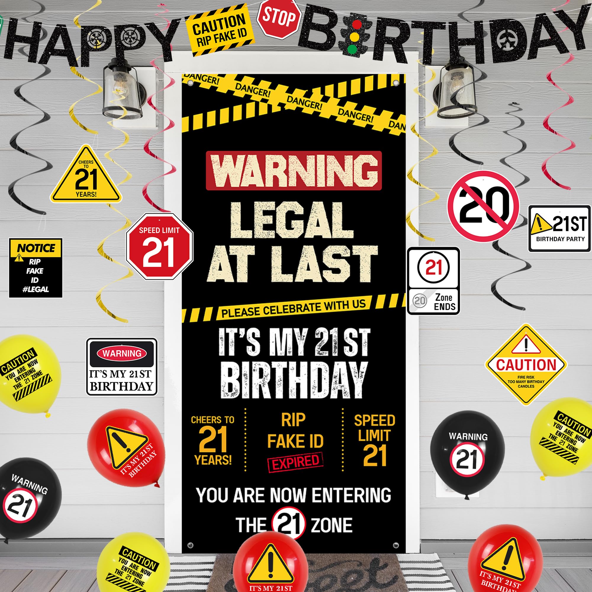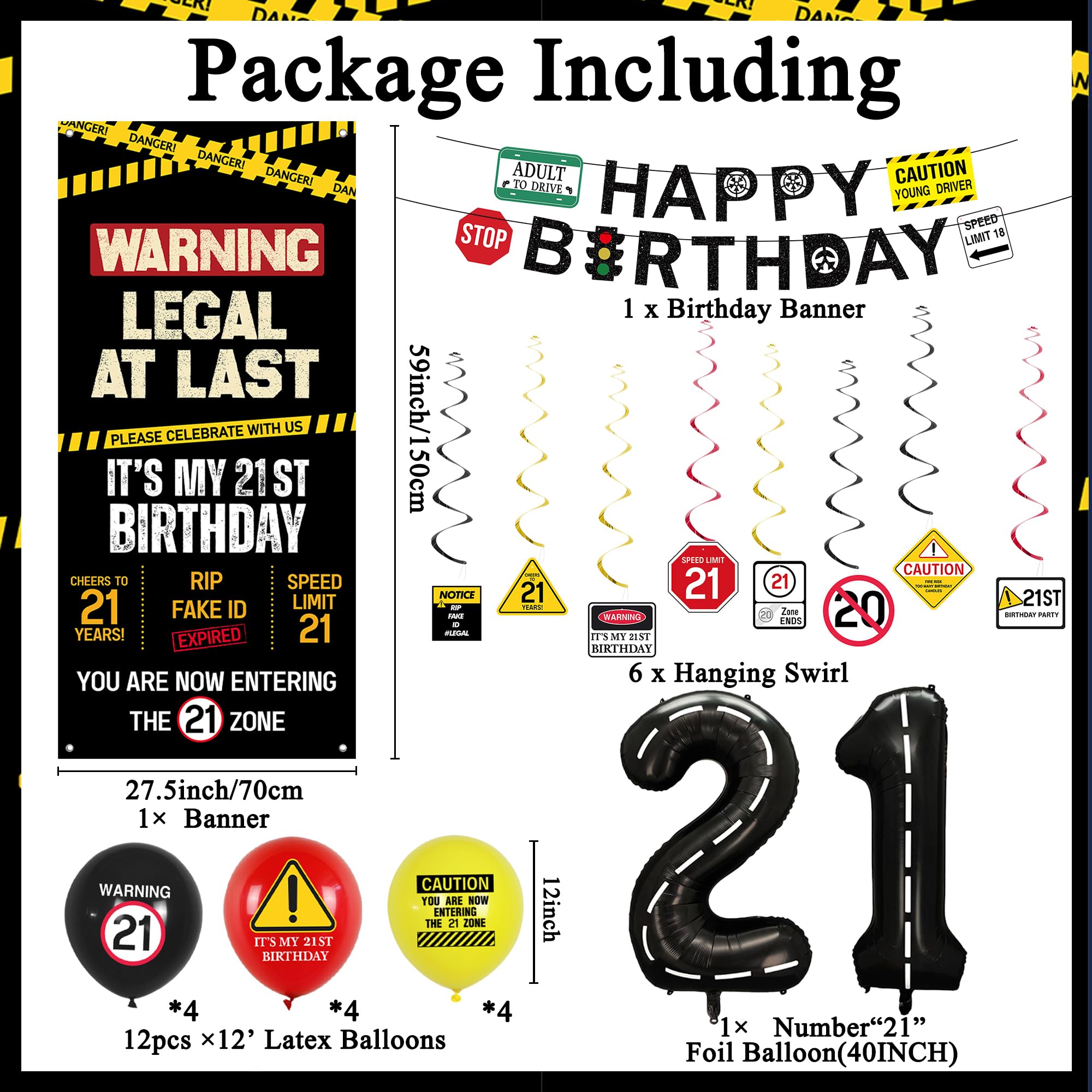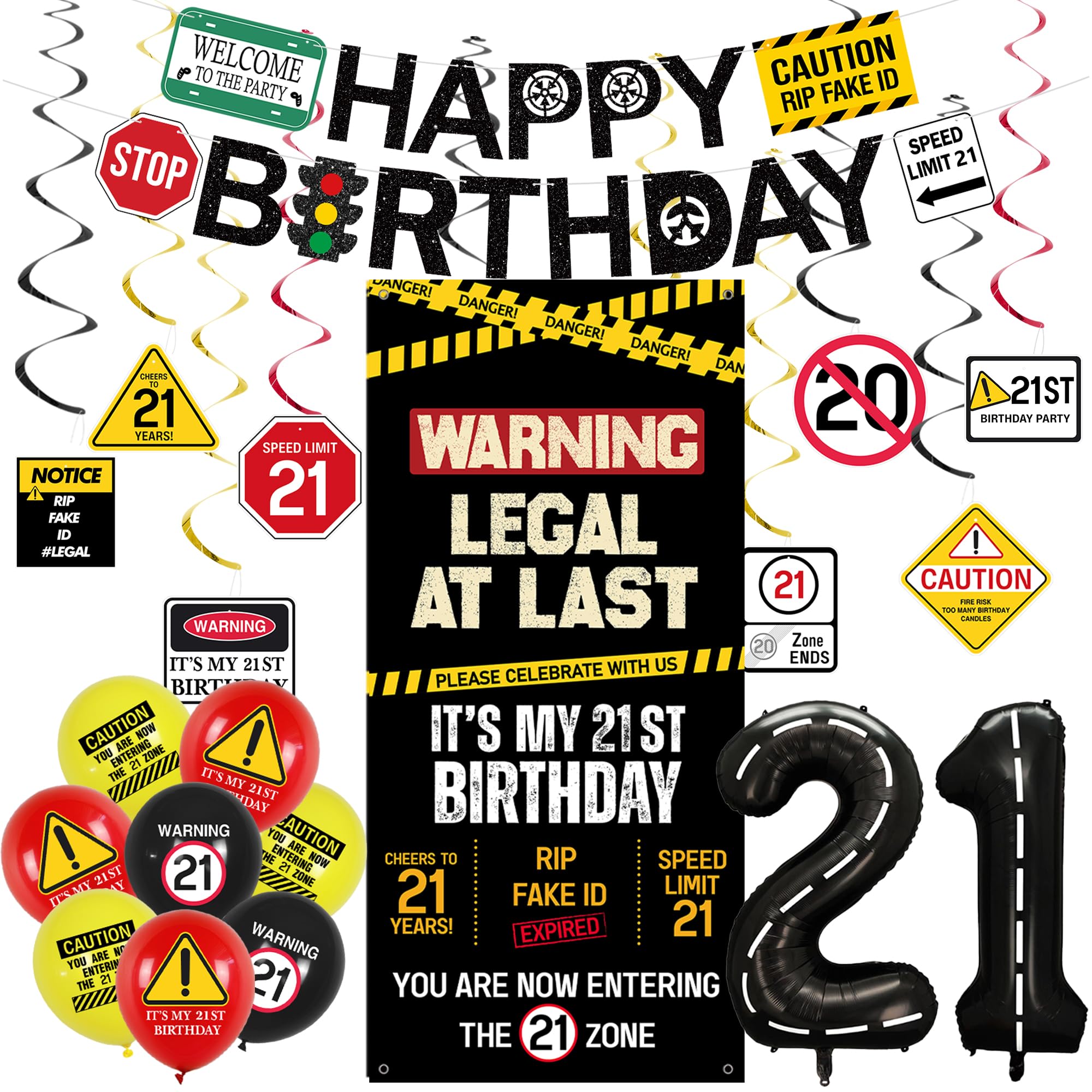[21st Birthday Decor] - Our 21st birthday party decorations set with caution logos in black, yellow and red includes 1PC "Happy Birthday" banner, 1PC "Legal At Last" door cover, 8PCS hanging swirls, 12PCS balloons and number "21" balloons. Enough quantity to meet your 21st birthday party decorating needs and perfectly decorate your 21st Bday party