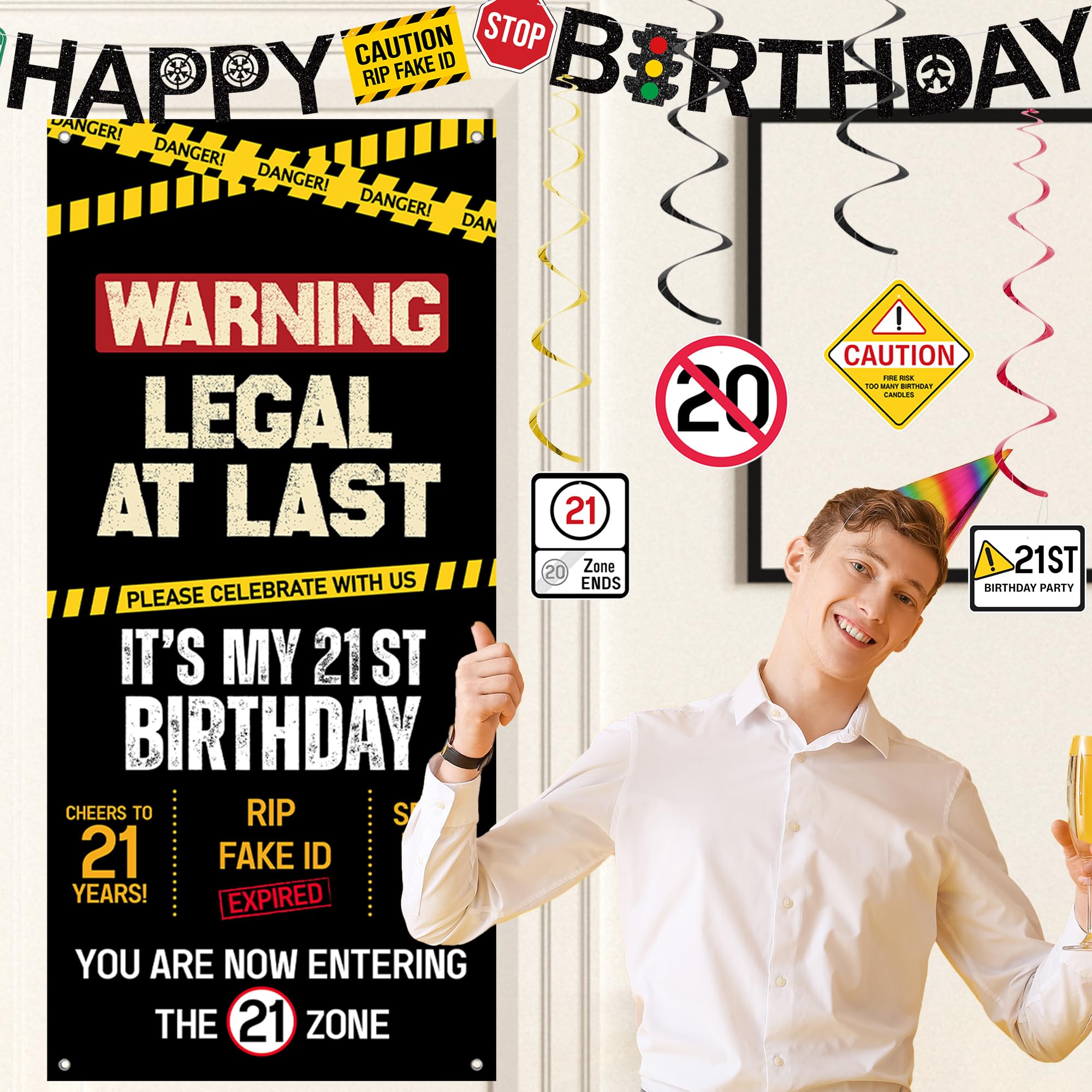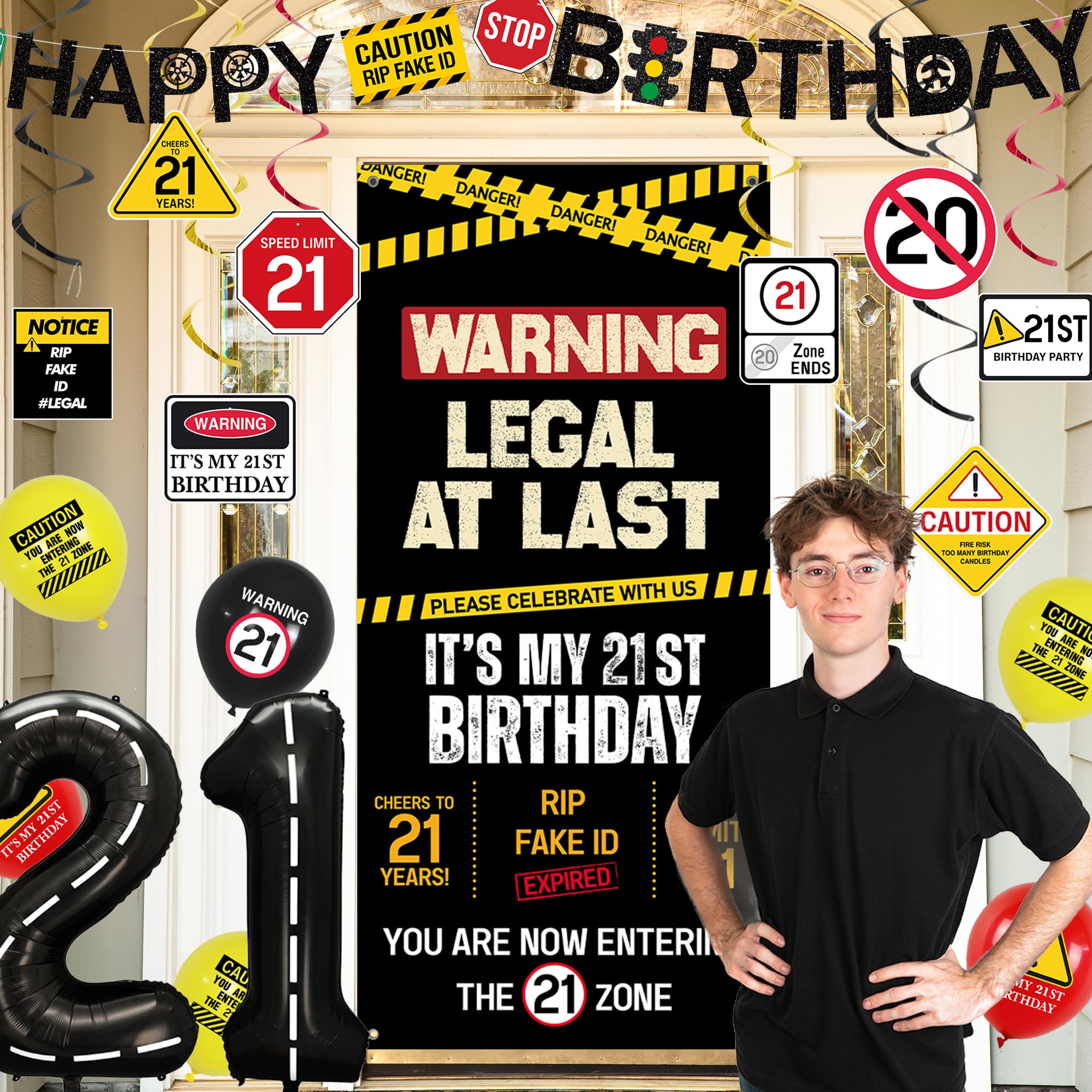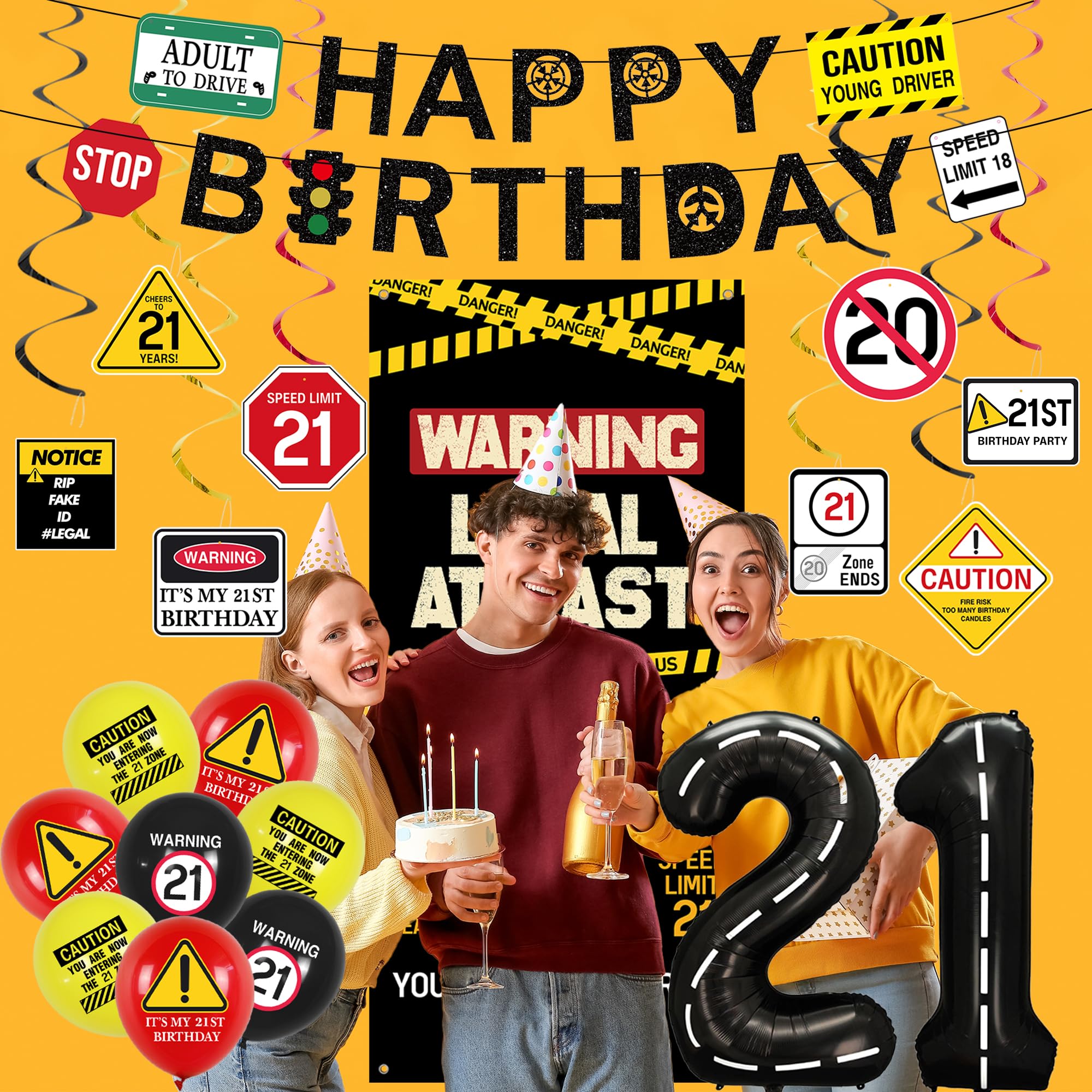[21st Birthday Decor] - Our 21st birthday party decorations set with caution logos in black, yellow and red includes 1PC "Happy Birthday" banner, 1PC "Legal At Last" door cover, 8PCS hanging swirls, 12PCS balloons and number "21" balloons. Enough quantity to meet your 21st birthday party decorating needs and perfectly decorate your 21st Bday party