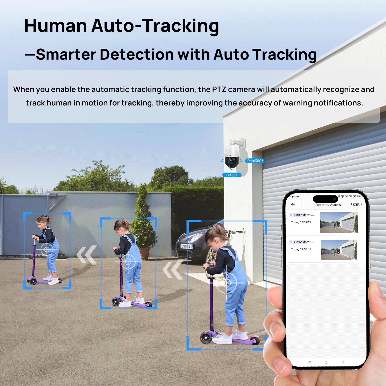When person enters the video area,the ptz cameras will automatically track and send the real-time snapshots to your phone.Support 1 groups of cruise routes and scanning tracking, each route can be set up 64 preset positions, and according to your preset position for loop inspection.