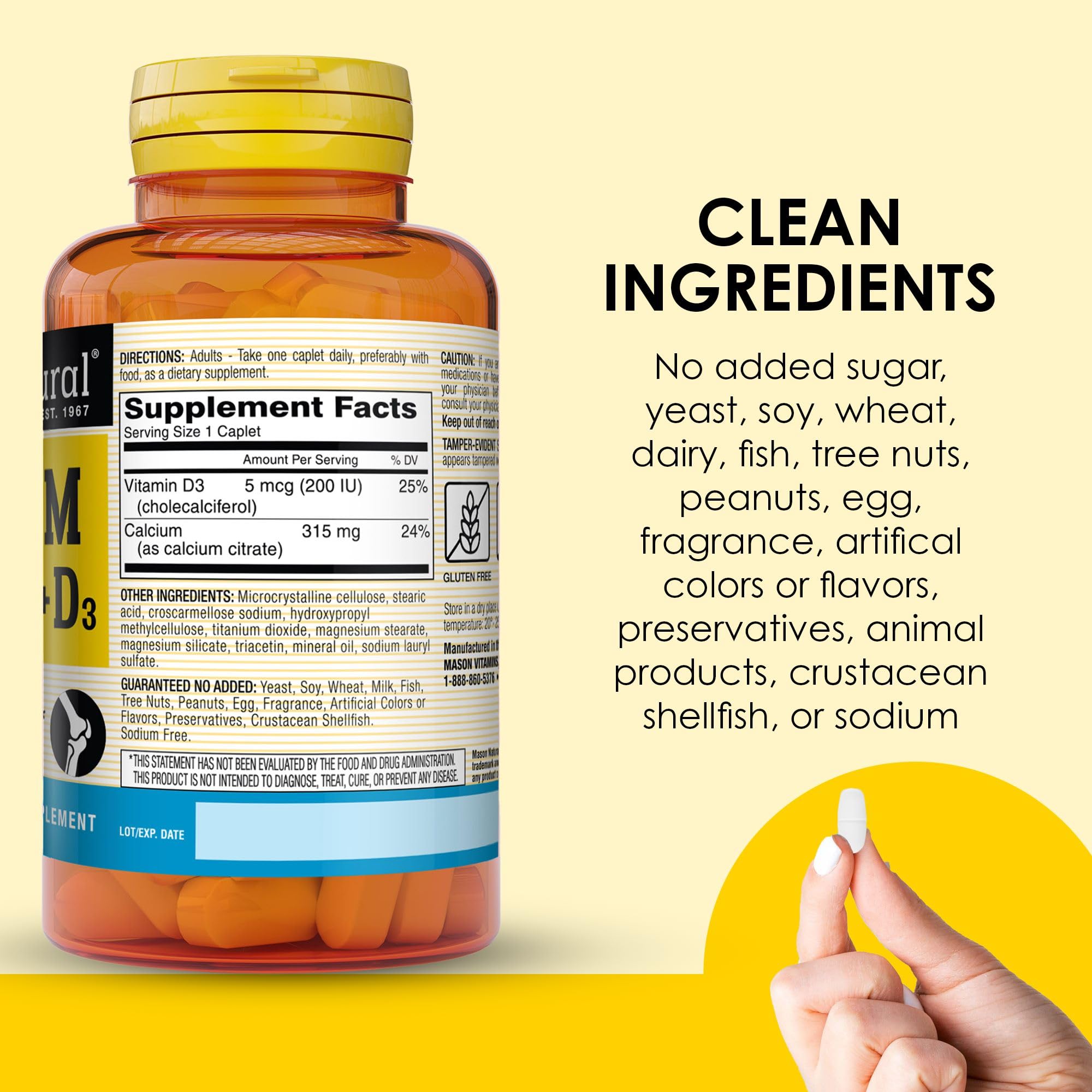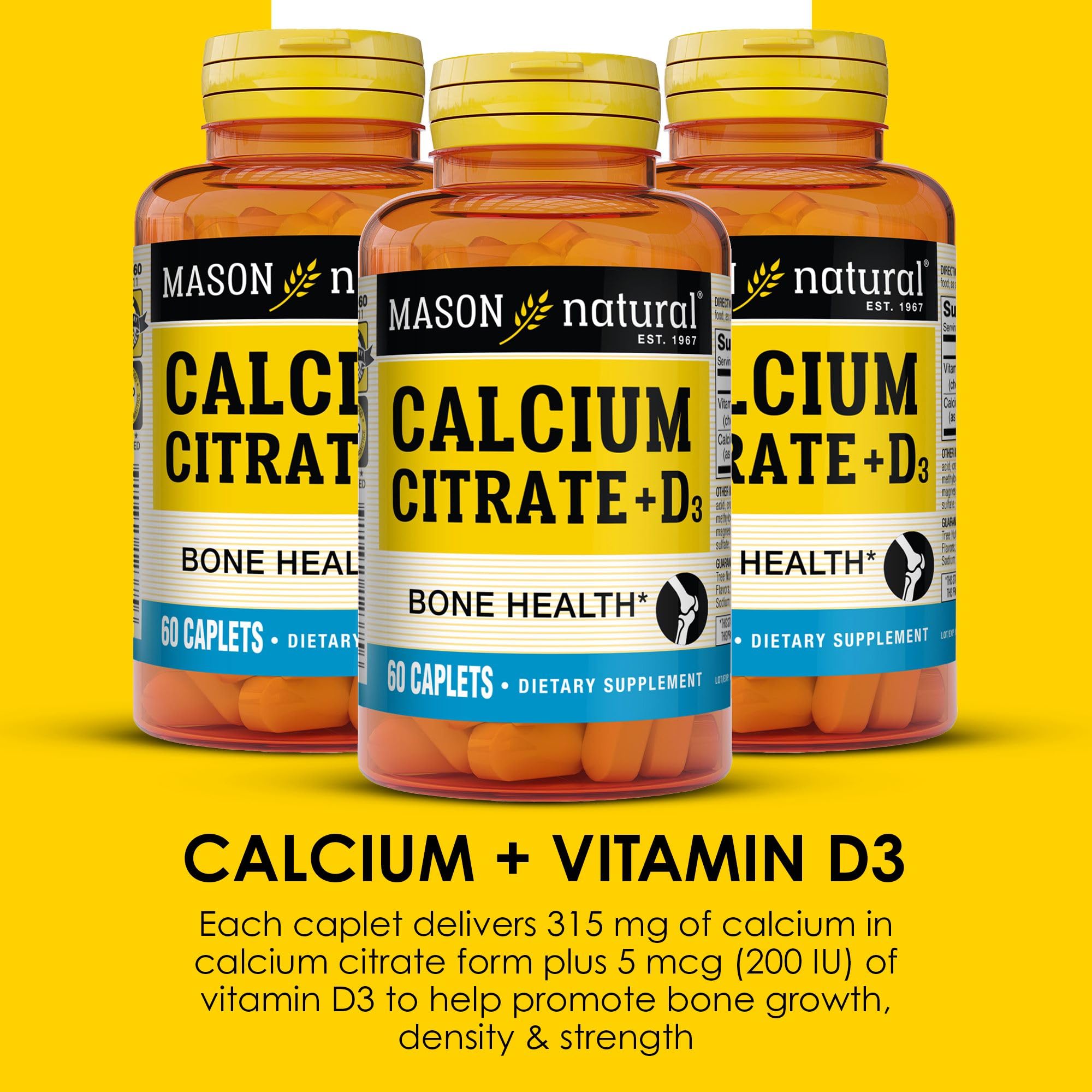 CALCIUM + VITAMIN D3: Each caplet delivers 315 mg of calcium in calcium citrate form plus 5 mcg (200 IU) of vitamin D3 to help promote bone growth, density & strength