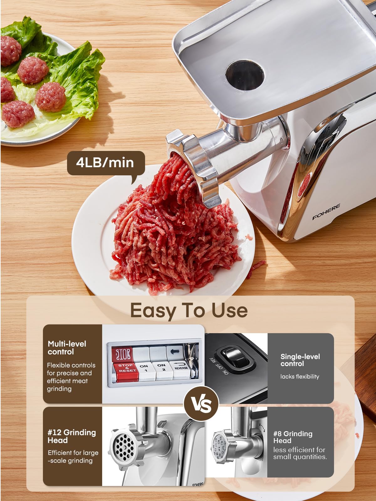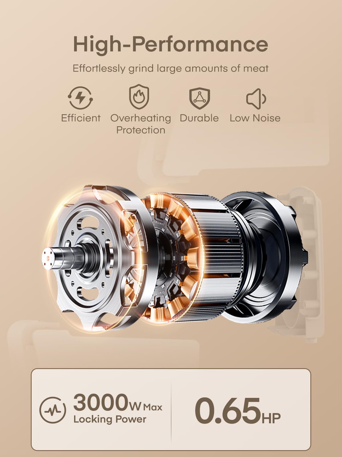 【3000W Max Powerful Performance】 The meat grinder heavy duty features a powerful pure copper motor (3000W Max locking power, 500W) and a high-torque 0.65HP, capable of producing 4lbs of minced meat per minute. This makes grinding meat easier during both daily and peak hunting seasons.
