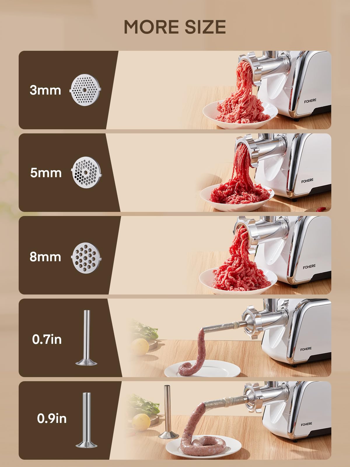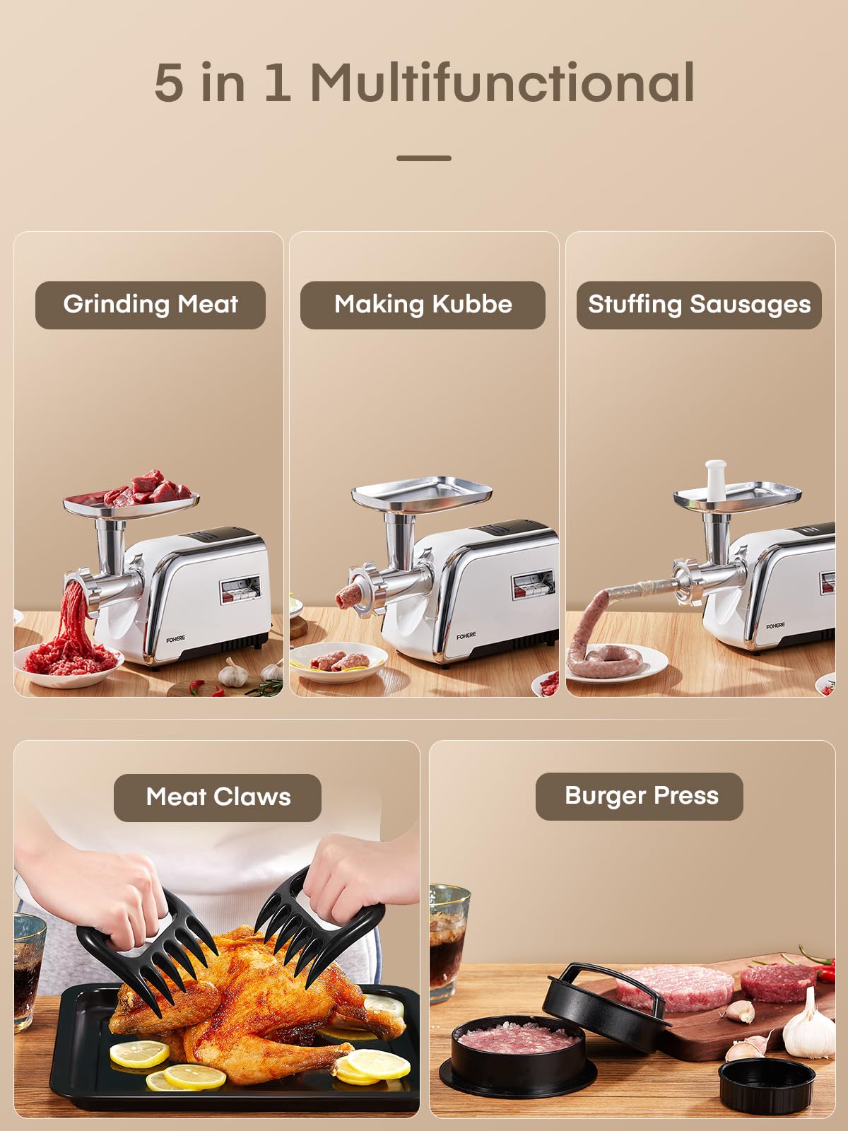 【5 in 1 Multifunctional】 This electric meat grinder comes with 3 stainless steel grinding plates (Fine, Medium, Coarse), 2 sausage tubes (0.7in, 0.9in), Kubbe, meat claws, and a burger press attachment. It can quickly meet most of your needs.