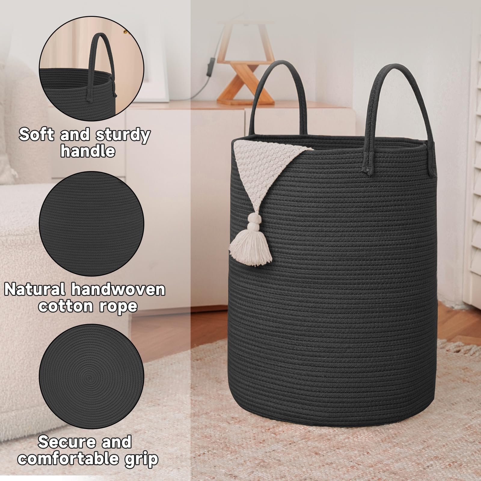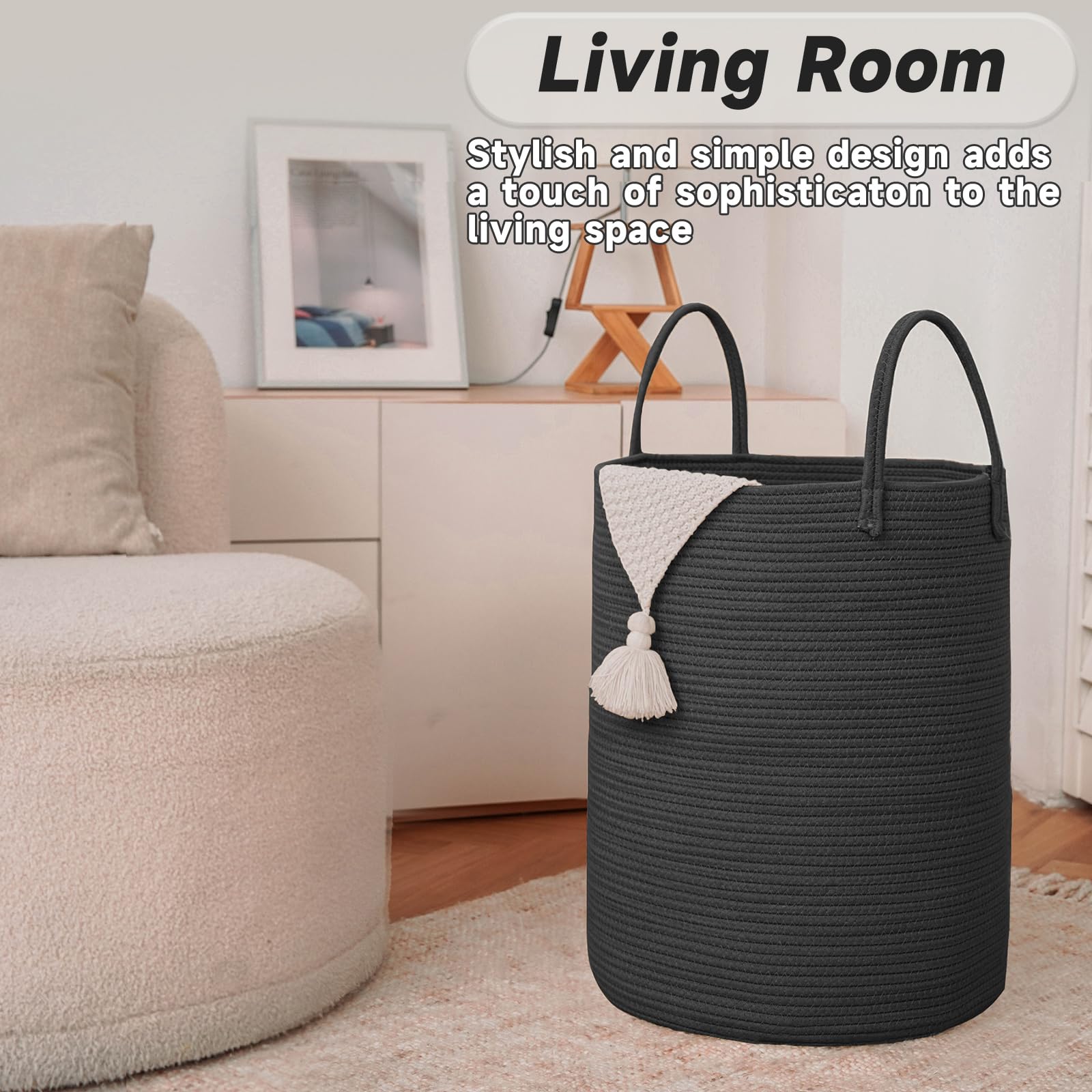 STYLISH & VERSATILE DECOR -- Elevate the aesthetic of your home with our cotton rope woven laundry baskets, as its stylish, minimalist design easily holds 5 rolled blankets and adds a touch of sophistication to your bedroom or living area