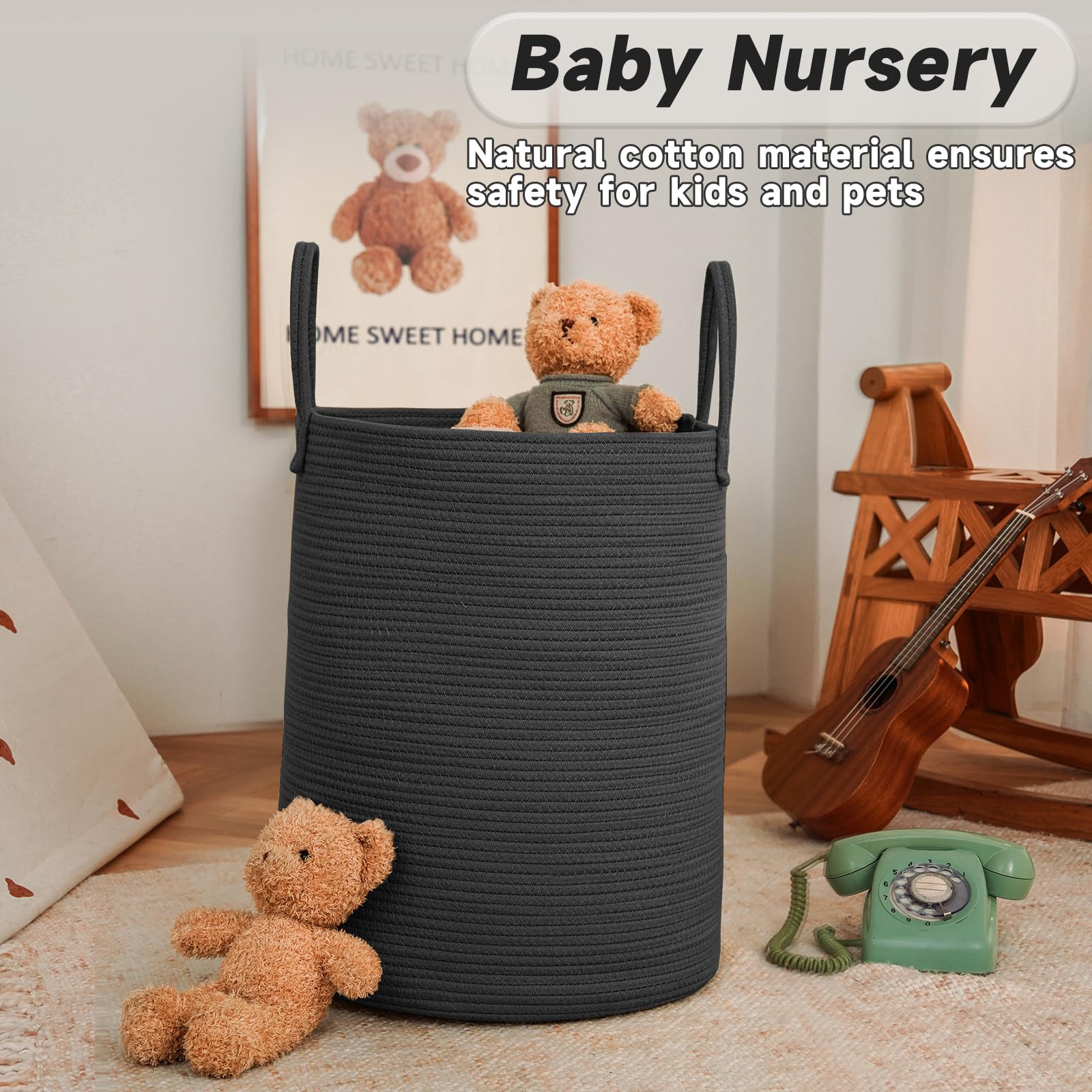 EXTRA LARGE 60L/80L/100L CAPACITY -- Elevate your home organization with our sturdy nursery hamper that stands up straight without tipping. Ideal for use in the living room or bedroom, it efficiently stores items like toys, clothes, and 3 to 5 thick throws to keep your living space tidy and stylish