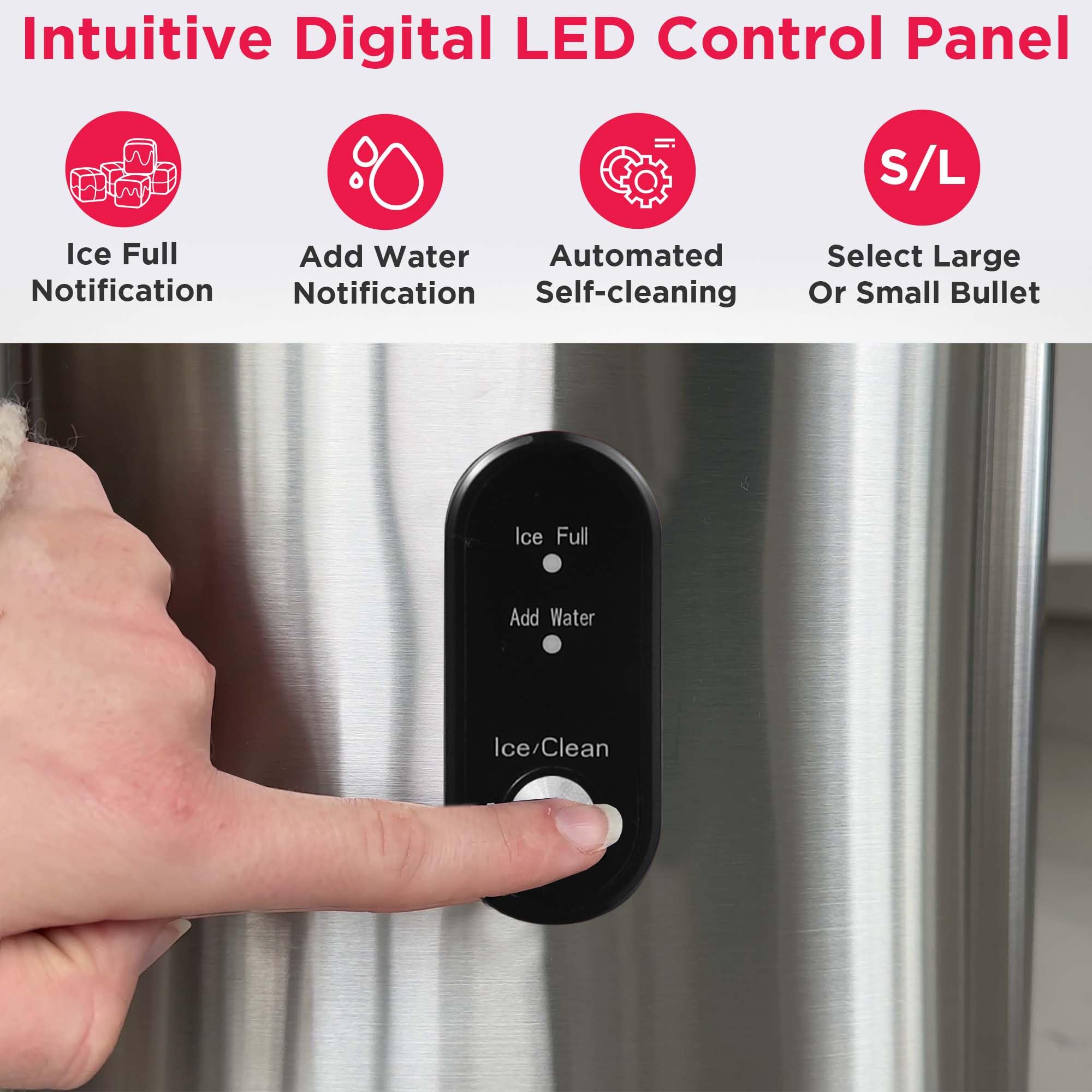 MODERN DESIGN - This stainless steel ice maker features a transparent window for easy viewing and an LED digital display for effortless operation.
