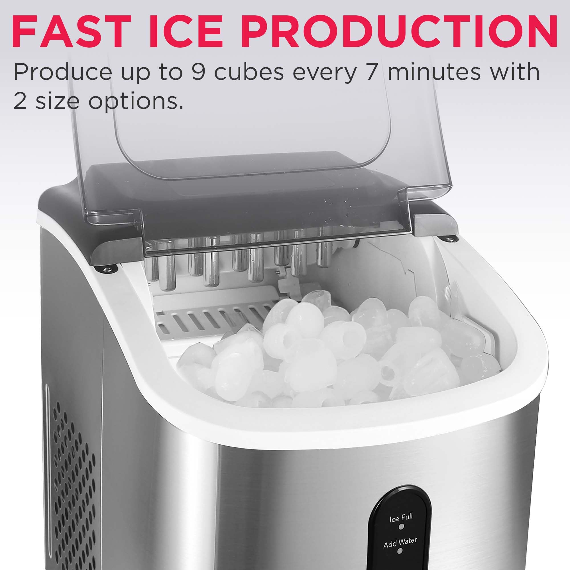 VERSATILE ICE OPTIONS – Choose between two ice cube sizes, small or large, to suit your needs. Includes a convenient ice scoop for easy serving.