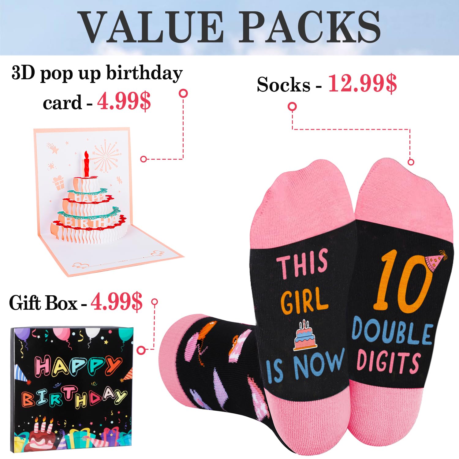 [Gifts for 10 year old girl] A pairs of socks special design for 10 birthday girl, package also coming with a cute 3D pop up birthday card. Both itmes are packed in a beautiful gift box to emphasizes the surprise and enhances the joy of unwrapping the box, making the popular gifts for 10 year old girls more memorable.It could be the perfect birthday gift for your daughter, granddaughter, or niece