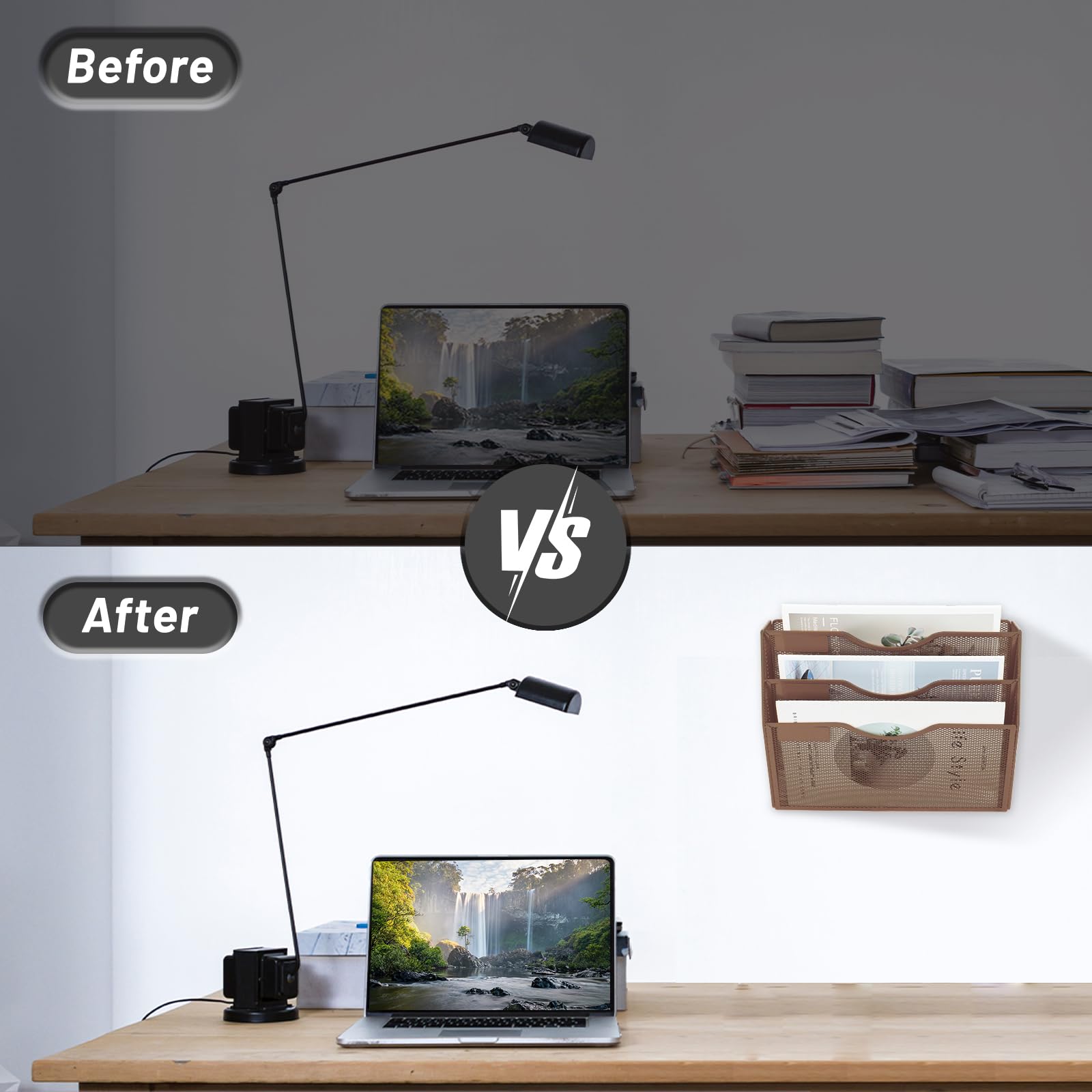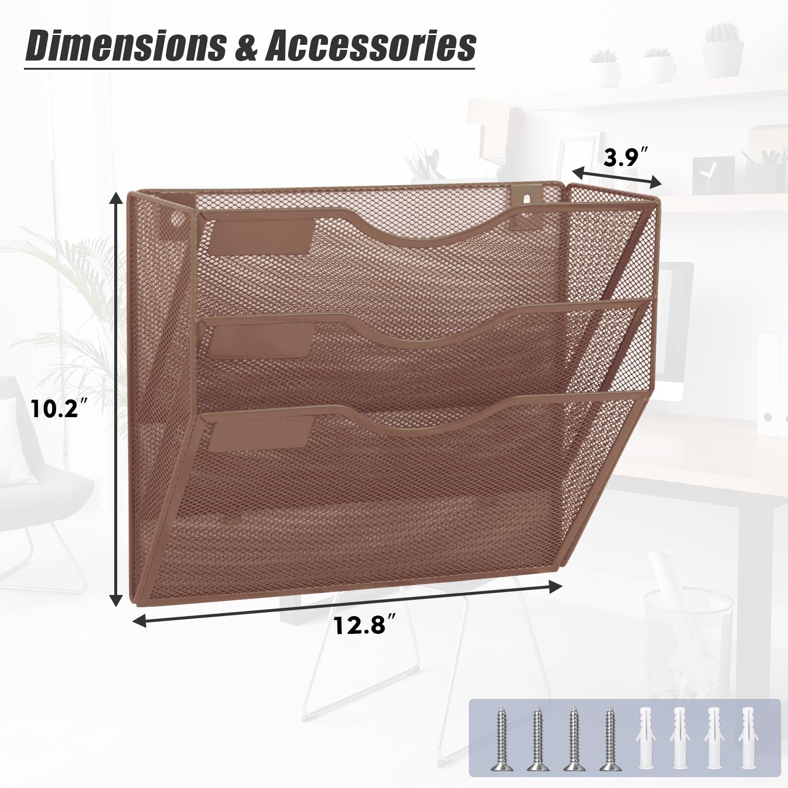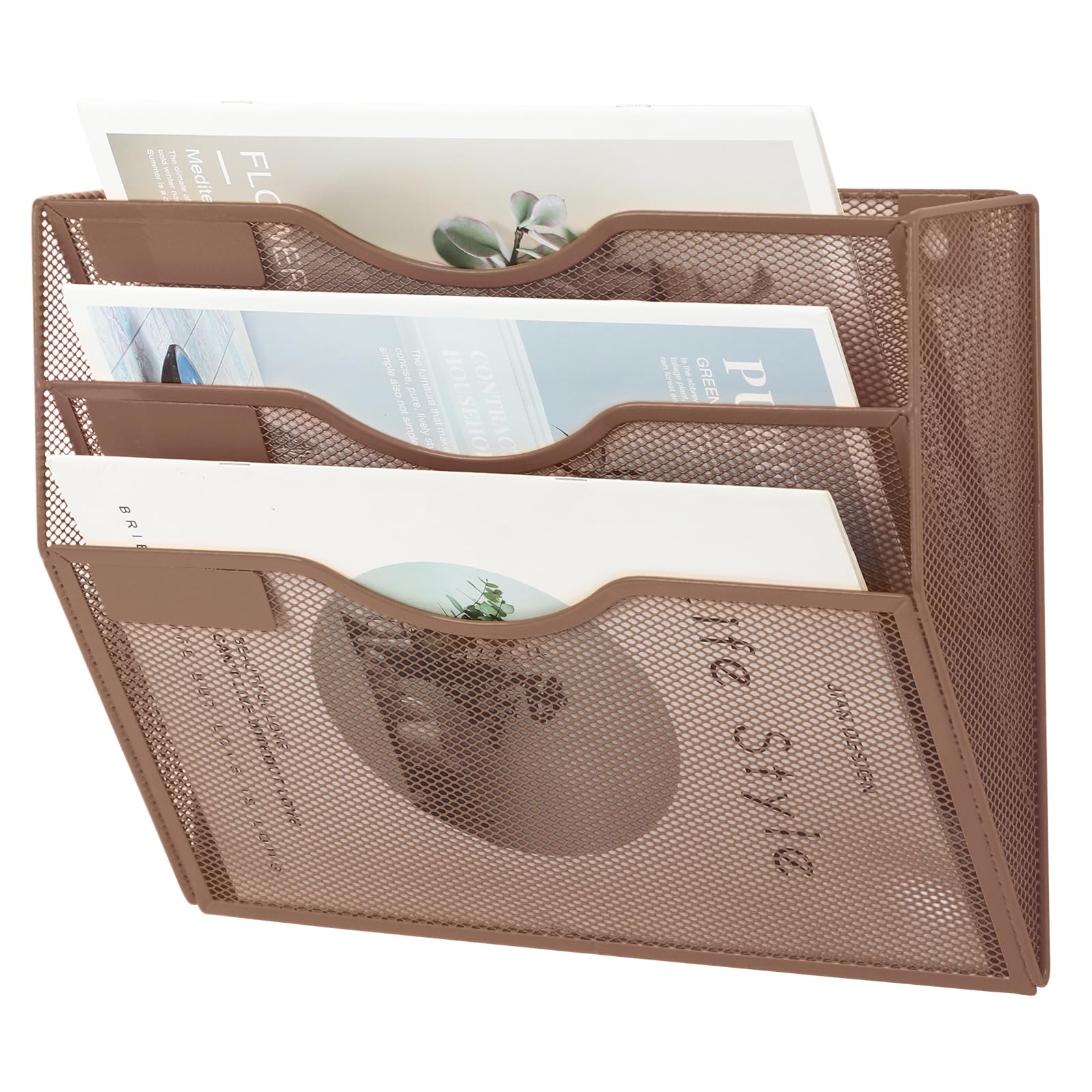EASEPRES 3 Pockets Wall File Holder Organizer Hanging Magazine Rack, Brown Organizer Your Files Get your papers, mail and stationery items in order by filing them tidily in our vertical mounted wall file holder. The stylish mesh arched design allows easy access to files and retrieval. Space Saving Separate your files and papers into 3 stacked tray levels with label panels allow for labeling contents of each slot so you know where all of your important paperwork and spare paper is stored. Each compartment can take letter paper sizes which is ideal for busy offices and work environments. Use our wall mount mail holder for letters, files, forms and worksheets.