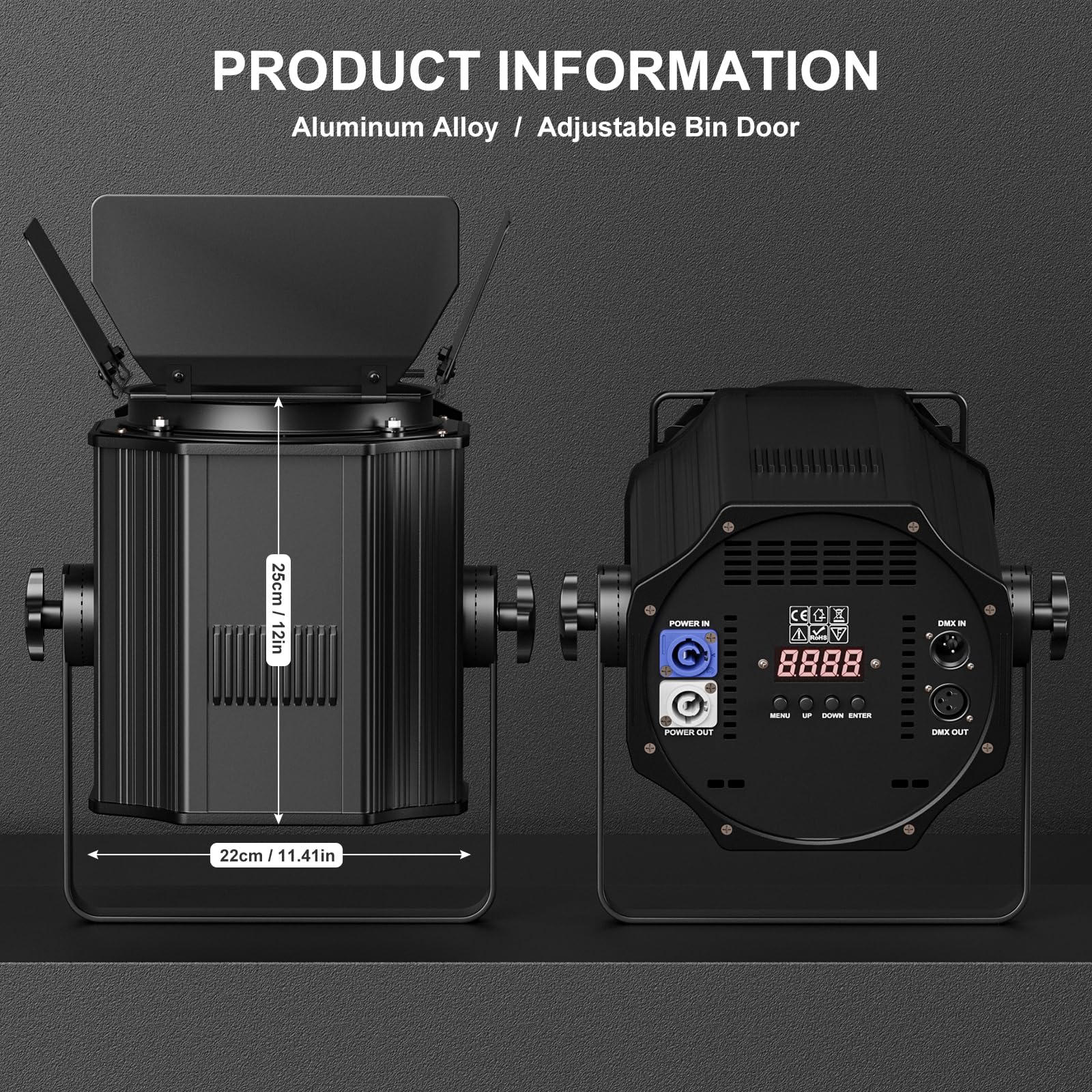 High Quality & Durable: Led party lights adopt aluminum chassis and barn doors design, effective prevention of aging and scratch-resistant. The dmx light equipped with intelligent temperature control monitoring system, effectively prolong the service life of the lights. The knob allows 360-degree adjustment of the handle