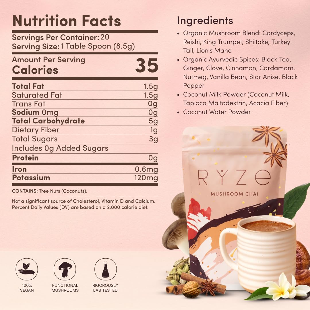 HEALTHY CHAI: Powered by 6 adaptogenic mushrooms and Ayurvedic Spices, RYZE Mushroom Chai gives you balanced energy, focus support, and immune support and even promote a healthy gut. If you like tea, you’ll LOVE this Chai
