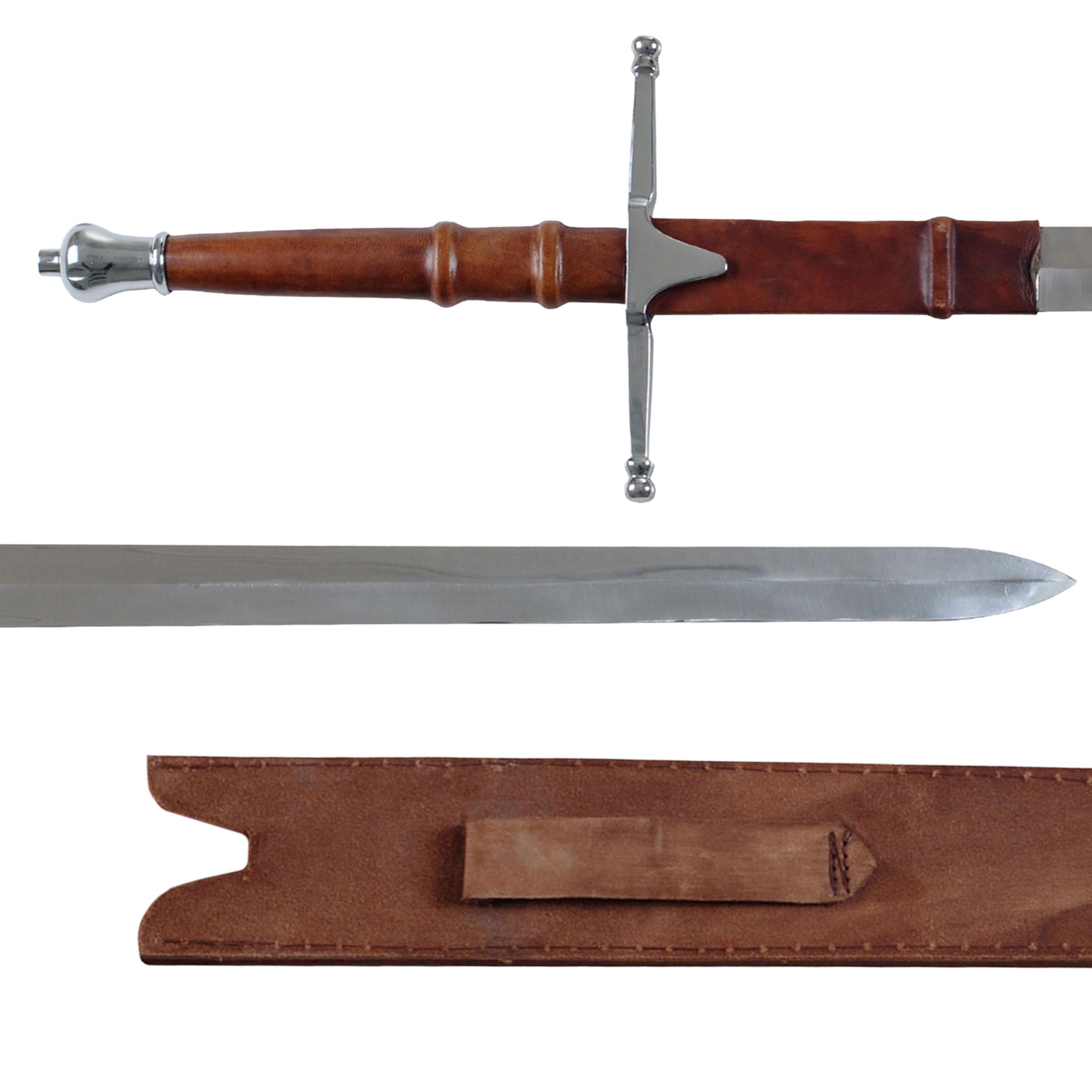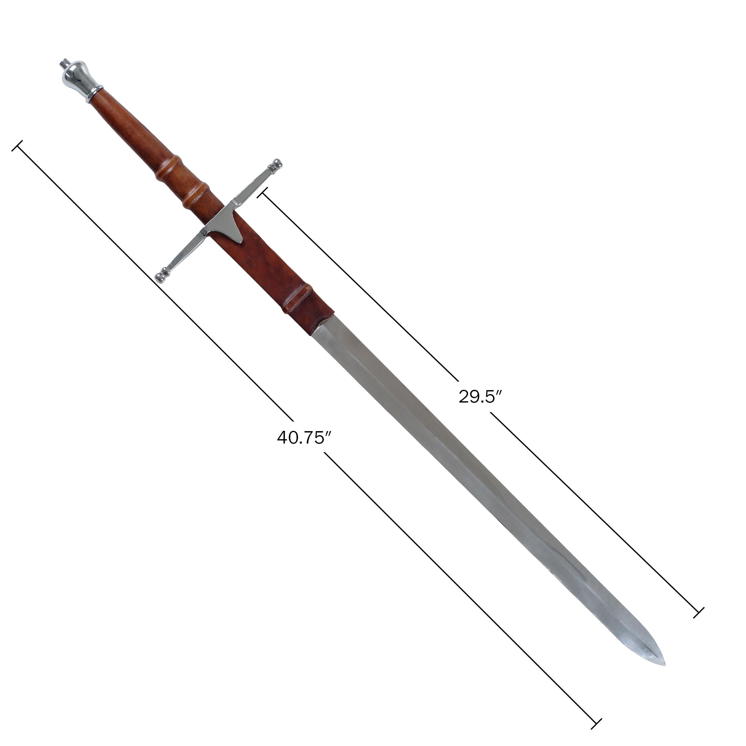 DURABLE CONSTRUCTION - The knight sword features a durable polished stainless-steel double-edged blade. The hilt and pommel on the broadsword are composed of polished metal, and the handle is wrapped in leather.