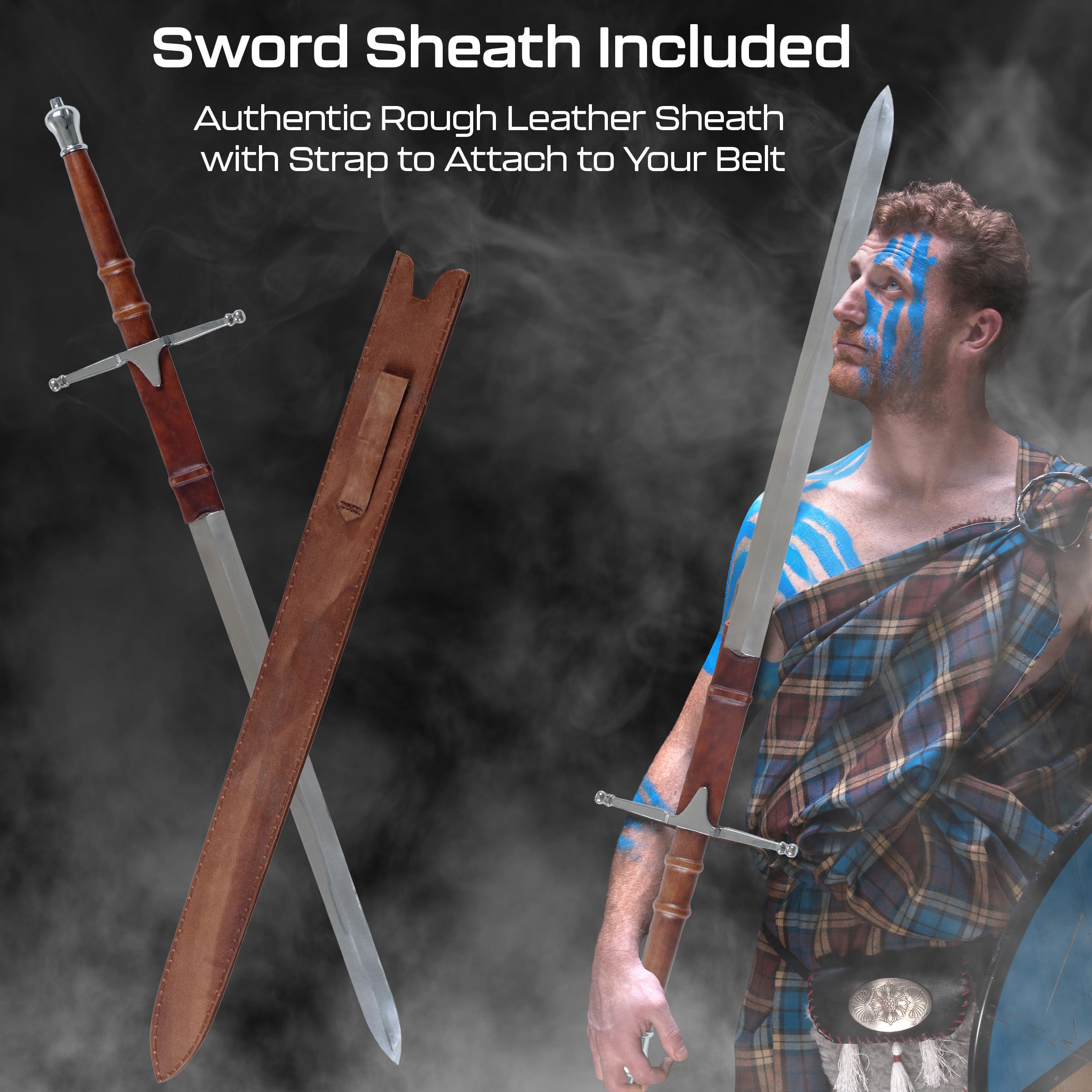 Reclaim your freedom with the authentic William Wallace Cosplay Sword by Whetstone. This real sword is a replica of the sword William Wallace wielded in the movie “Braveheart.” The blade is made of polished stainless-steel and is double-edged. The hilt and pommel are composed of polished metal, and the handle is wrapped in leather. The fantasy sword comes complete with an authentic rough leather sheath that includes a strap to attach this 40.75-inch sword to your belt. IMPORTANT: Whetstone is committed to providing the consumer with the absolute best price and value on all of our products. NOTE: This is an exclusive product of Whetstone and ONLY Swords Real Weapons by Whetstone are GUARANTEED to be genuine. Avoid buying counterfeit products and transacting with unauthorized sellers. Whetstone is a registered trademark protected by U.S. Trademark law and will be vigorously defended.