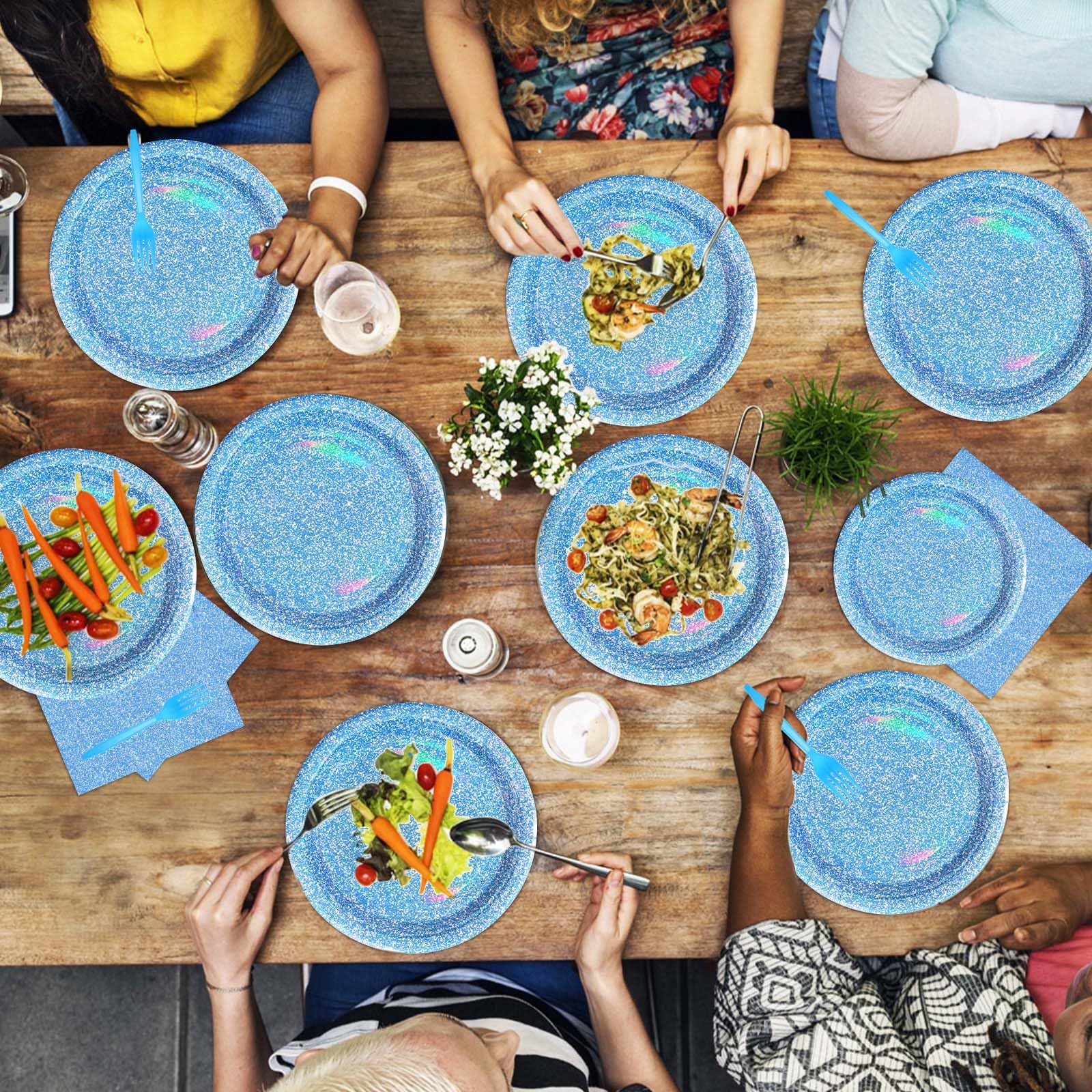 Holographic Rainbow Laser Design: Our blue plates and napkins use a combination of blue and white dots style, it's worth mentioning that we made a holographic rainbow laser coating design, in the light will show a rainbow of light, so that the surface of the plate is more dazzling, the charming iridescent design will surely leave a deep impression on the guests, so that your party shines (Tip: The laser effect is only more noticeable in a brightly lit environment)