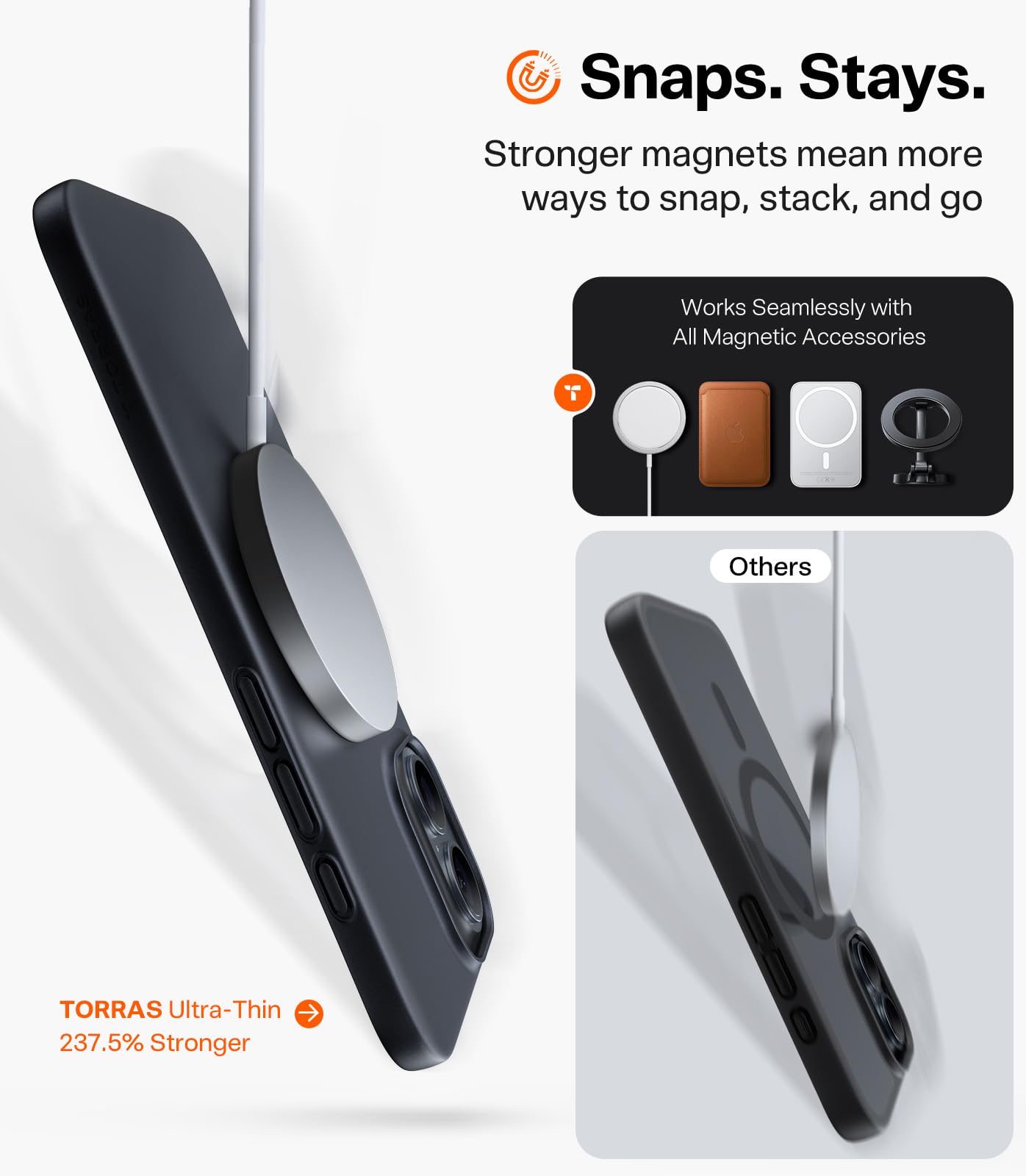 Compatible with MagSafe Accessories: Unlike typical magnetic cases, TORRAS Halbach Array tech keeps perfect alignment with MagSafe gear for iPhone 17. This slim case for iPhone 17 magnetic case takes charging speed to the next level, delivering faster, steadier power with your Qi-certified 20W charger. From wallets to car mounts, every snap feels effortless yet secure, giving you reliable convenience wherever life takes you.