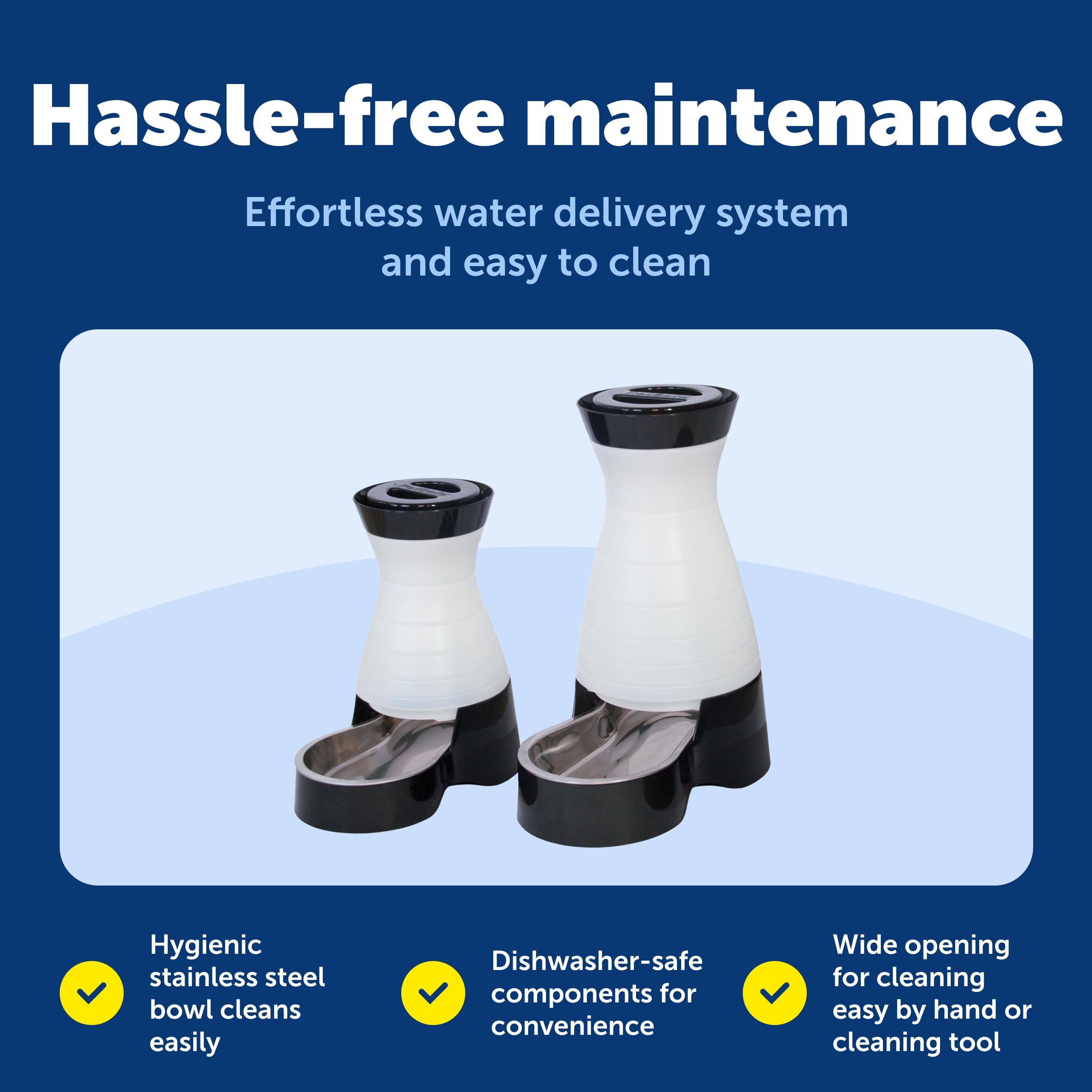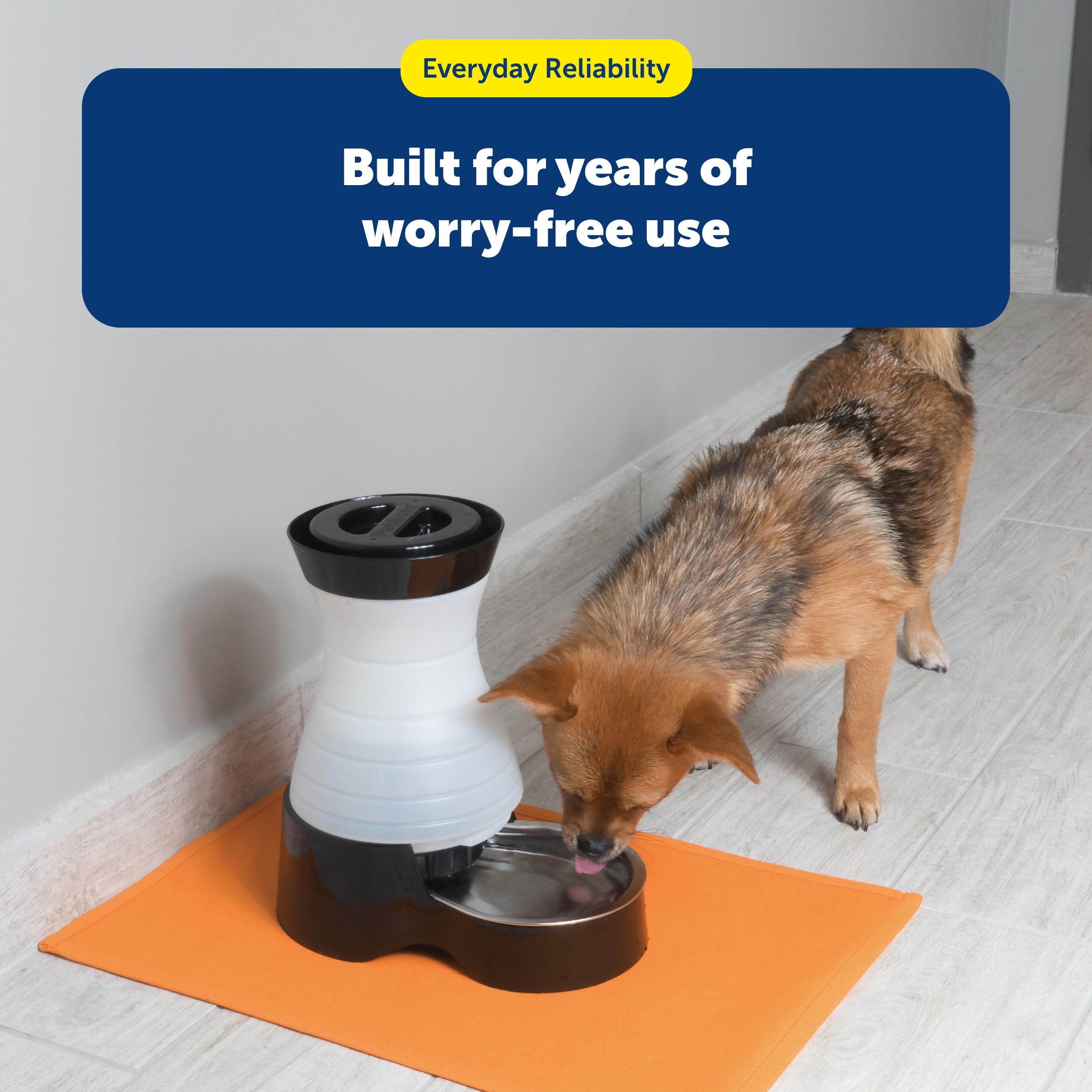 The PetSafe Healthy Pet Water Station will revolutionize your pets drinking water and your home environment. With this gravity water station, your pet gets fresh water, whenever he needs it, served in a stainless steel bowl. Refill the reservoir with water and watch the bowl automatically fill up with fresh, filtered water. The water station disassembles for easy cleaning and the removable, stainless steel bowl is dishwasher safe.