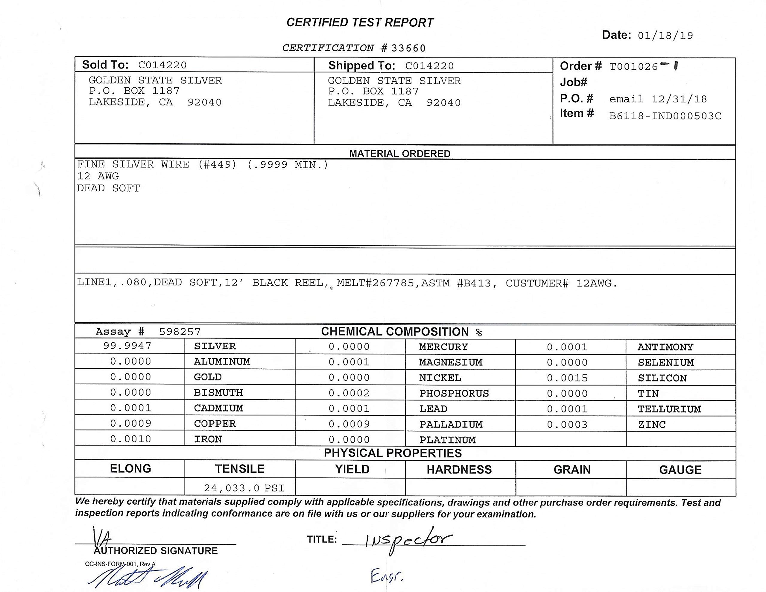 This is a set of two 150mm (5.9 inch) Rods of 99.99% Pure Silver Wire in 12 Gauge (0.080 in. / 2.03 mm diameter). These silver wire rods are ideal for use in your home Colloidal Silver Generator. The temper of this wire is Dead Soft. Guaranteed to be 99.99% Pure Silver, or better. A copy of the Certification of Assay (Purity Analysis) will be included with every order.