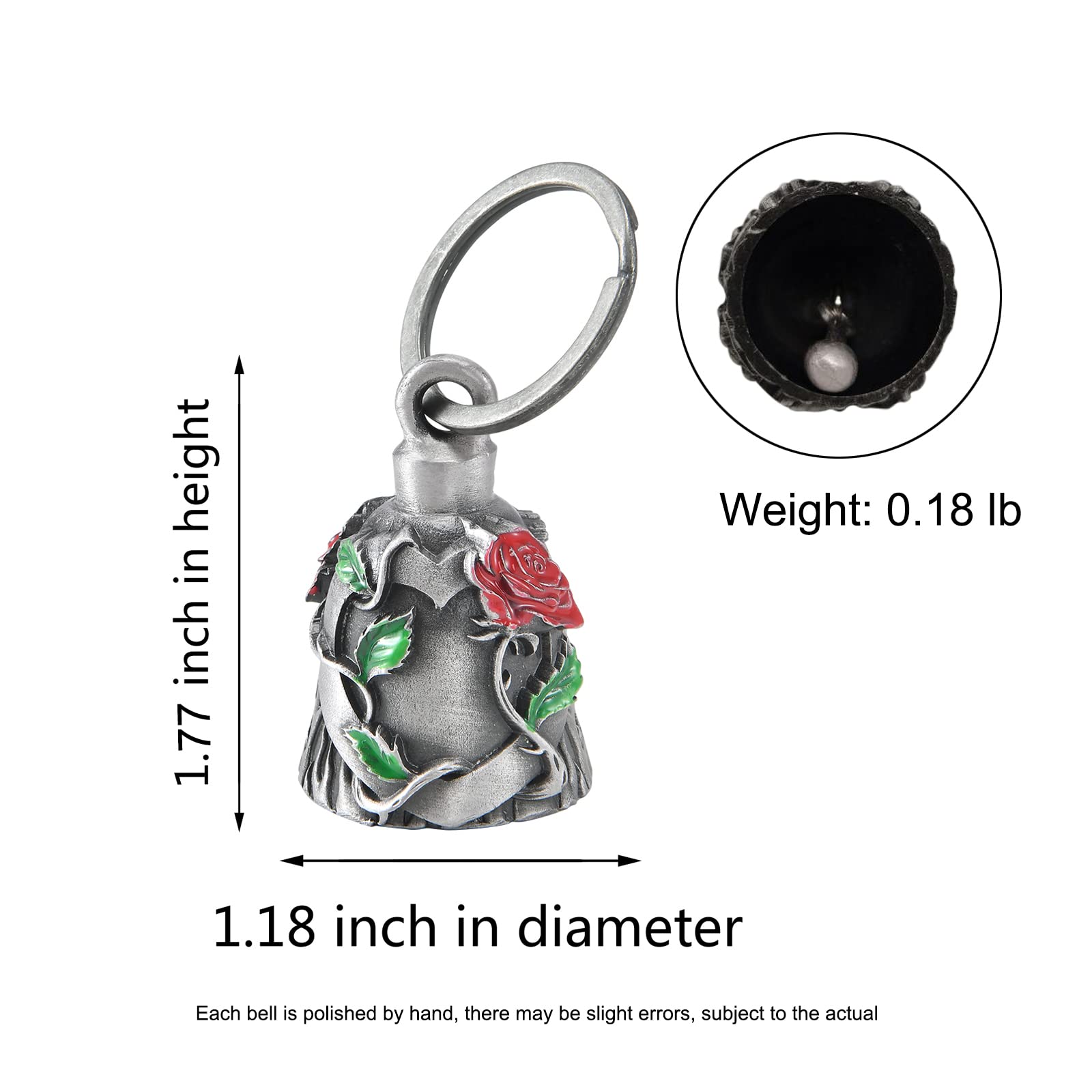 [Size] The motorcycle bell is 1.18 inch in diameter, 1.77 inch in height, and the clasp is 1.18 inch in diameter. The weight of the bell is 0.18 lb. You‘ll receive a delicate bell, a black hanger, a motorcycle bell legend note card, and a 2.75" x 3.62" velvet drawstring black bag. Various exquisite patterns are available according to your personal preferences.