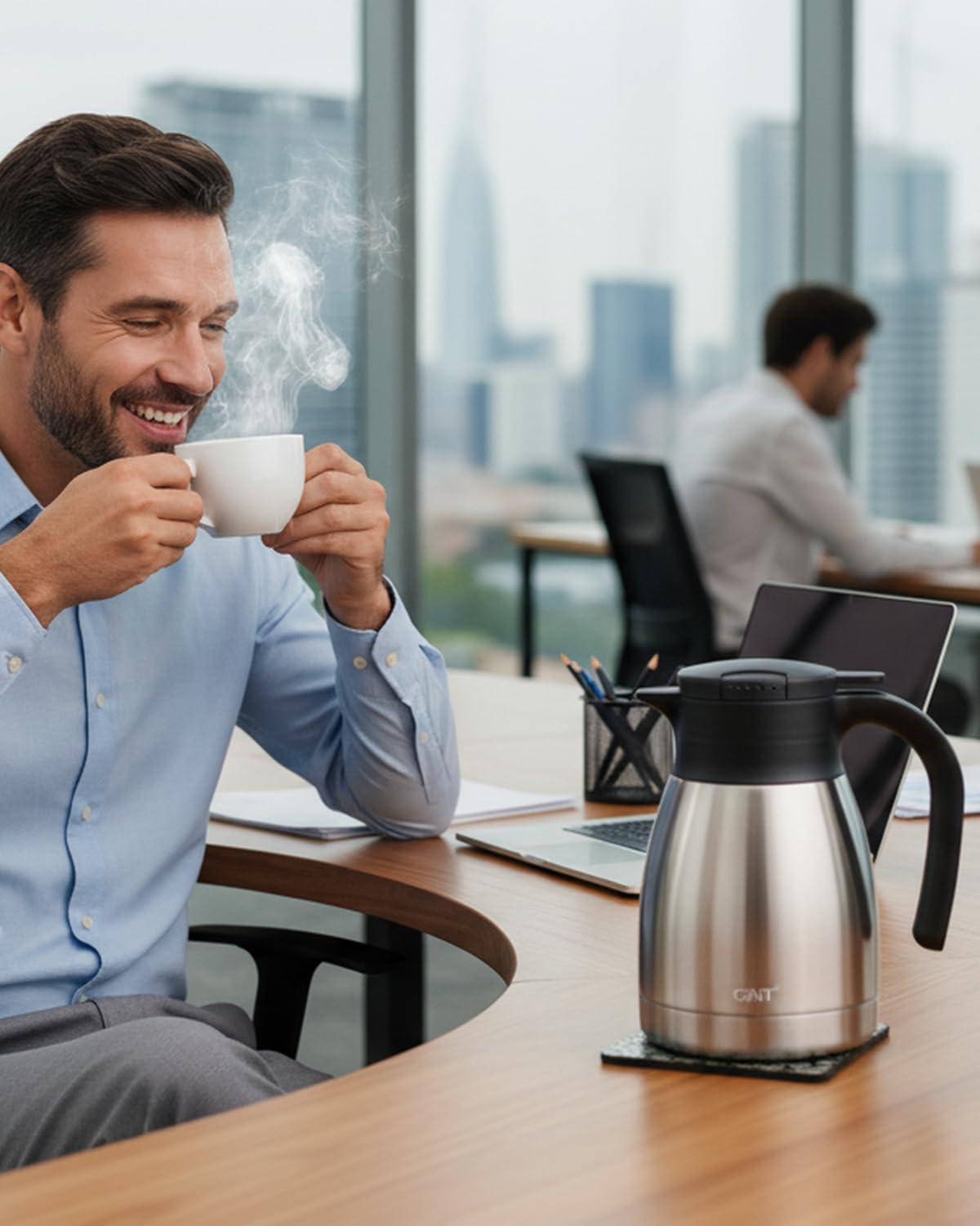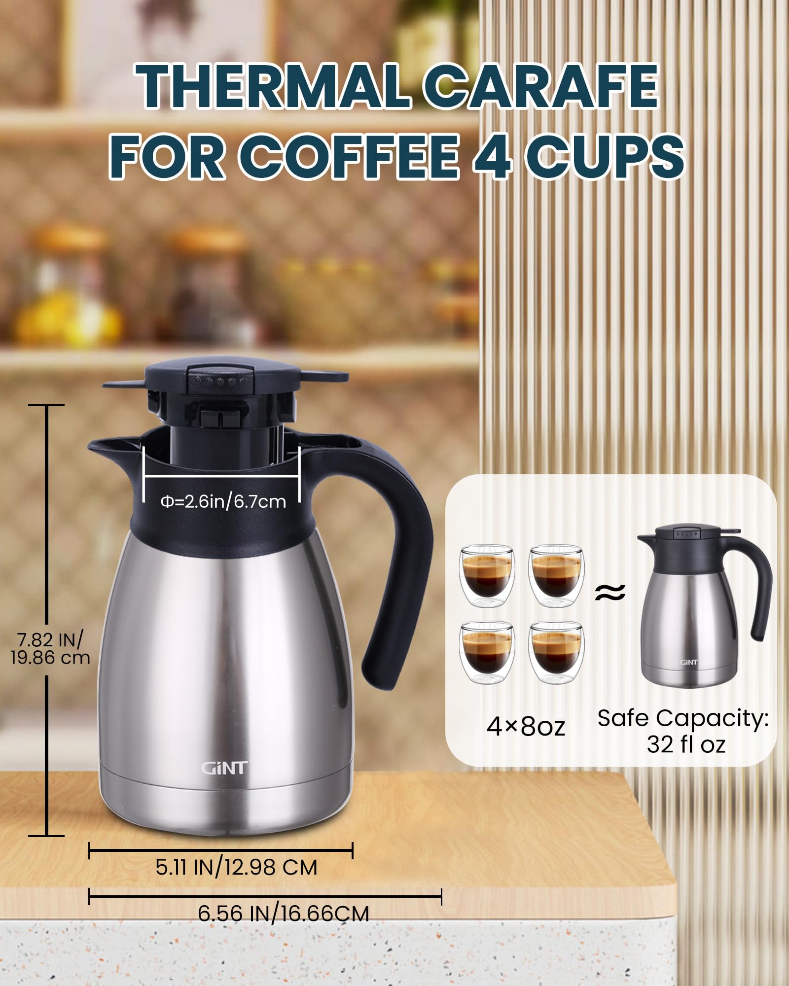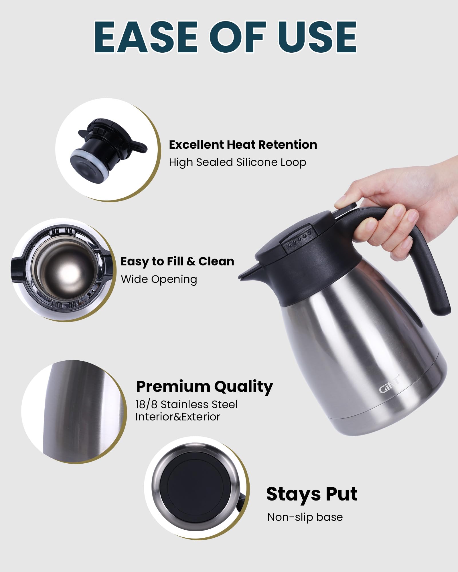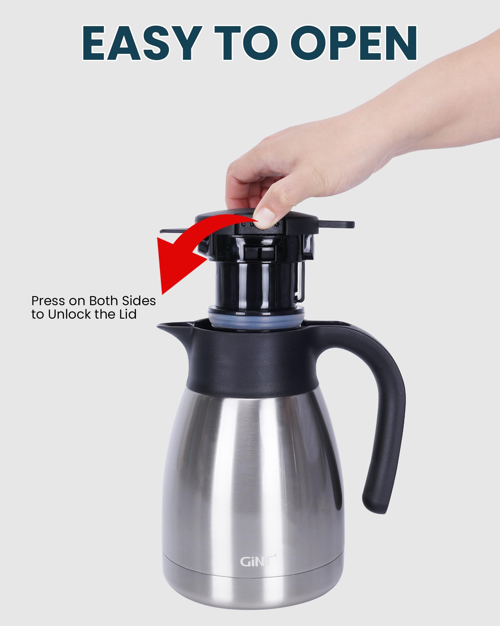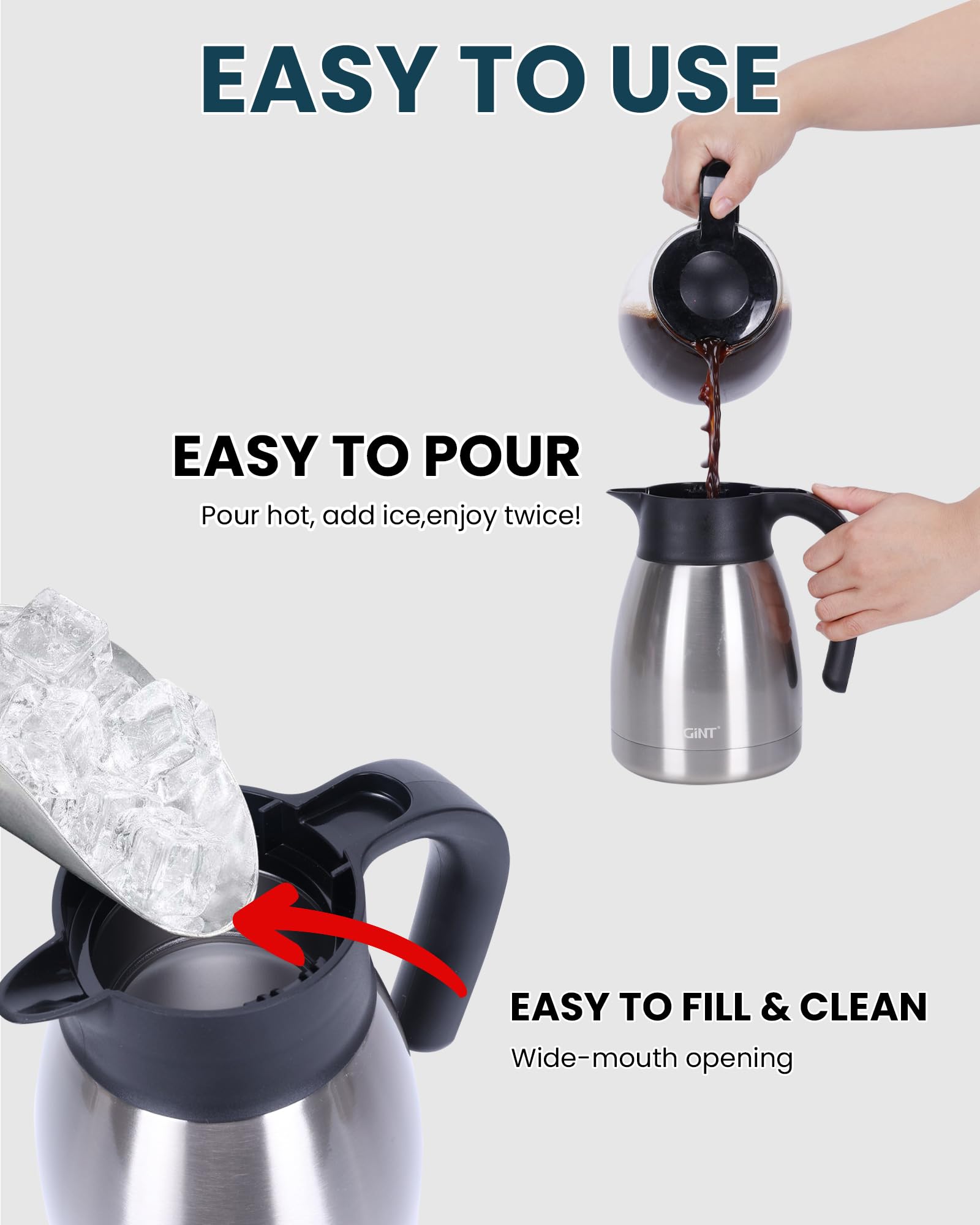 USER FRIENDLY: GiNT 34oz thermal carafe features extra wide top opening, easy for cleaning and adding ice cubes; Simple-push button enables single-hand pouring without leaking, dripping or spilling; Ideal used for bedside, restaurant, office, party, camping, travel insulated coffee carafes.