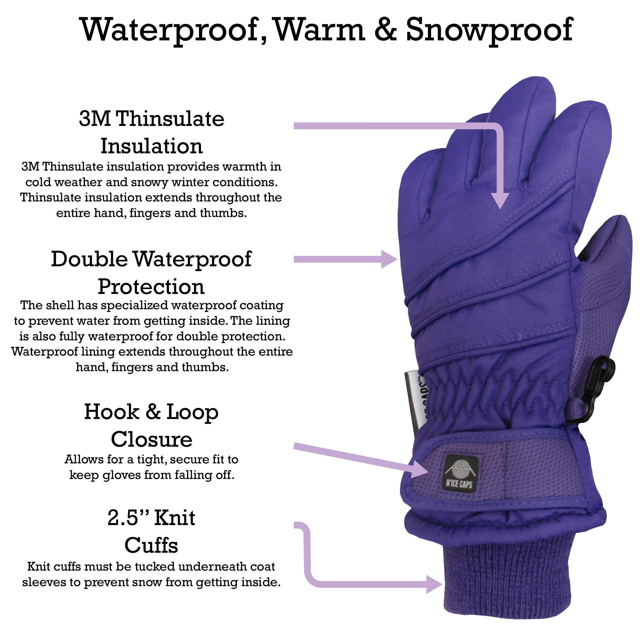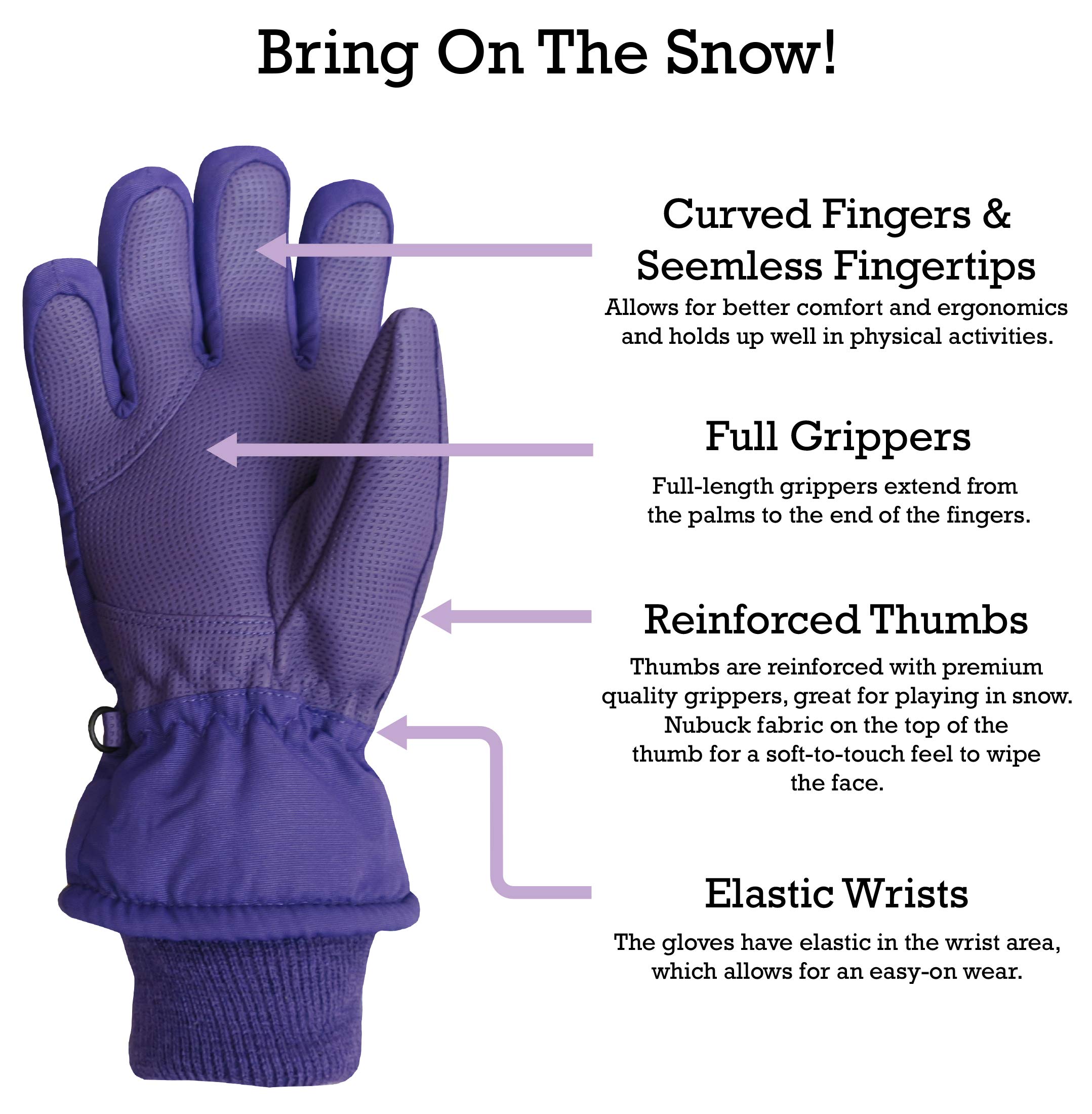 WATERPROOF, WARM AND SNOW-PROOF: The children's snow gloves are insulated with 3M Thinsulate for warmth in cold weather. The youth gloves are fully waterproof and keep hands dry in wet, snowy and icy conditions