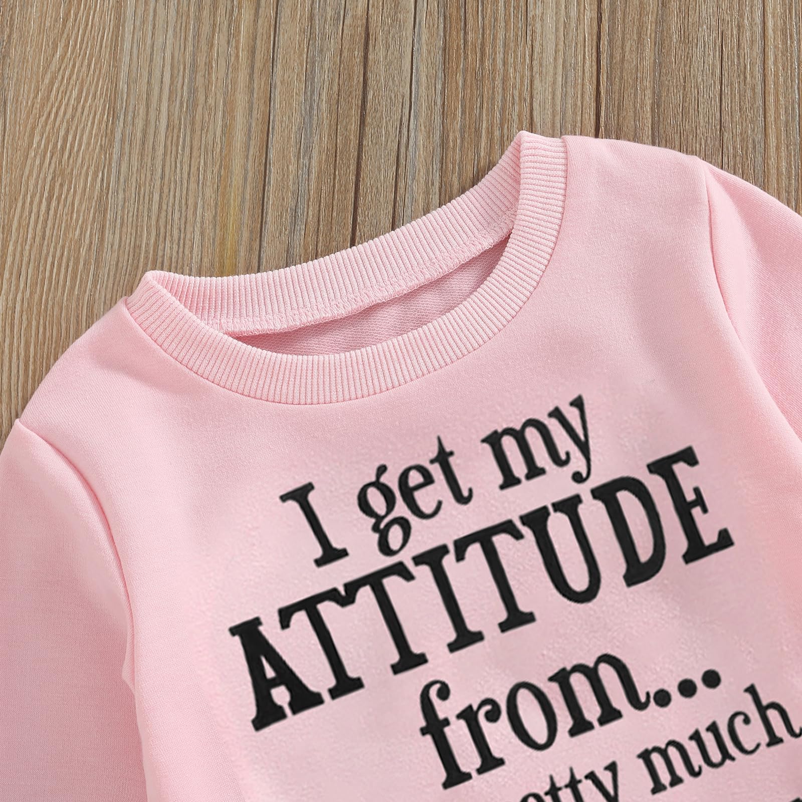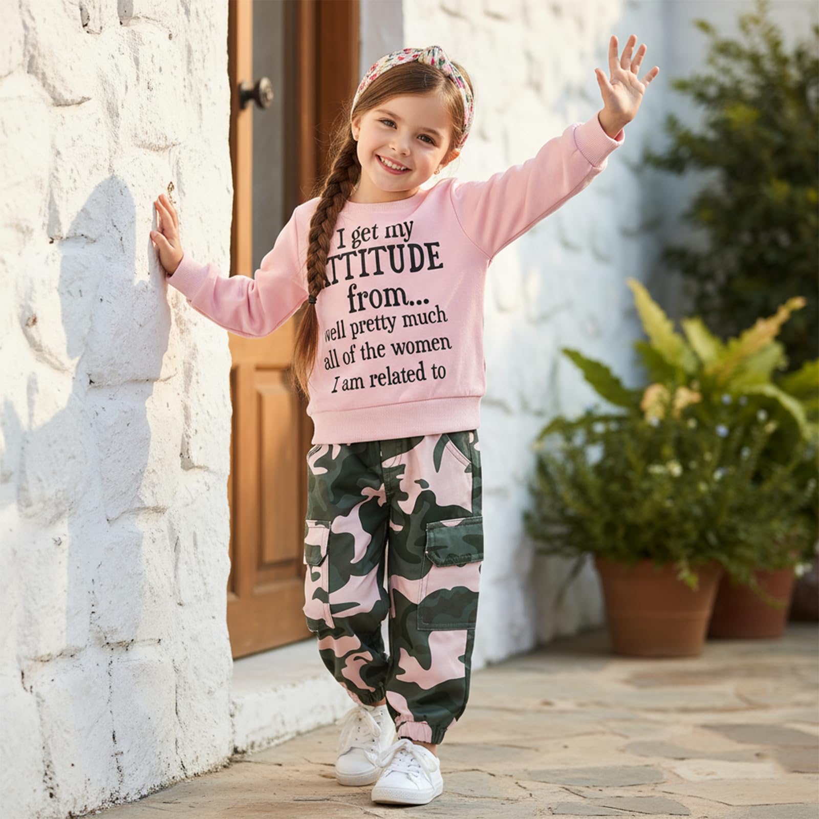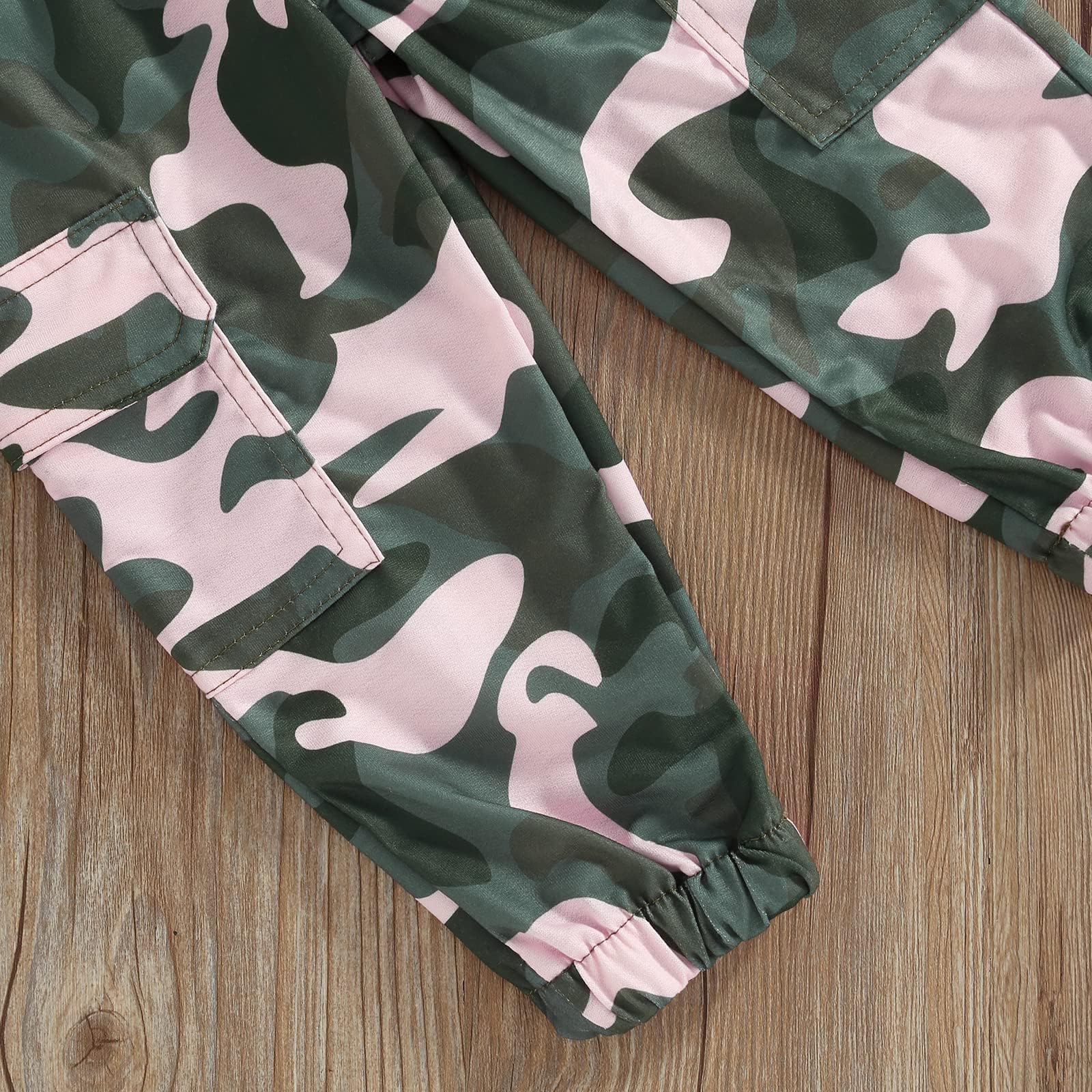 ♥Design: Baby girl fall outfits, pullover sweatshirt features letter print, long sleeves and a round neck. Trousers feature camouflage print and pockets.