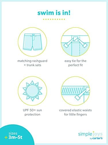 Description Keep him safe and stylish by the water with this 2-Piece Boysβ Rashguard Swim Set from Simple Joys by Carterβs, featuring both long and short-sleeve tops and coordinating swim trunks. Crafted with UPF 50+ sun protection, this set keeps your little adventurer shielded from harmful UV rays as he plays. The long-sleeve rashguard includes a convenient quarter zip for easy dressing and added ventilation, while the short-sleeve top offers lightweight coverage. Both tops come in vibrant colors and playful prints that make a splash at the beach or pool! Designed with comfort in mind, each piece has a tagless neck for a smooth fit, helping prevent irritation so he can stay comfy all day. The swim trunks feature an elastic waistband for a secure fit, making this set an easy, go-to choice for sunny days by the water.