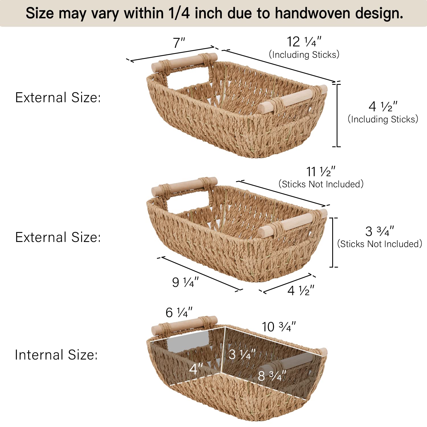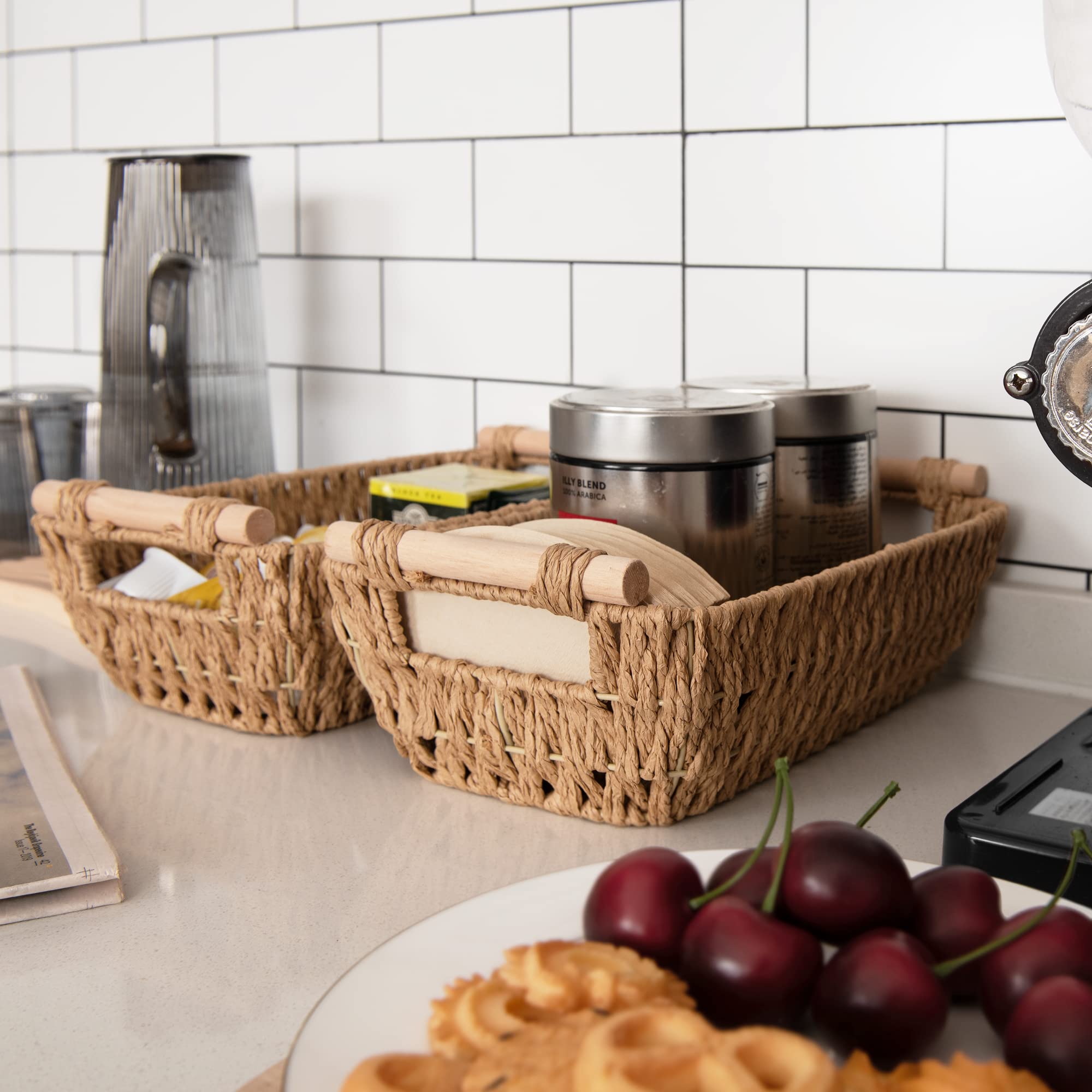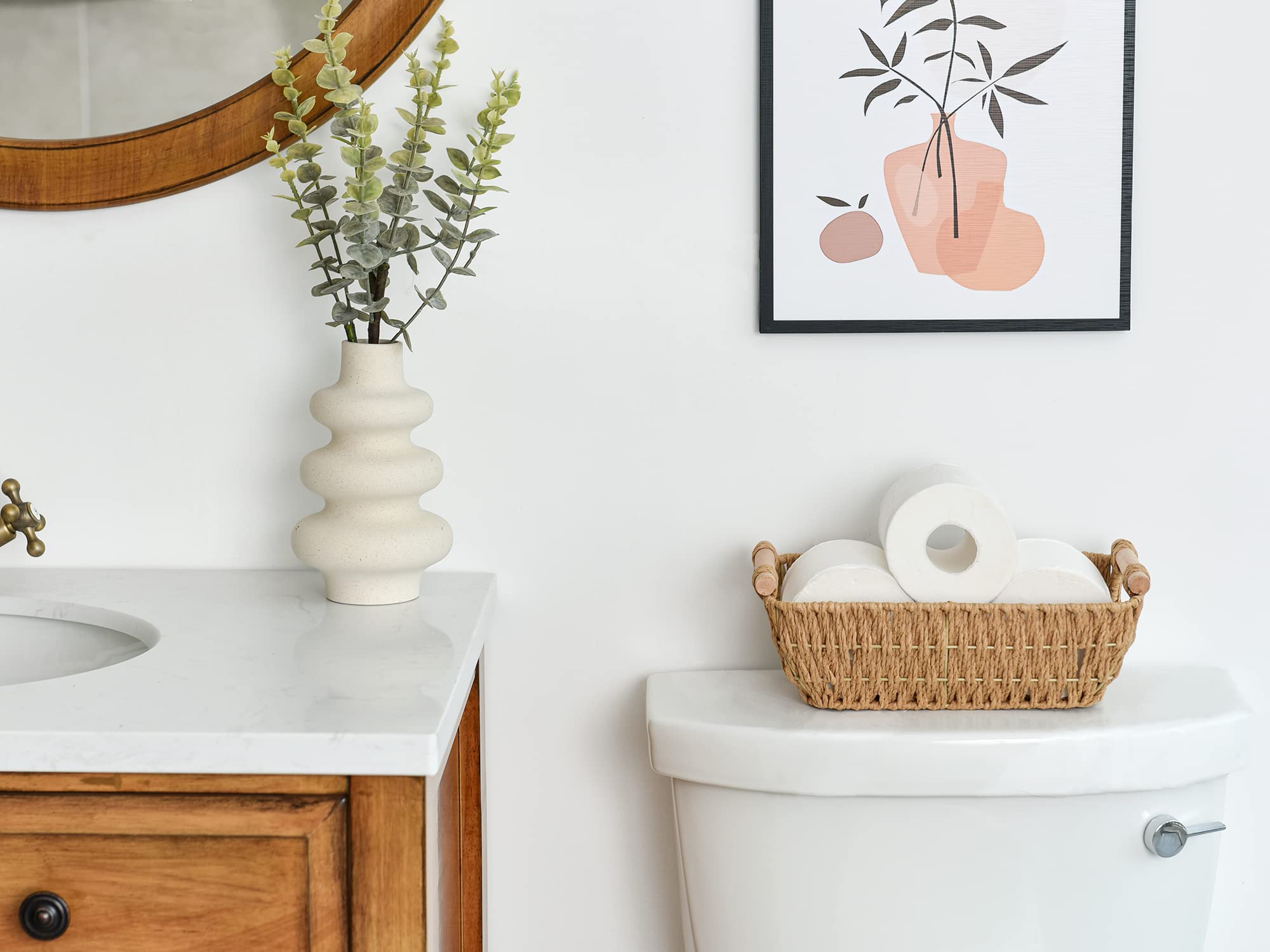 Versatile woven baskets for toilet paper, hand towels, toiletries in bath, or spices, canned foods in kitchen.