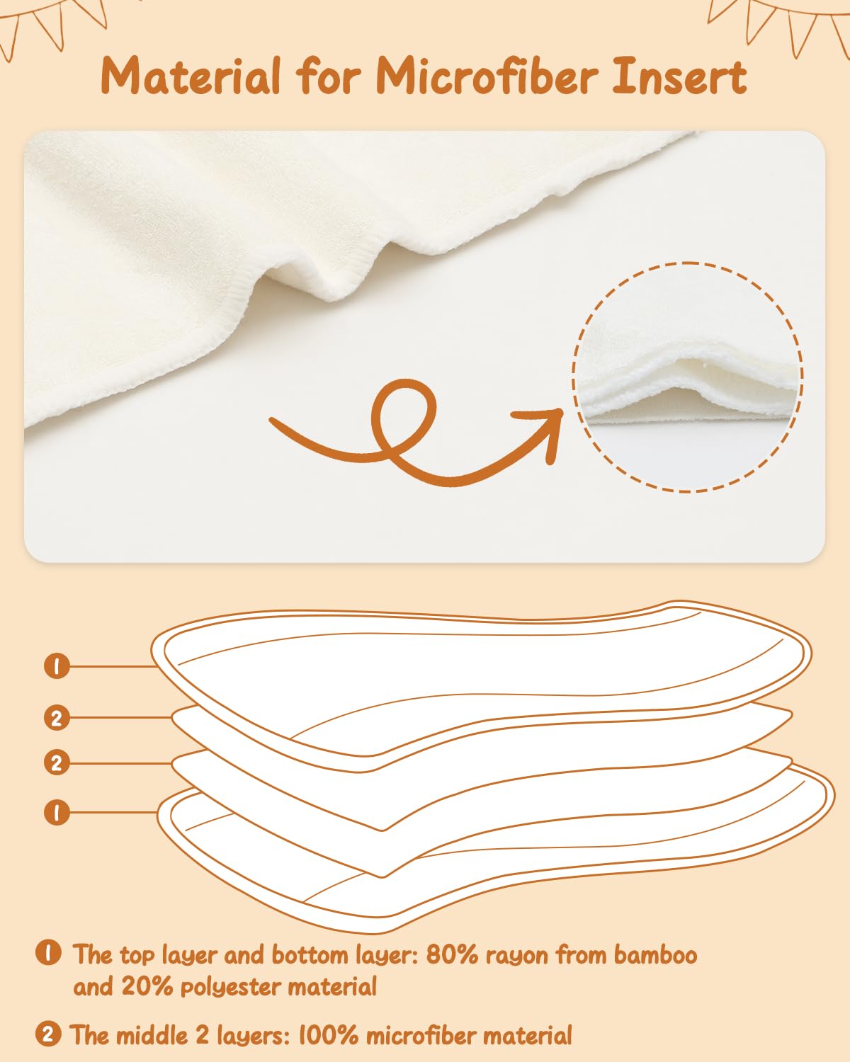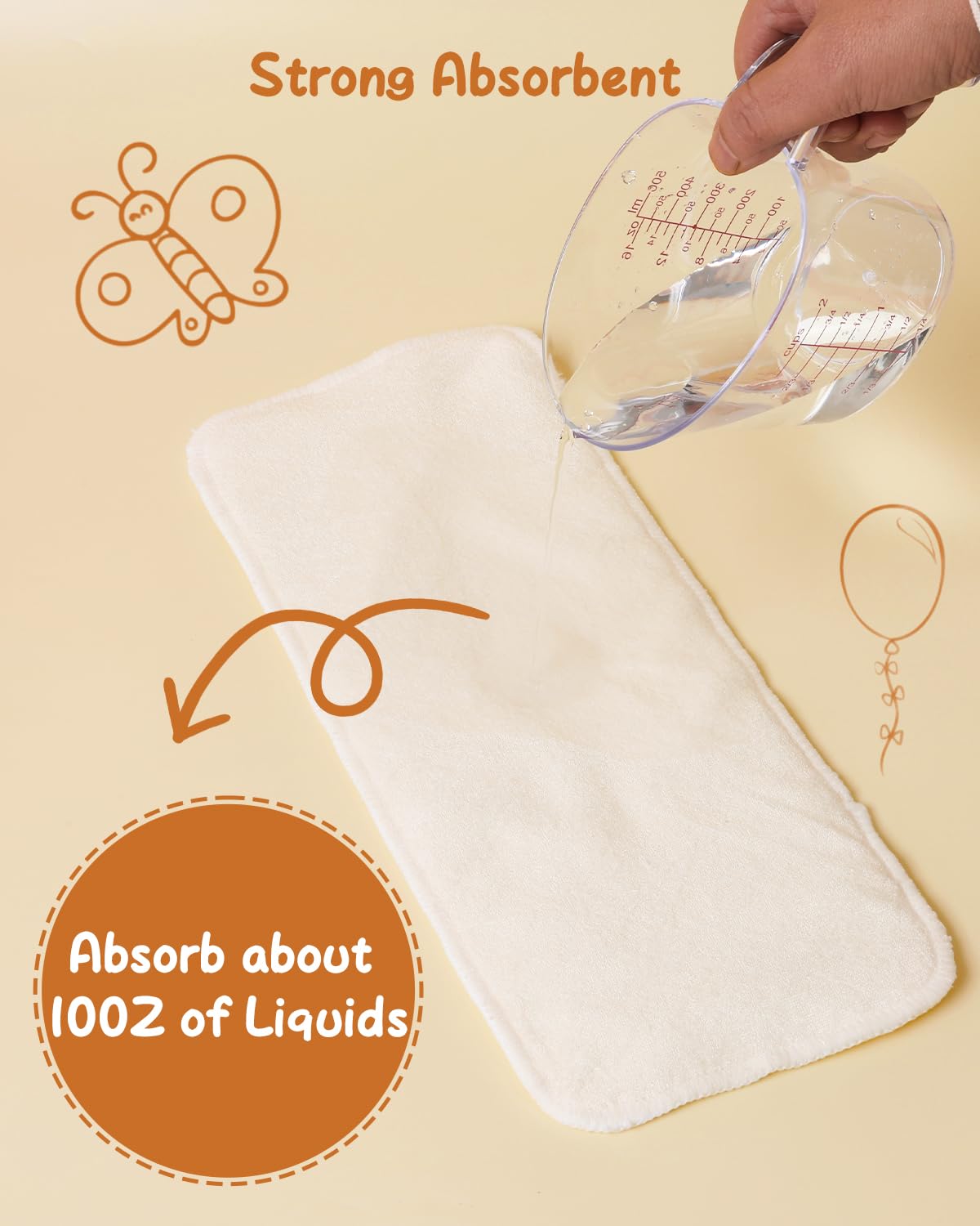 Super Absorbent and Soft: The inserts are made of 2 layers of rayon from bamboo fiber outer layer and 2 layer of microfiber inner layer, 71.3% rayon derived from bamboo and 28.7% polyester. The strong absorbent material with breathability and softness is gentle on your babies' bottom, keeping your baby dry and comfortable. They will become more absorbent when they are washed.
