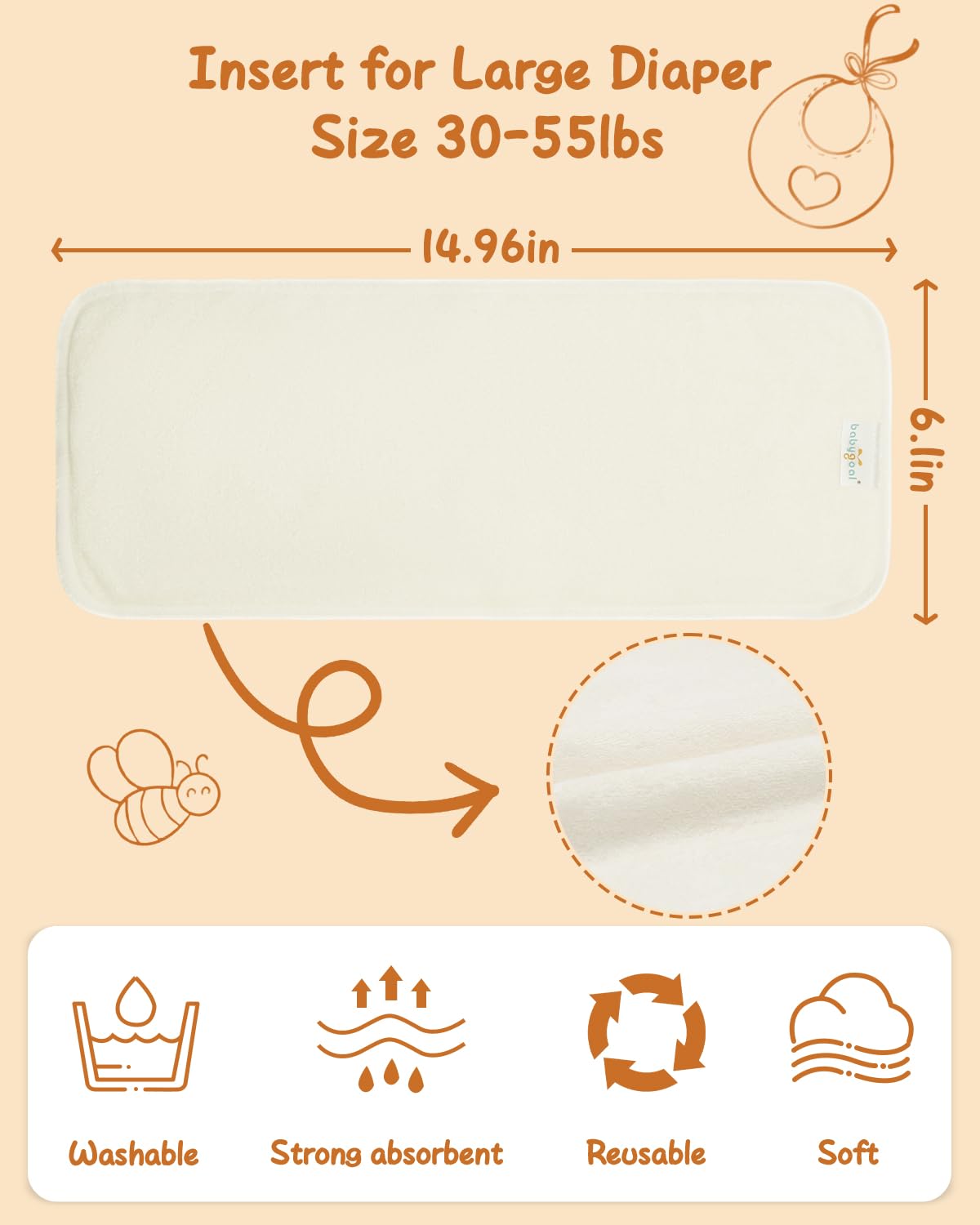 Economical & Reusable: Cloth diapers with inserts are less expensive than disposable diapers and reduces less waste. They fit for babygoal large size pocket cloth diapers.