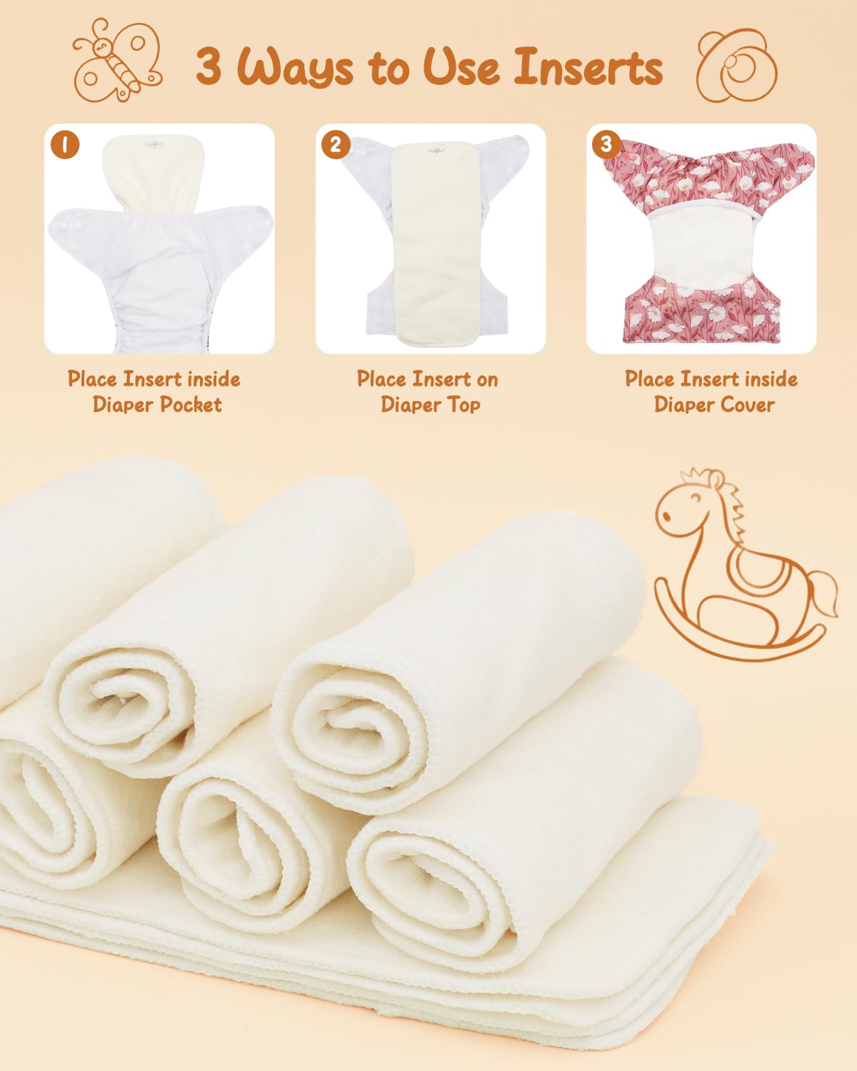 High Quality: These inserts are made from breathable rayon from bamboo, they can reduce static electricity and you can use 2pcs inserts in the cloth diapers for overnight use. They are reusable and fully machine washable, change inserts according to the amount of urine, better to change every 2-3 hours.
