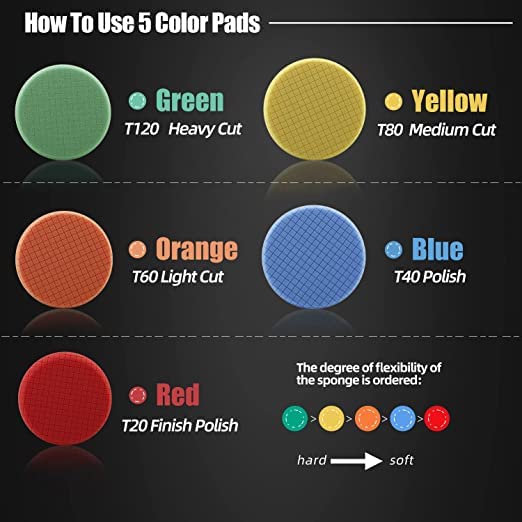 ◆Compounding & Polishing & Waxing◆ There are five different colors of the sponge pad : Green/Yellow For Heavy Cut ,Orange For Medium Cut ,Blue For Light Cut ,Red For Finish Polish and Waxing, Great for removing sun abuse, car scratches, headlight wearing and etc. Green/Yellow Heavy Cut pad suitable for removing oxidation coating and moderate to light scratches. Orange polishing pad for removing sun abuse and swirl mask. Blue pad for polish, The red for finish polishing and waxing.