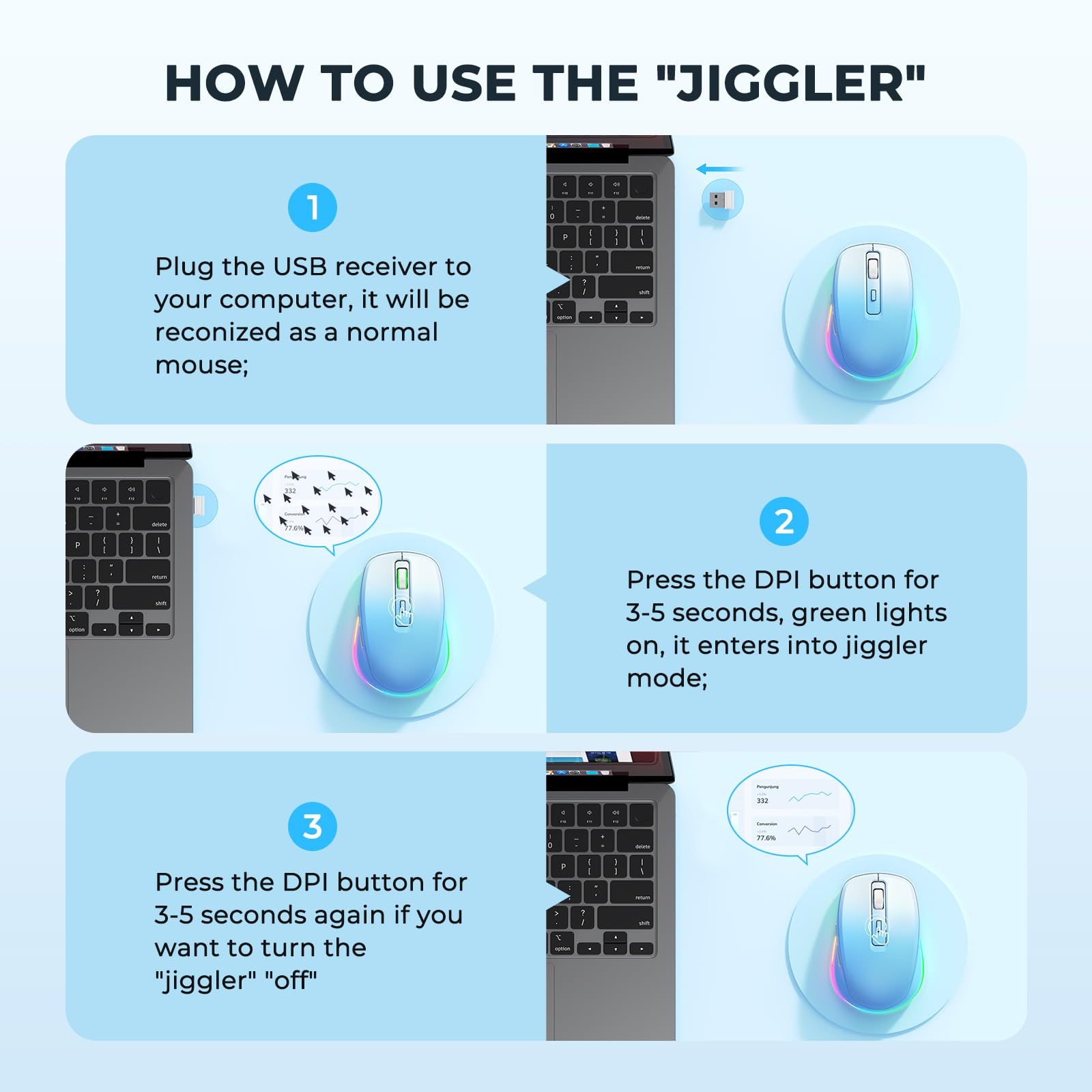 Light Up Mouse & Mouse wiggler 2 In 1 -- If you working from home and was tired of being a slave to your computer, this mouse and jiggler in 1 could be your choice, just press and hold the DPI button 3-5seconds to set it on jiggler mode to keep your computer from locking when you have to step away