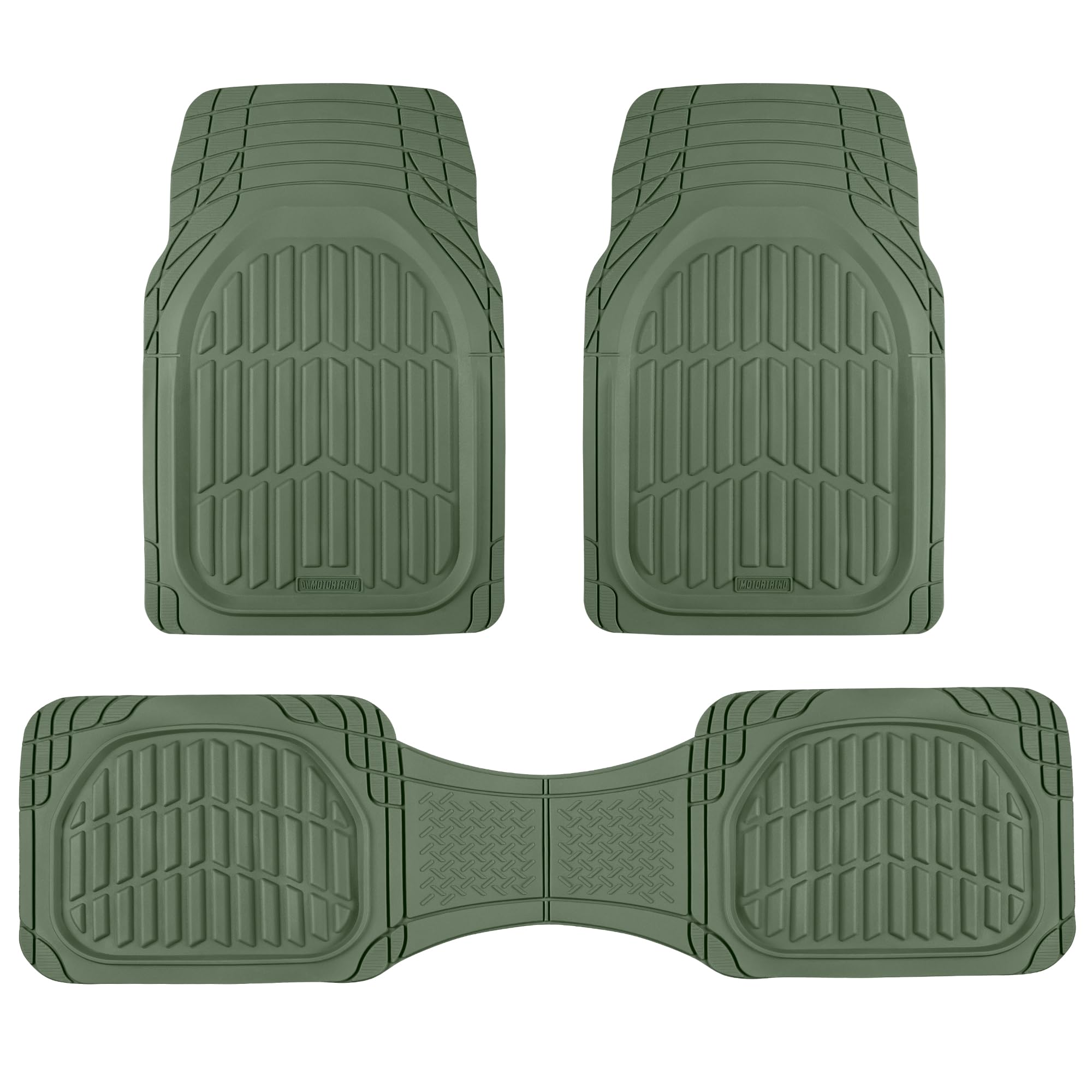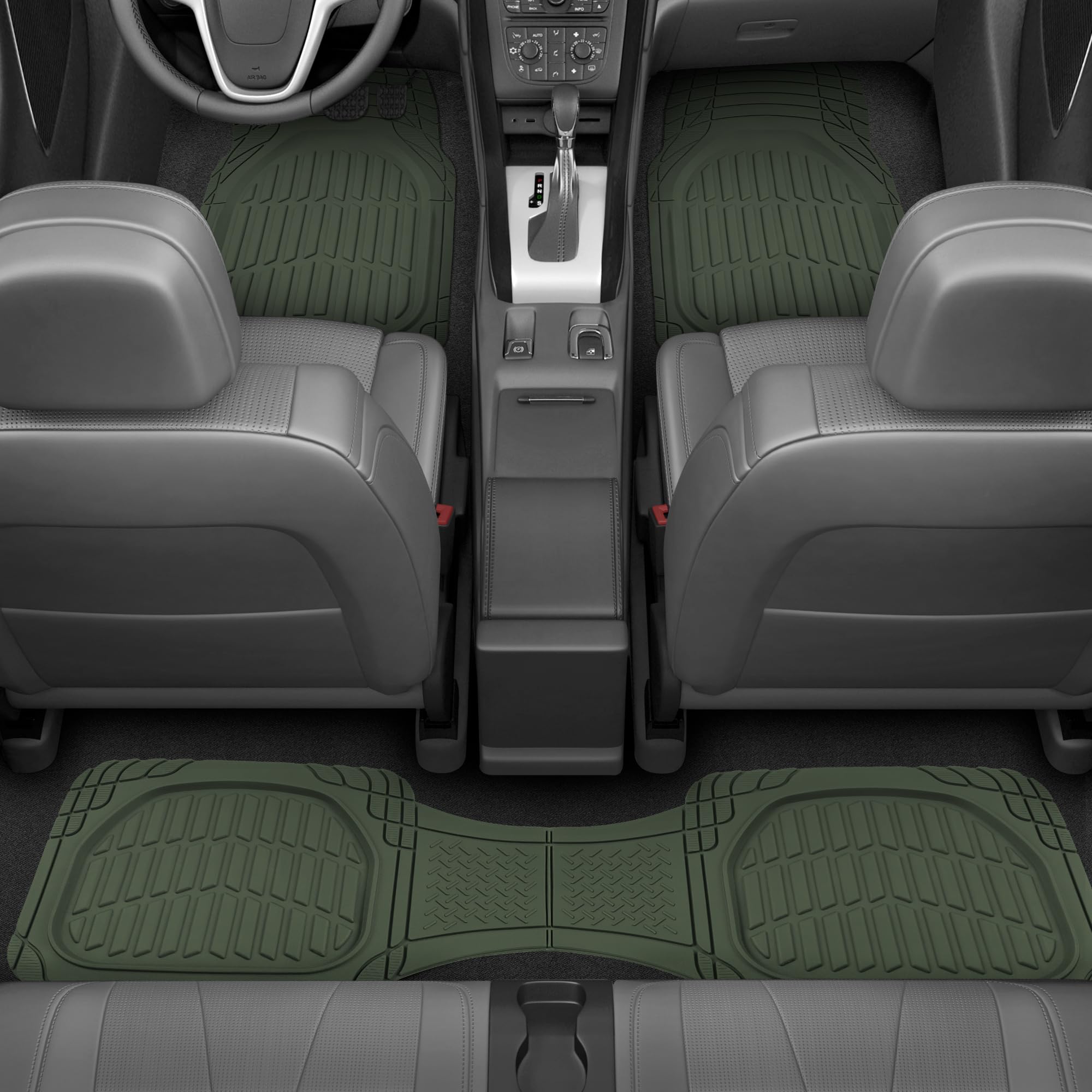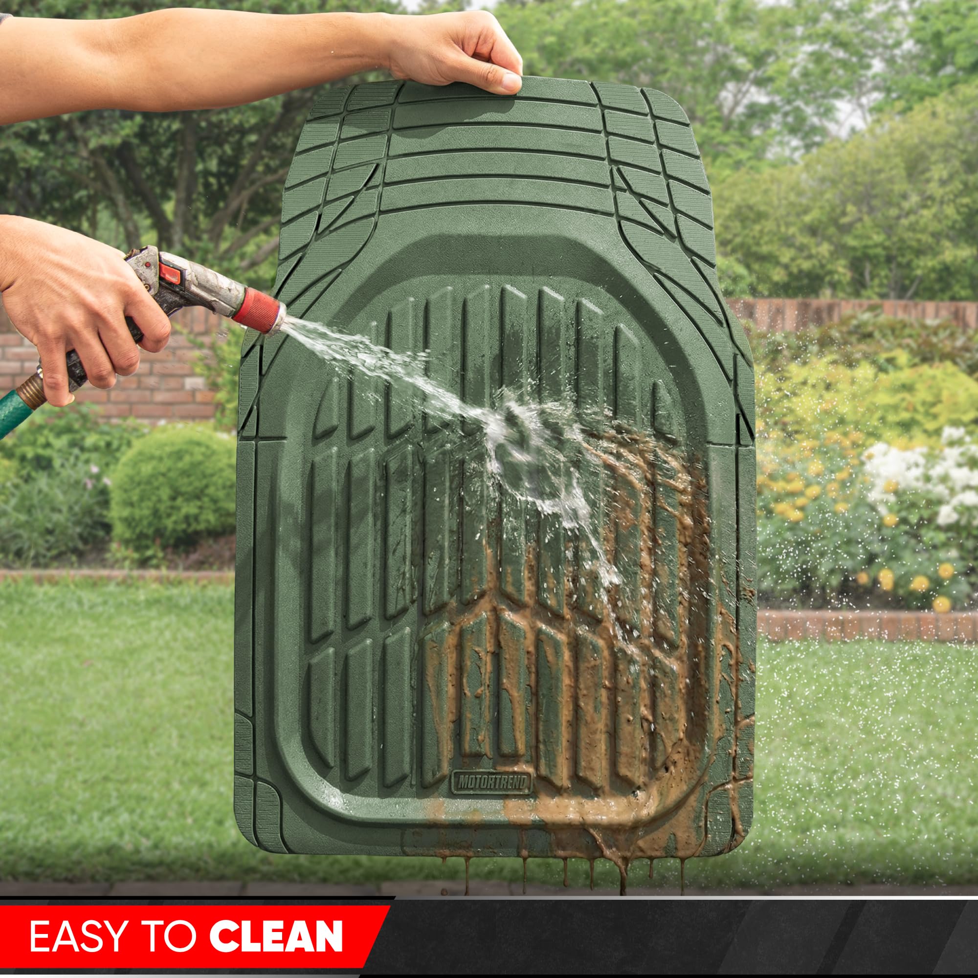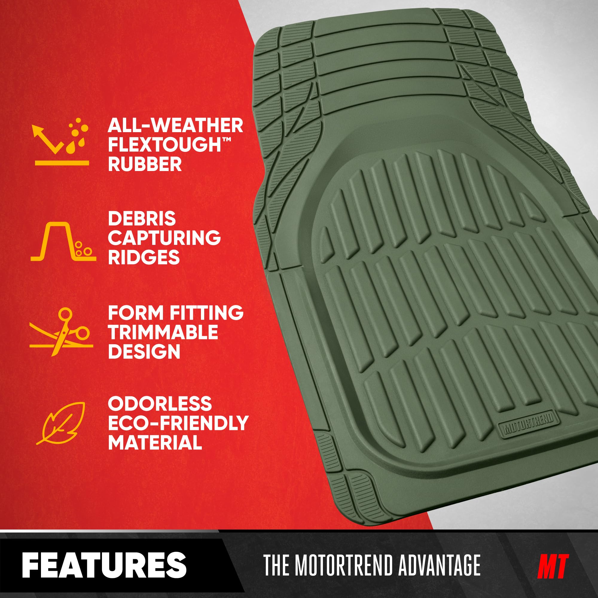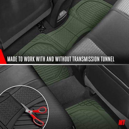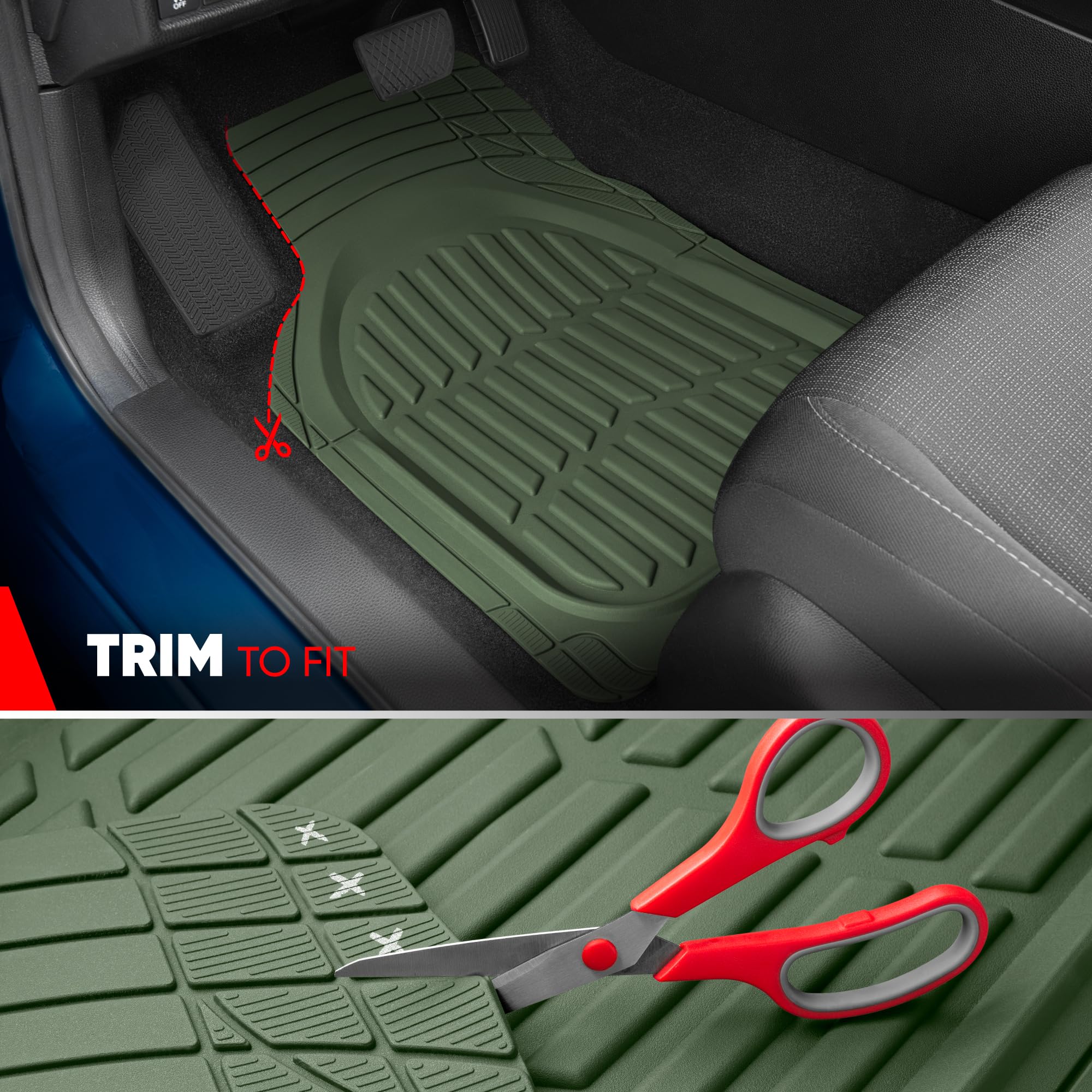 Motor Trends FlexTough Heavy Duty Universal cut-to-size automotive floor liners offer practical interior floor carpet coverage for daily driving and harsh road conditions. These flexible rubber car mat liners are designed to be trimmed with scissors for a precise fit in driver and passenger footwells. Textured tread patterns help capture sand, gravel, pet hair, and moisture before it reaches vehicle carpeting. The Protective floor liners also reduce wear from shoes, work boots, and outdoor gear while helping maintain resale value. Ideal for commuters, rideshare vehicles, work trucks, and family cars, these car floor mats all weather provide dependable traction underfoot and help prevent sliding during entry and exit. Universal Trim-to-Fit means that these floor mats will fit a wide variety of vehicles such as: Compact Sedans, Trucks & SUV: Toyota Corolla, Honda Civic, Nissan Sentra, Hyundai Elantra, Kia Forte, Mazda3, Ford Maverick, Volkswagen Jetta, Chevrolet Cruze, Chevy Trax, Ford Focus, BMW 320i, 330i, 330e and Subaru Impreza. Midsize Sedans: Toyota Camry, Honda Accord, Nissan Altima, Dodge Charger, Hyundai Sonata, Kia K5 (Optima), Mazda6, Chevrolet Malibu, Ford Fusion, Subaru Legacy, Mercedes, Lexus, and Volkswagen Passat. Compact and Midsize SUV: Toyota RAV4, Toyota 4Runner, Honda CRV, Nissan Rogue, Ford Escape, Ford Bronco, Chevrolet Equinox, Jeep Cherokee, Jeep Patriot, Jeep Wrangler, Mitsubishi Outlander, Hyundai Tucson, Hyundai Santa-Fe Kia Sportage, Kia Sorento, Mazda CX5, and Subaru Forester, Crosstrek and Outback. Full-Size SUVs and Trucks: Chevrolet Silverado, Ford F-150, Toyota Tacoma, Toyota Tundra, GMC Sierra, Nissan Frontier, Chevrolet Colorado, Chevy Silverado, Dodge Ram, Ford Ranger, and Honda Ridgeline, Chevy Tahoe, GMC Yukon, Ford Explorer, Jeep Grand Cherokee, Toyota Highlander, Honda Pilot, Nissan Pathfinder, Chevrolet Suburban, Kia Telluride, and Hyundai Palisade.