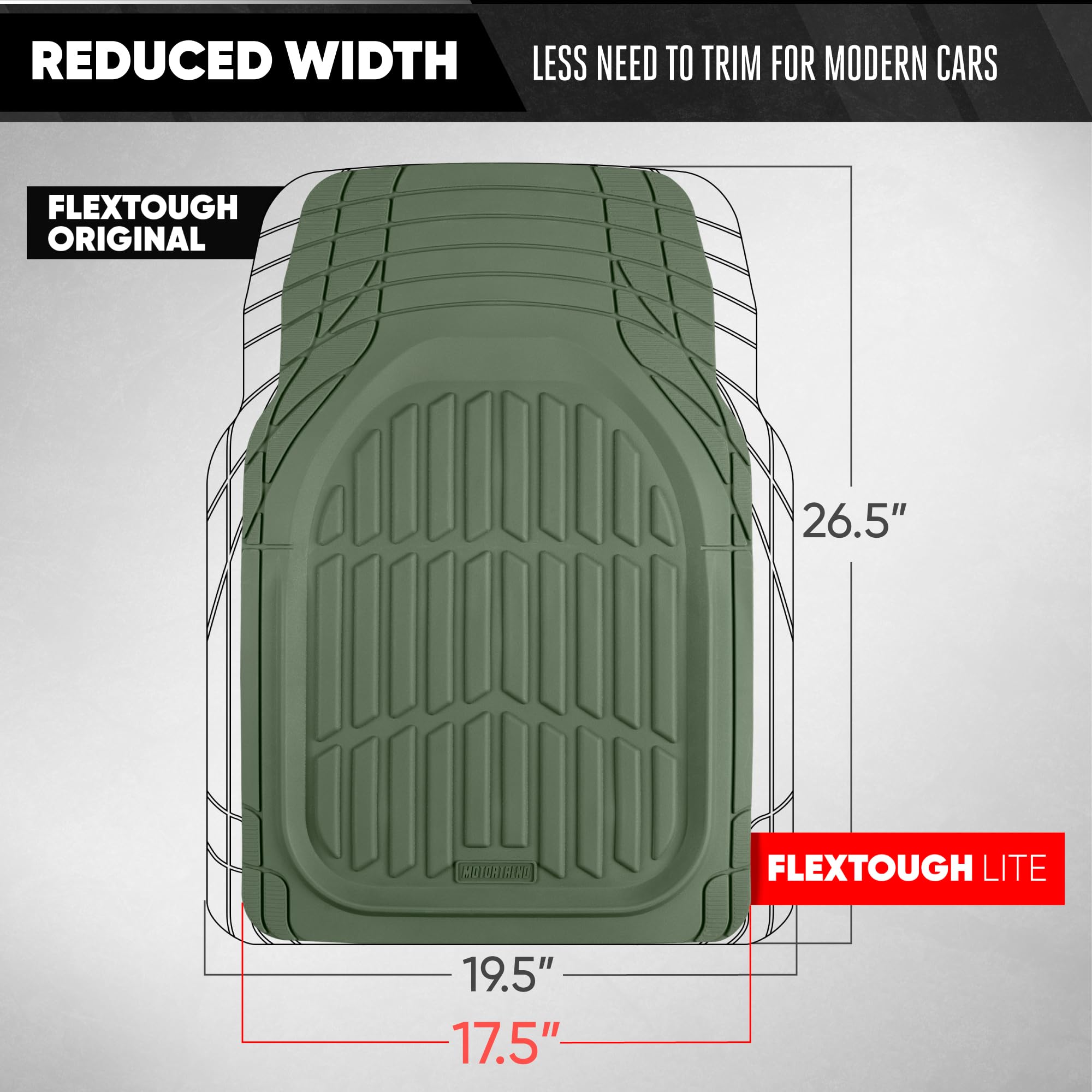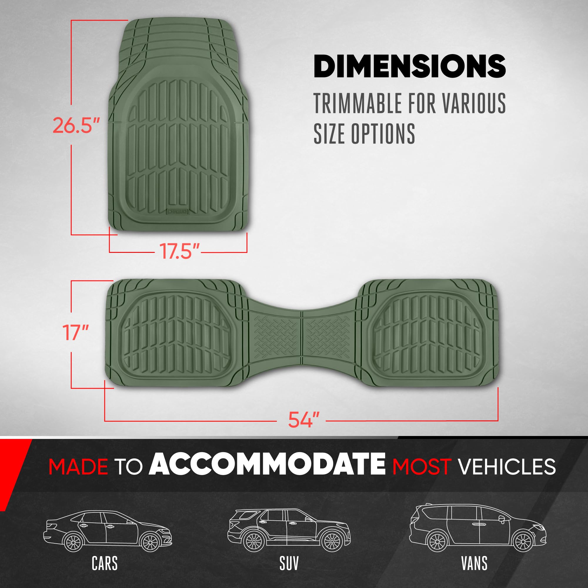 UNIVERSAL TRIM-TO-FIT CAR FLOOR MATS – Motor Trends FlexTough series is designed to fit most cars, trucks, SUVs, and vans. Easily cut for a custom fit that hugs your vehicle’s interior while delivering full front and rear floor coverage. Dimensions: Fronts (26.5x17.5) Rear (14x54)