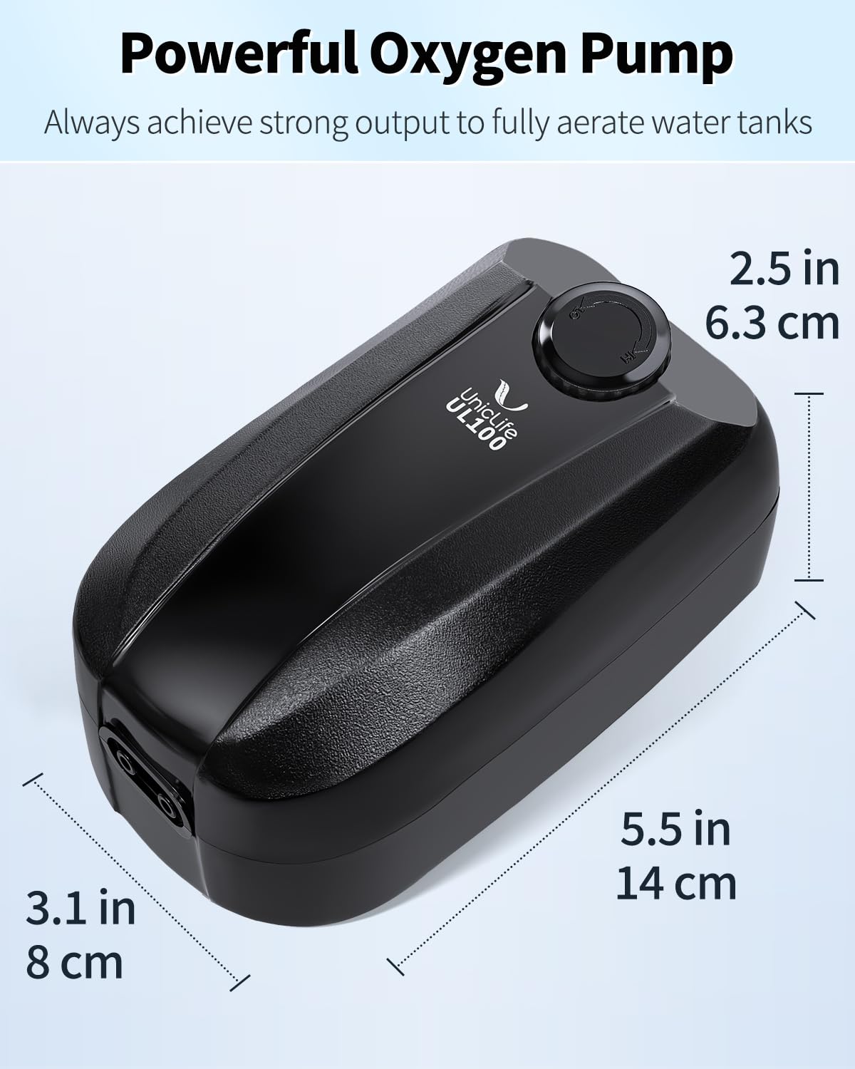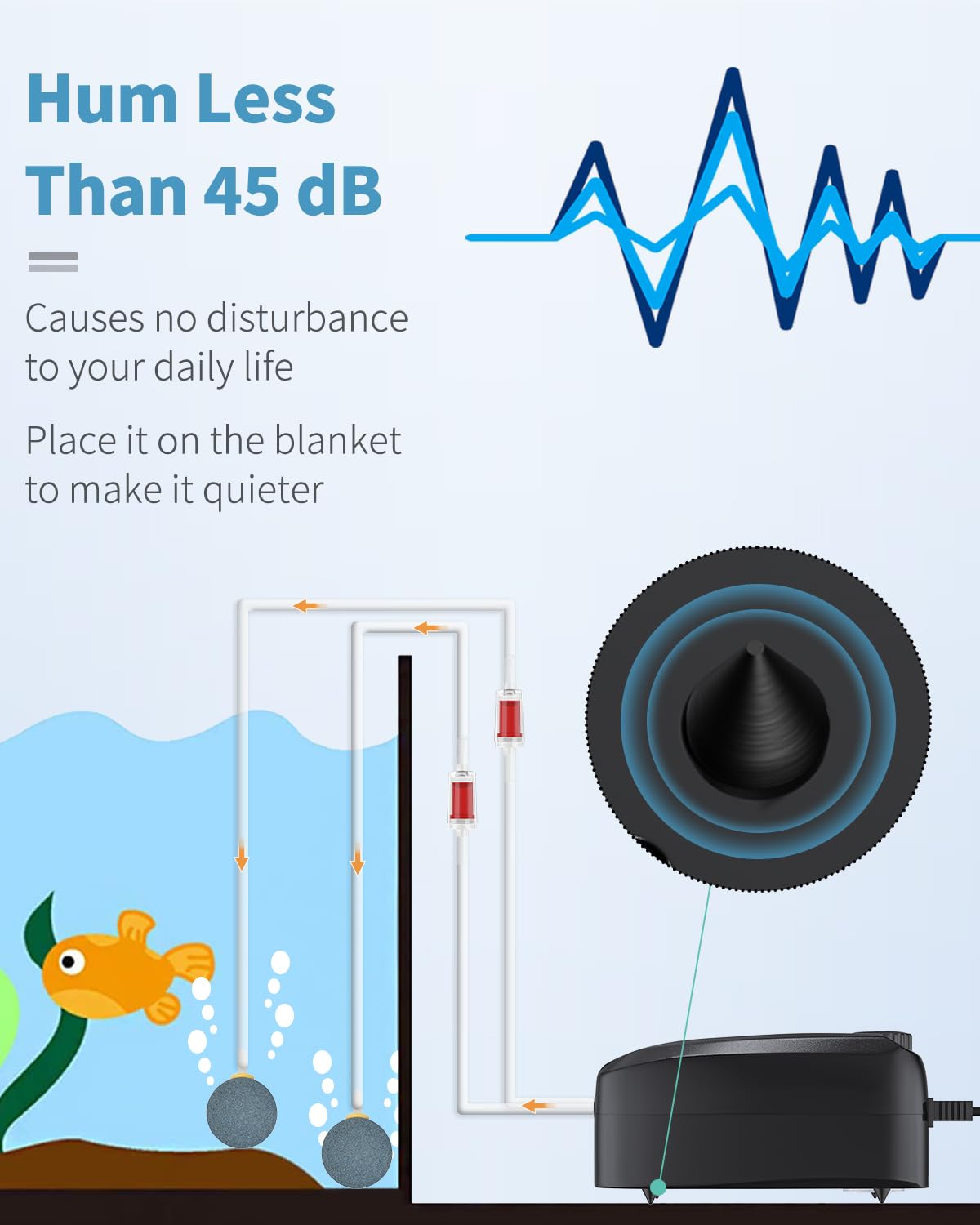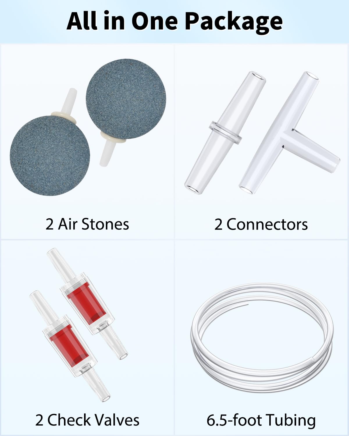 Pump Accessories: Include 2 air stones, 6.5-foot airline tubing, 2 check valves and 2 connectors. Complete accessories to build the basic aeration setup in your fish tank.